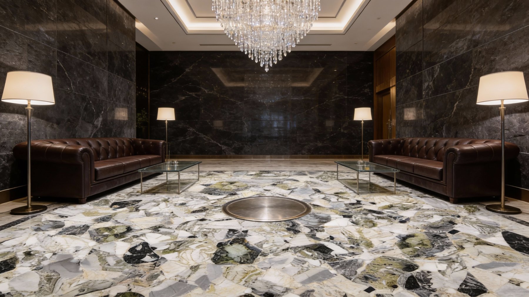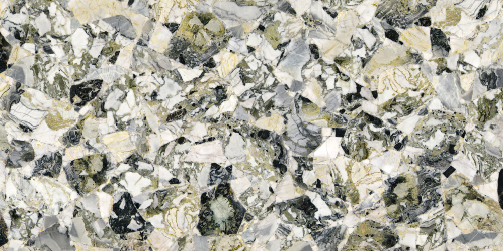 呈现**不规则碎斑交织状**,深灰、墨黑、淡黄绿及浅灰等多种色块以随机散落的方式分布:块面大小错落(小至细颗粒、大至拇指盖般的碎块),形态无规则,无明显方向性,如同天然石材碎料自然聚合,既带有“碎石拼缀”的原始肌理感,又因色块的交织形成丰富的层次感,随性却不杂乱。