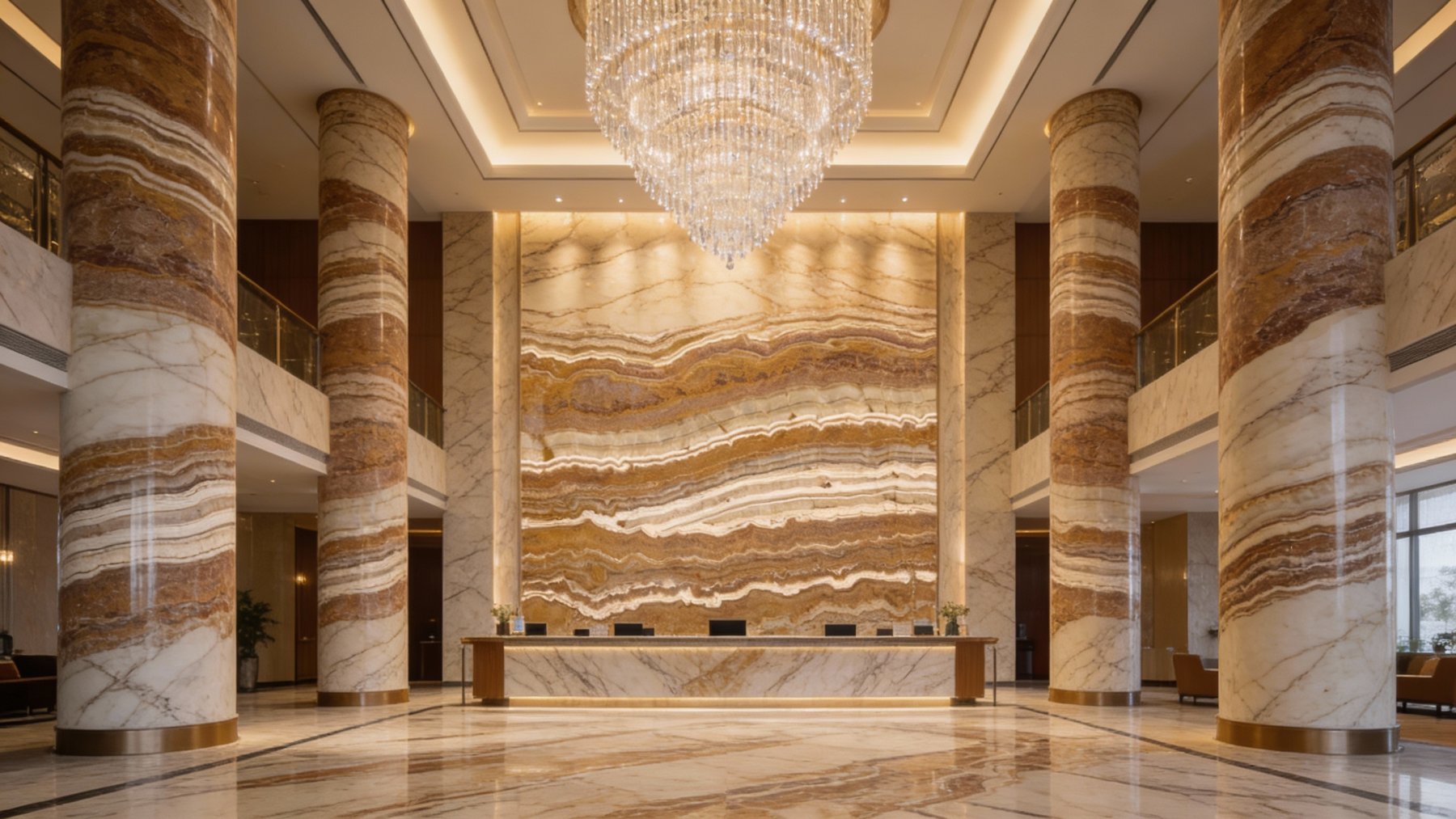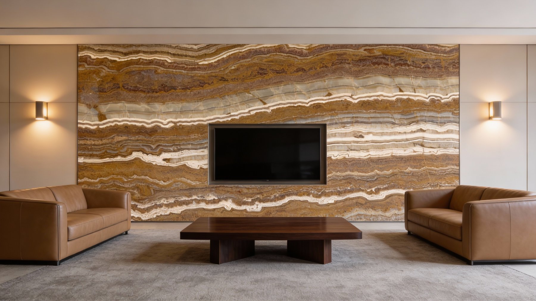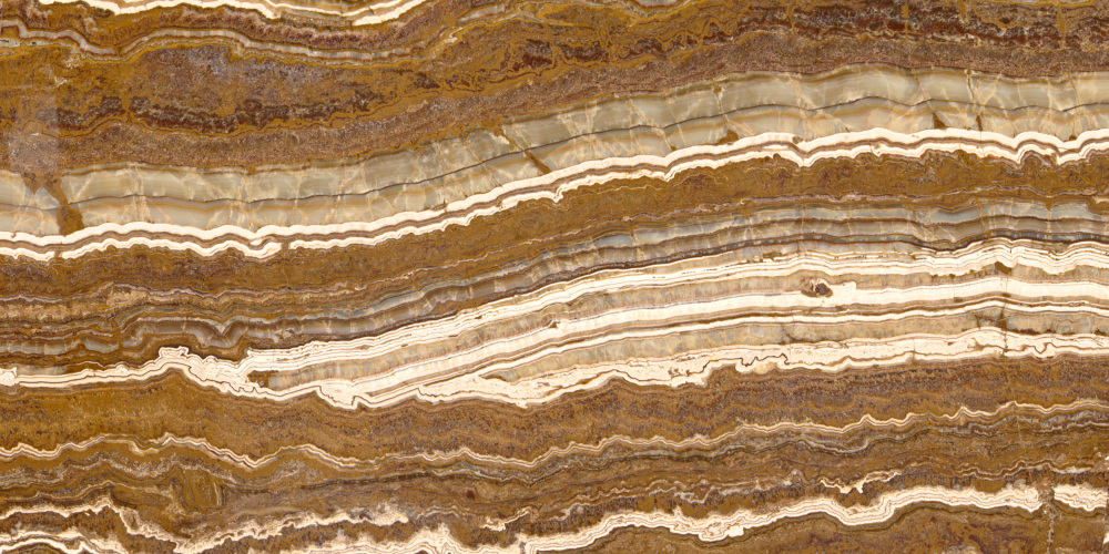 表面经抛光处理后光滑细腻,泛着温润内敛的光泽,触感应如玉石般顺滑;条纹边缘过渡自然,部分区域可见细微的色彩晕染(如深棕向浅黄渐变),无绝对锐利的边界,增添了柔和度;浅色条纹隐约透出通透感,深色条纹则显浓郁醇厚,细节处既有石材的坚实质感,又因色彩过渡的细腻性,兼具玉石般的温润灵动,整体质感高级且富有生命力。