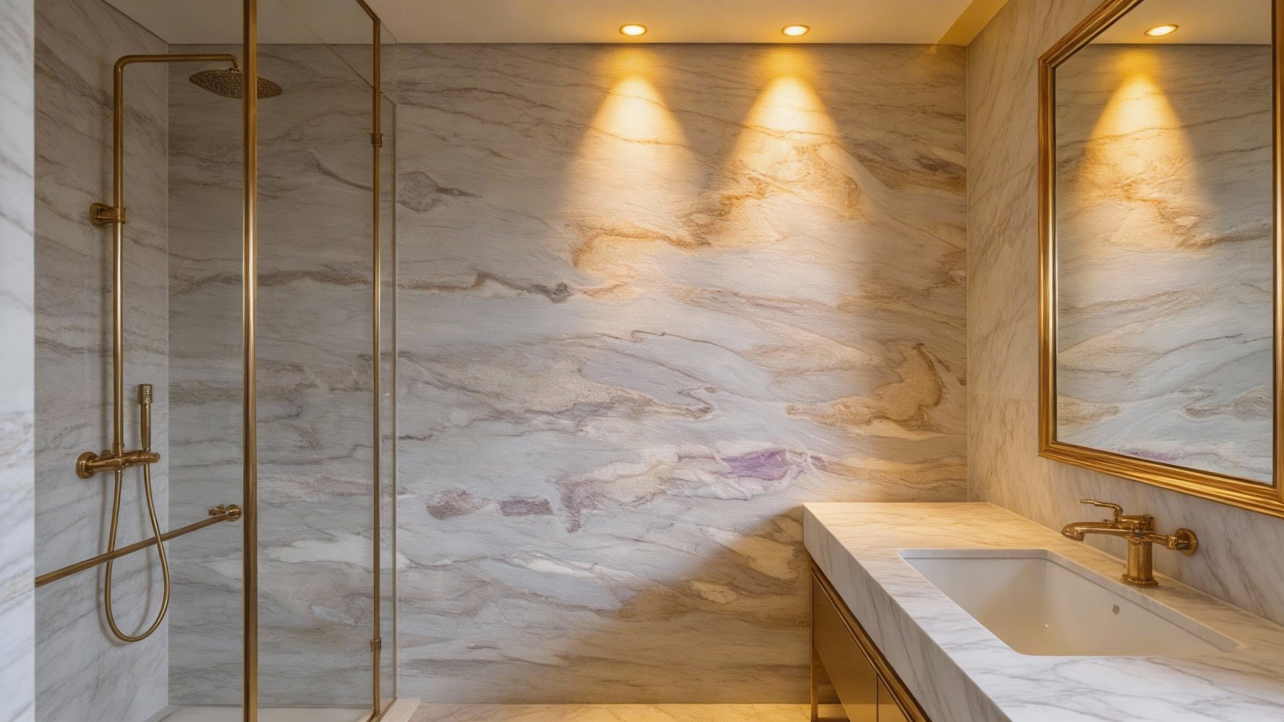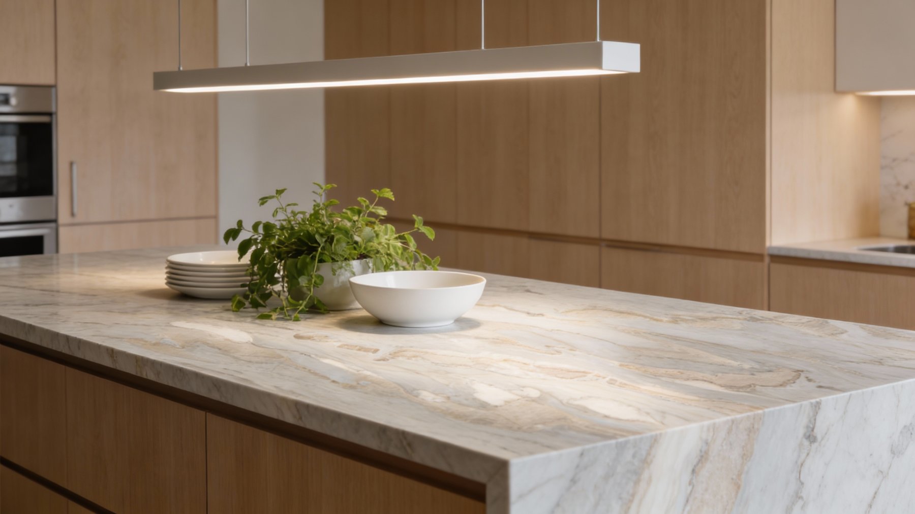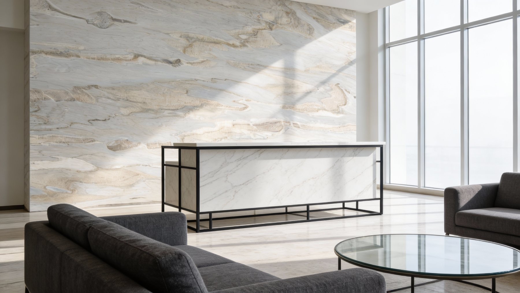 石材表面质感**细腻温润**,触感应是平滑顺滑的,带有柔和的哑光或半哑光光泽(非刺眼高光)。纹理细节处可见色彩的自然交融与渐变过渡:如浅灰与米白的柔和晕染、微蓝调与浅褐纹的微妙交织,局部区域带有细微的天然肌理起伏,既保留了石材的原生质感,又兼具细腻雅致的视觉体验,整体质感温润如玉,精致而富有亲和力。
