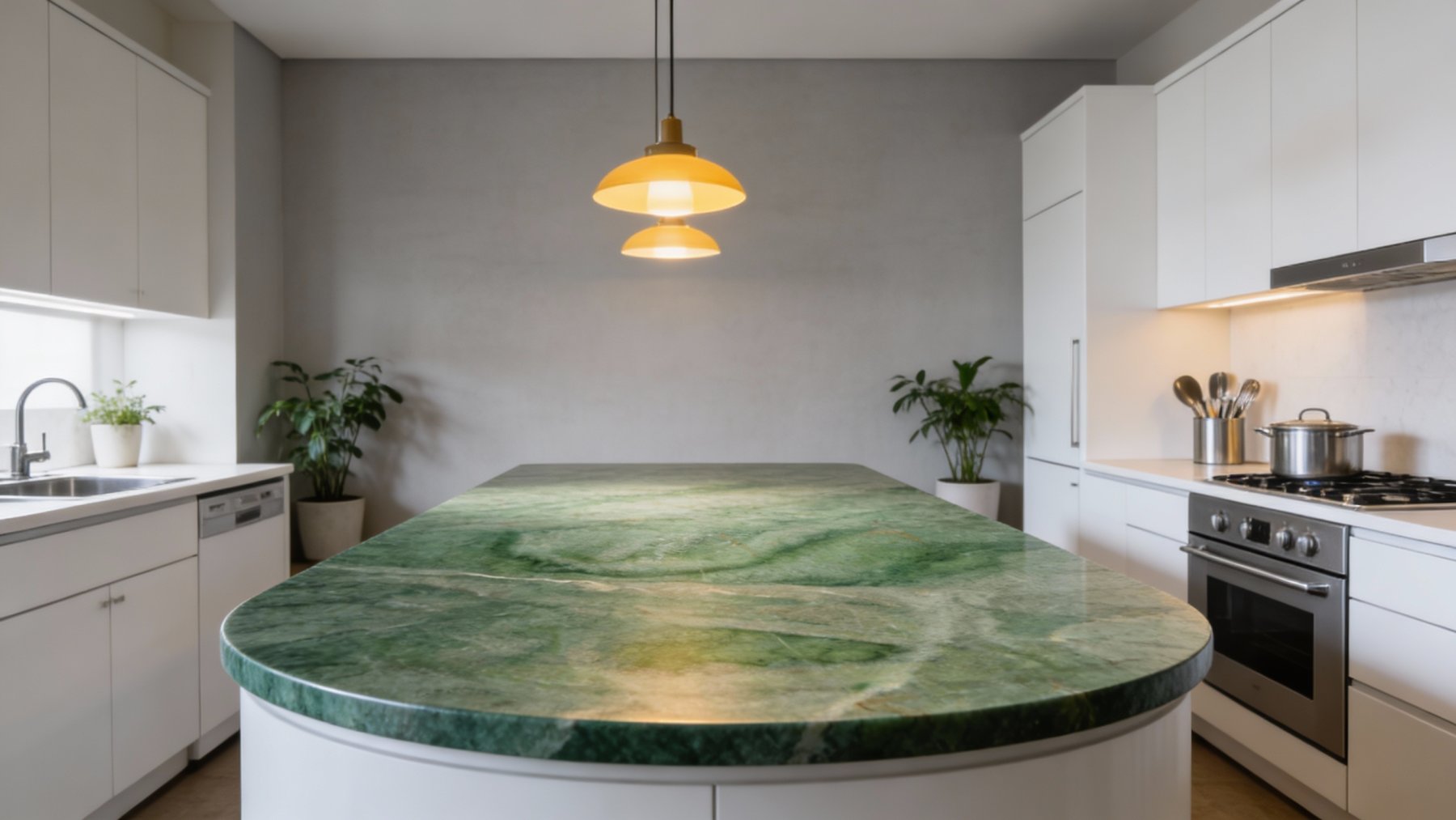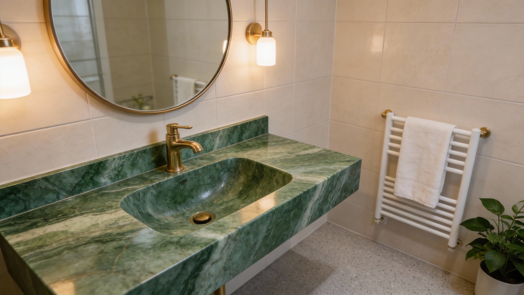 这款石材以**多层次的绿色系**为主基调,巧妙融合了墨绿的沉稳、翠绿的鲜活与浅绿的清透,整体色调温润雅致,如林间幽潭般散发着自然生机,既无单一绿色的单调,也无色彩冲突的杂乱,给人静谧清新的视觉沉浸感。