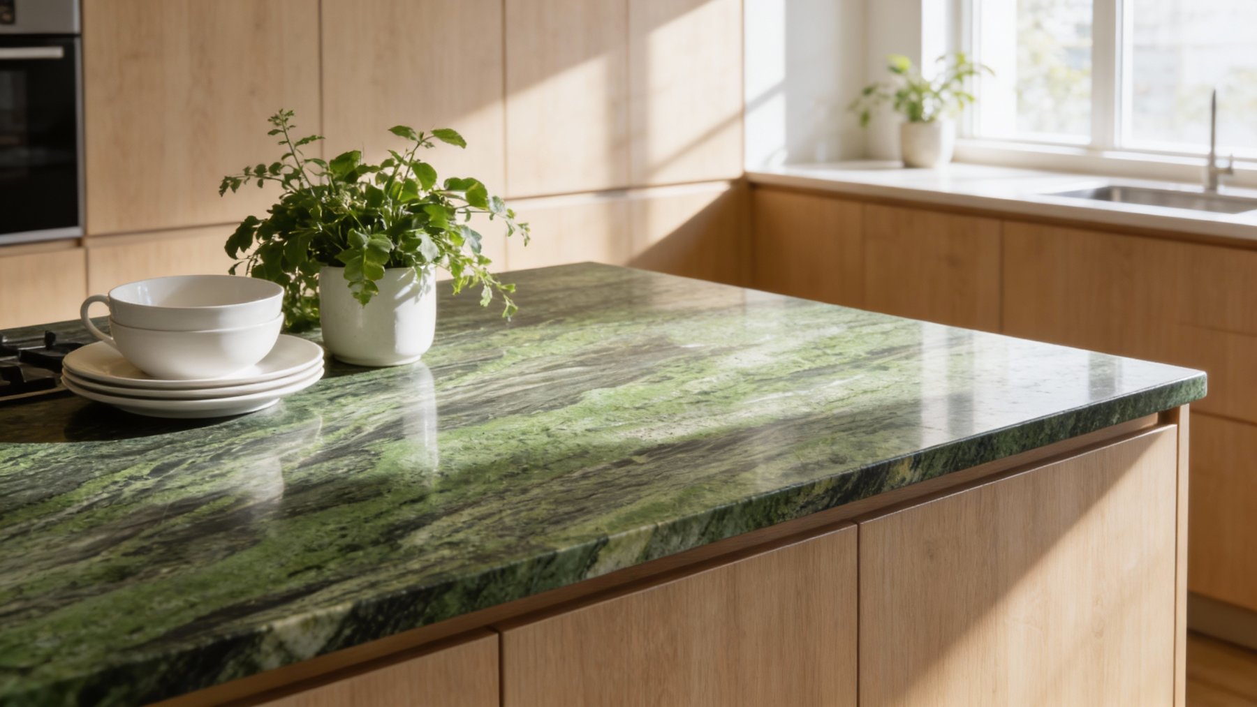 纹理呈现**层状流动的波浪条纹**,仿佛地质运动中岩层挤压形成的自然轨迹。墨绿色与墨黑色的纹路相互缠绕、舒展,线条粗细交错:粗纹如宽幅的绿色缎带,横跨石材表面;细纹似墨色丝线,穿插于绿调之间。整体纹理连贯且富有韵律,无生硬断裂,展现出“流动的地质记忆”感,既规律又不刻板,充满自然的动态美。