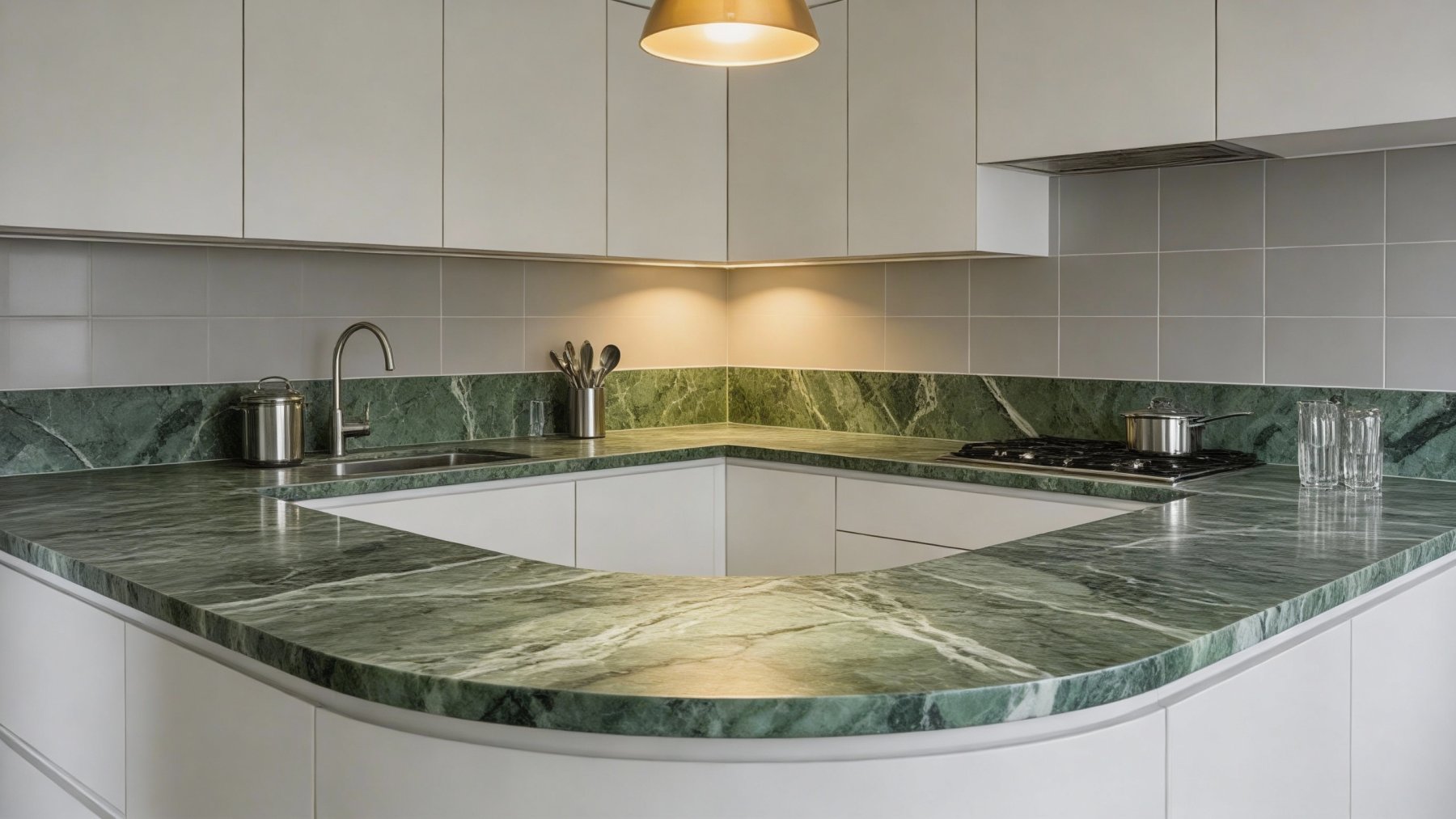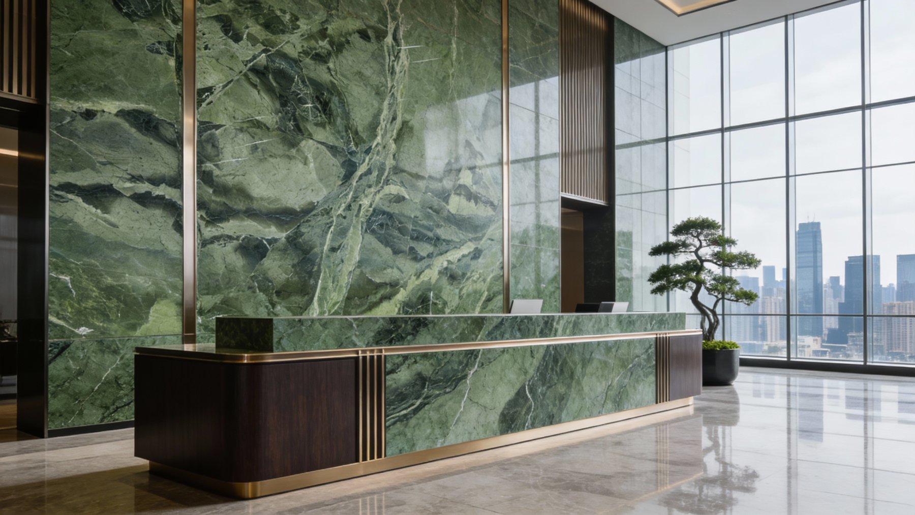 石材底色以柔和的灰绿色为主调,深浅不一的墨绿色与青绿色斑块自然晕染交织,奠定了沉稳而清新的自然绿意基底。色调过渡细腻,无生硬割裂感,整体呈现出一种介于静谧与生机之间的平衡,既保留了天然石材的厚重感,又透出一丝清雅的气息。