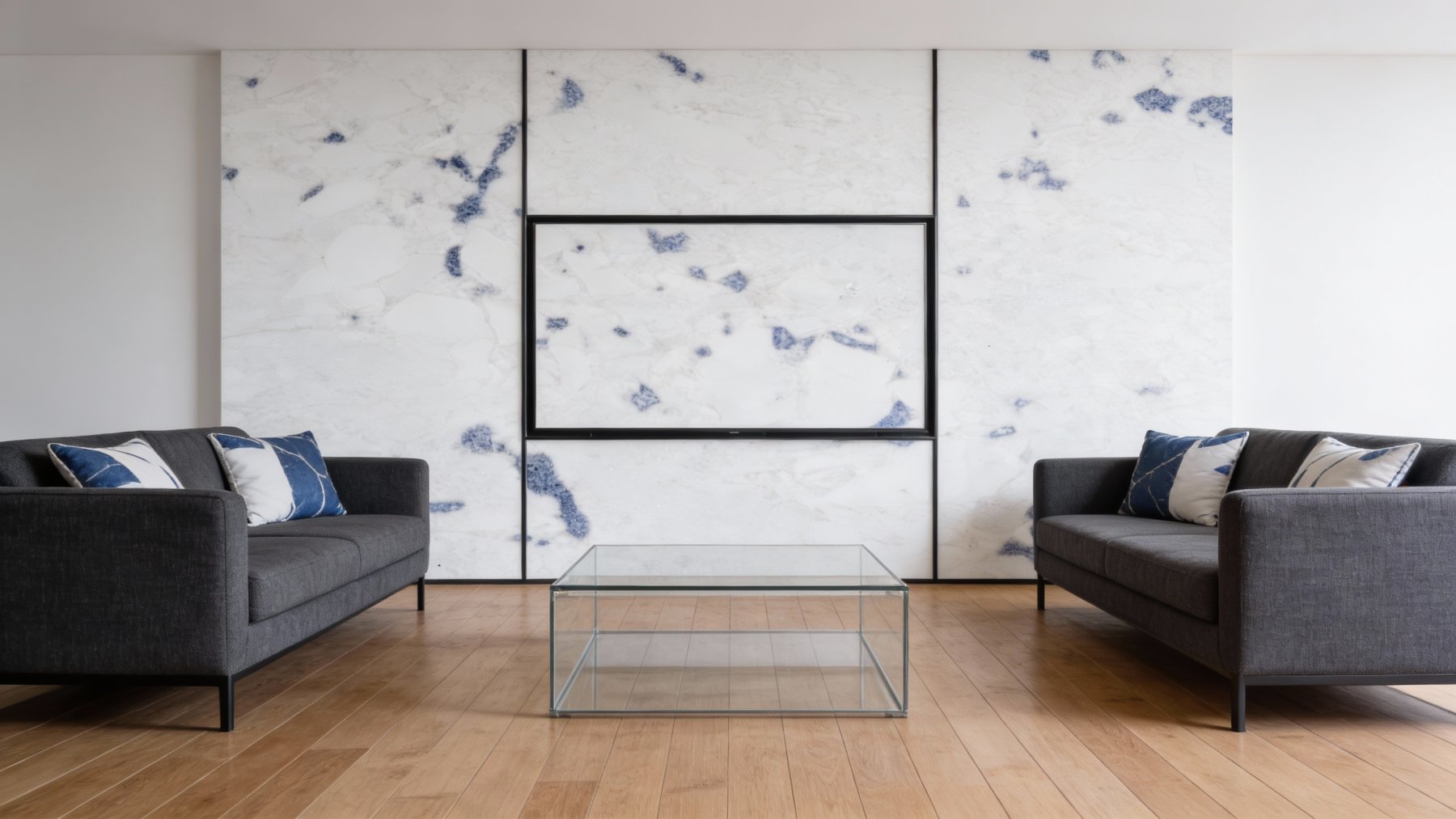 外观:以纯净的白色 / 浅灰白色为底色,点缀不规则的蓝灰色(类似淡墨晕染)纹理,纹路稀疏且形态自然,整体风格清新雅致,带点 “水墨感”。