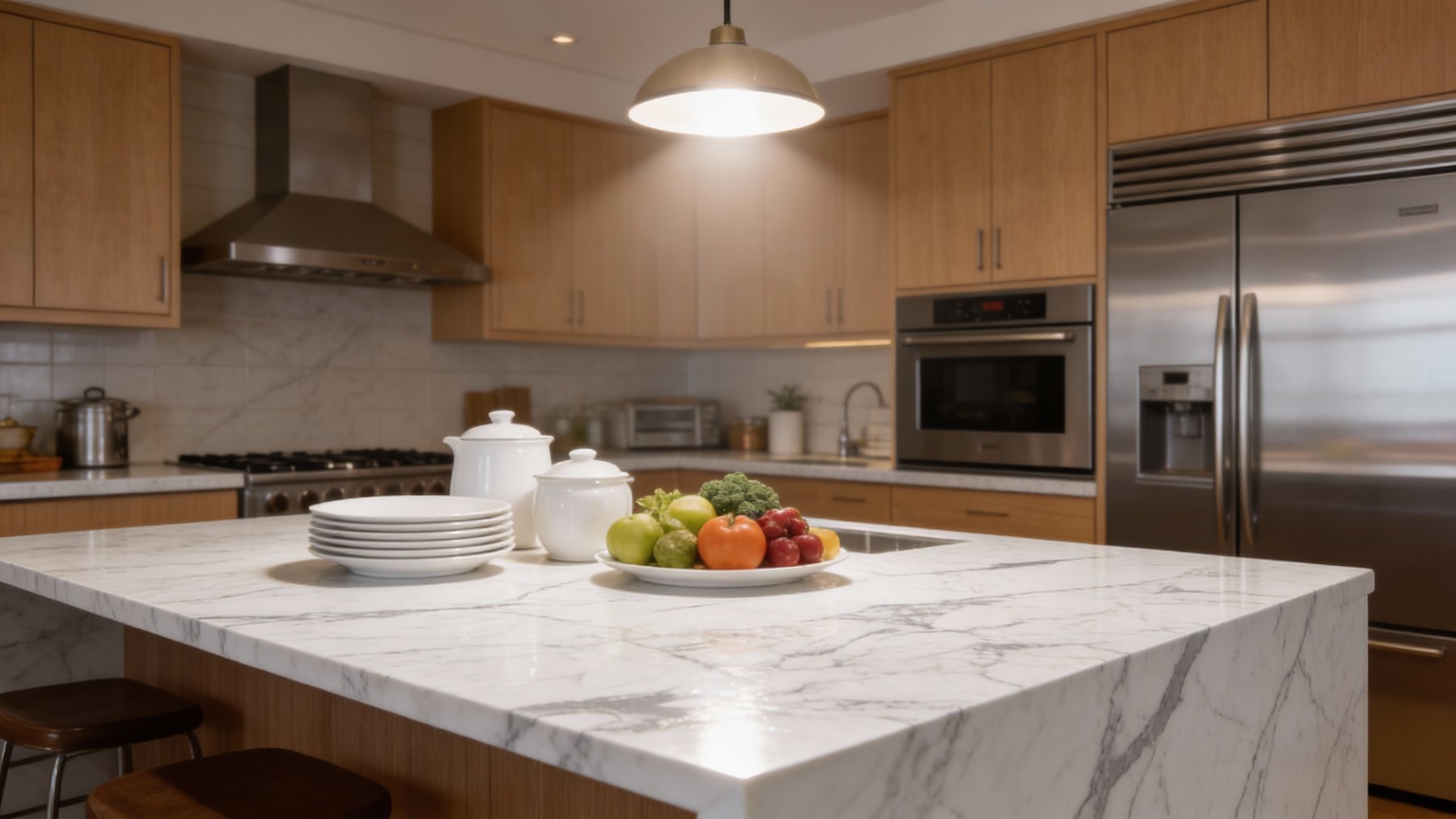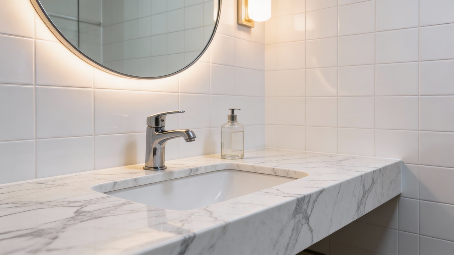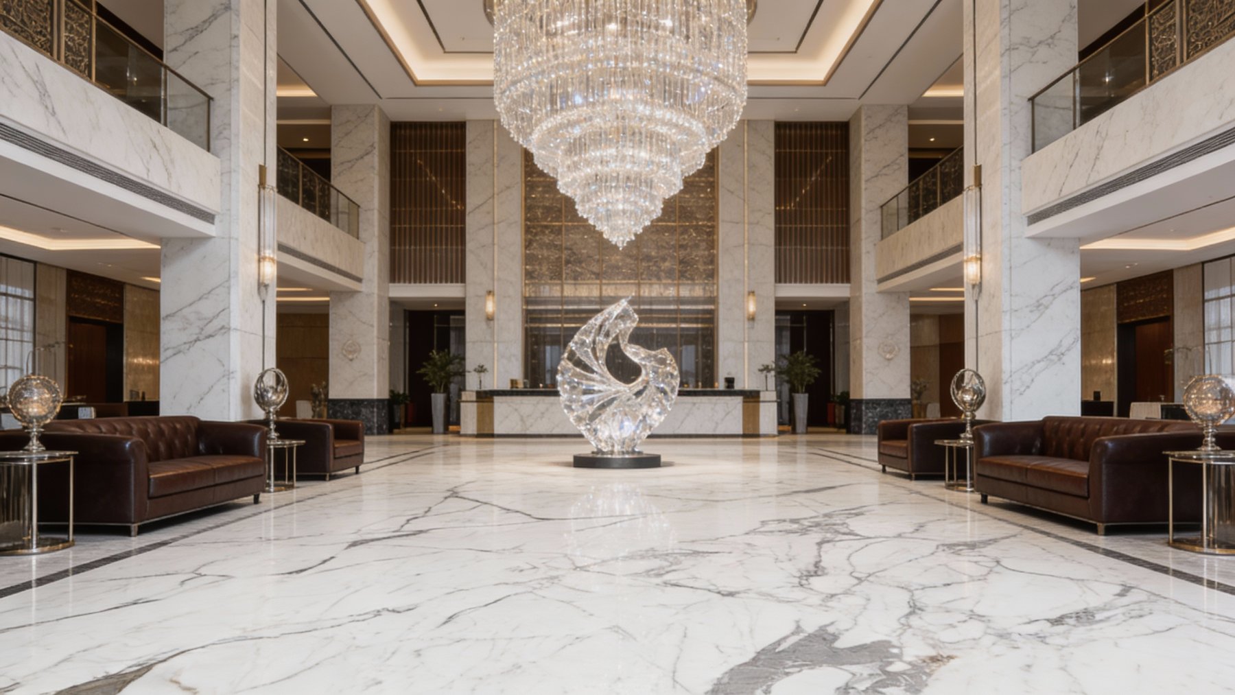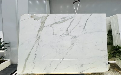 石材底色以**纯净亮白为主调**,间杂极淡的暖白基底自然过渡,整体色调清透干净,如初雪般澄澈雅致。无多余杂色干扰,奠定了简洁明亮、高级大气的视觉基底,适配各类简约或轻奢风格空间。