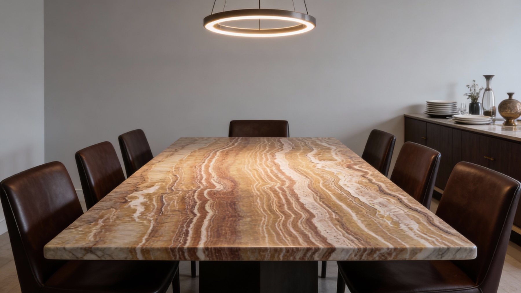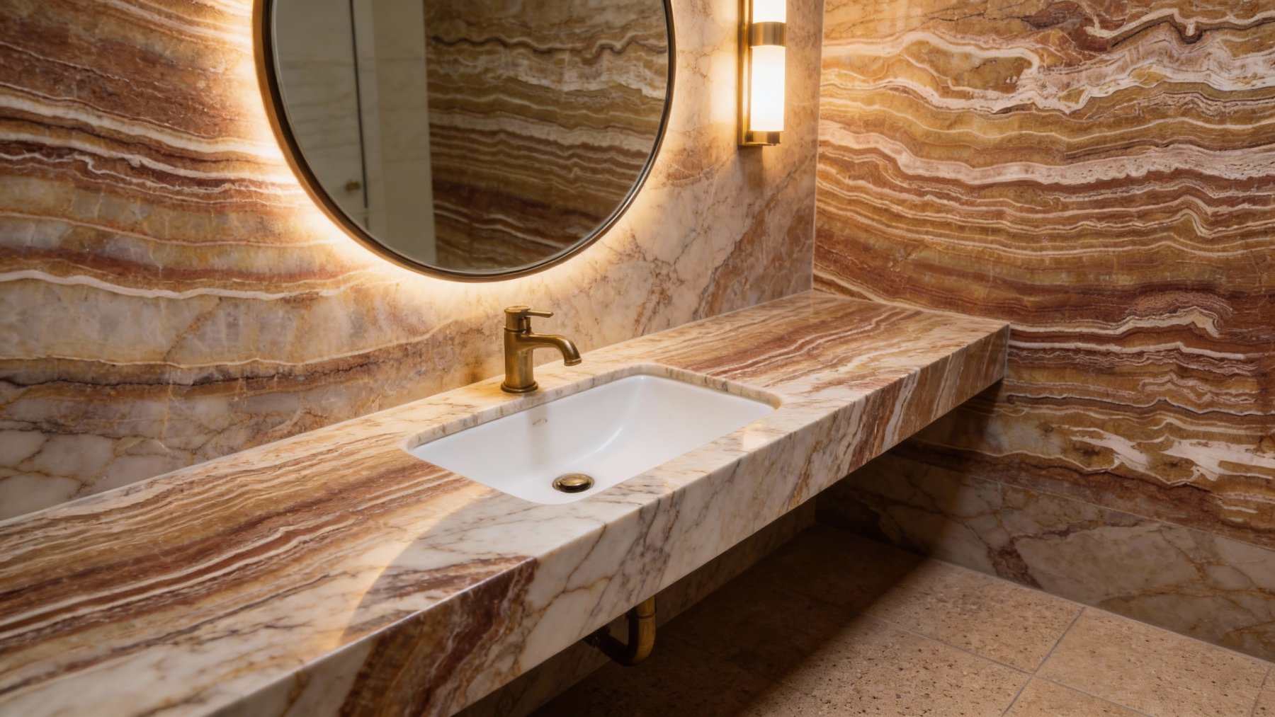 石材表面**细腻温润,兼具光滑与层次**:整体触感平滑如镜,却因纹理的微妙起伏折射出丰富的光泽变化;条纹间的色彩过渡自然柔和,无生硬边界——米白色条纹略带通透感,似玉石般莹润;棕褐色部分则质地密实,带着石材的坚实厚重。视觉上,纹理的深浅交错形成立体纵深感,既保留了石材的坚硬质感,又透出玉石般的温润光泽,细腻中藏着自然的粗犷张力。