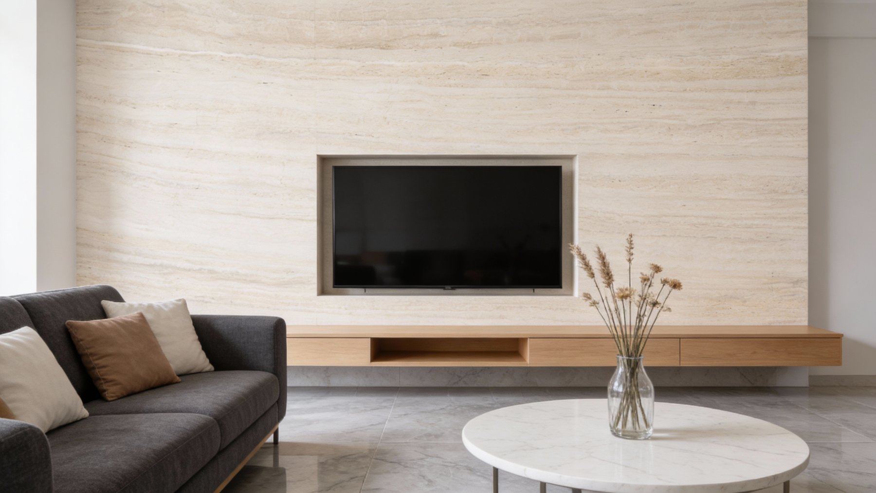 表面质感细腻温润,触感应是平滑中带着天然石材特有的细微颗粒感,并非高度抛光的镜面效果,而是保留了自然的肌理温度;条纹之间的色彩过渡柔和,无明显边界,整体质感雅致内敛——既有天然石材的质朴厚重感,又不失精致细腻的格调,视觉上给人一种低调轻奢的高级感,适合营造温馨、雅致或简约的空间氛围。