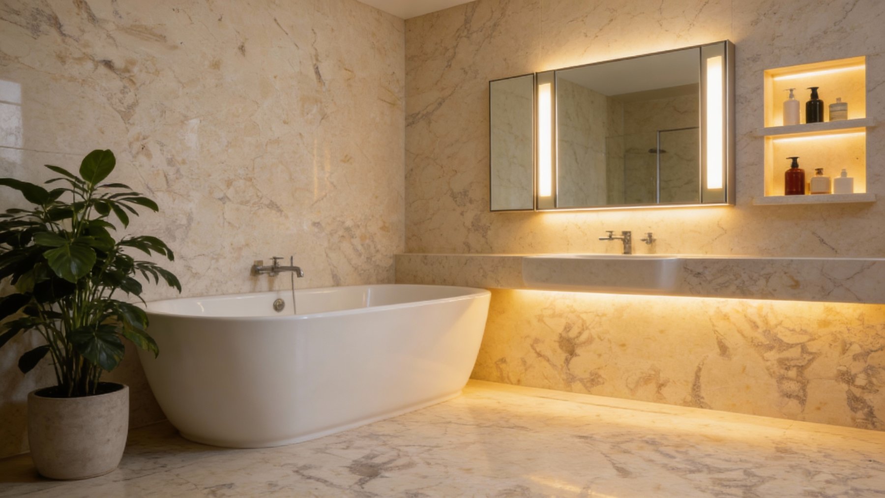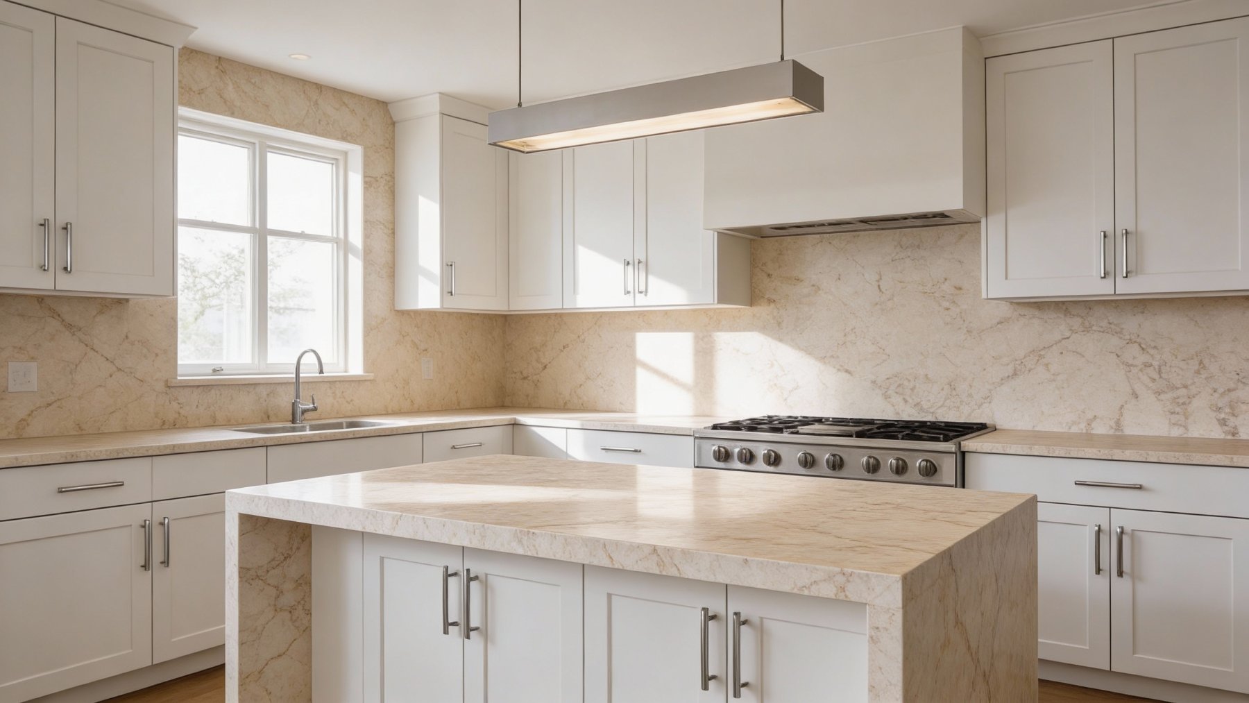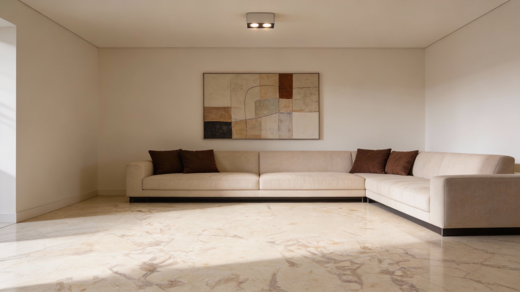 这款石材的底色以**暖调米白色**为主,整体基调柔和温润。浅淡的米白中隐约透出一丝暖黄调,既保留了浅色石材的明亮感,又因暖调注入而避免了冷寂,营造出温馨雅致、亲和舒适的视觉氛围。
