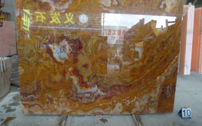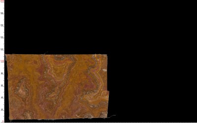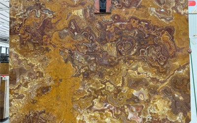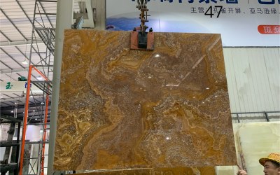 纹理呈自然流动的蜿蜒脉络状,如同山水写意般的不规则线条交错缠绕。既有大面积的色块渐变衔接(如深棕与浅橙的柔和过渡),也有细密的深浅线条穿梭交织,局部点缀浅灰白或淡褐色的斑驳纹理斑块。整体纹路无规则却富有韵律感,似地质运动留下的自然轨迹,层次丰富且充满动态张力,兼具山水的写意感与石材的粗犷感。