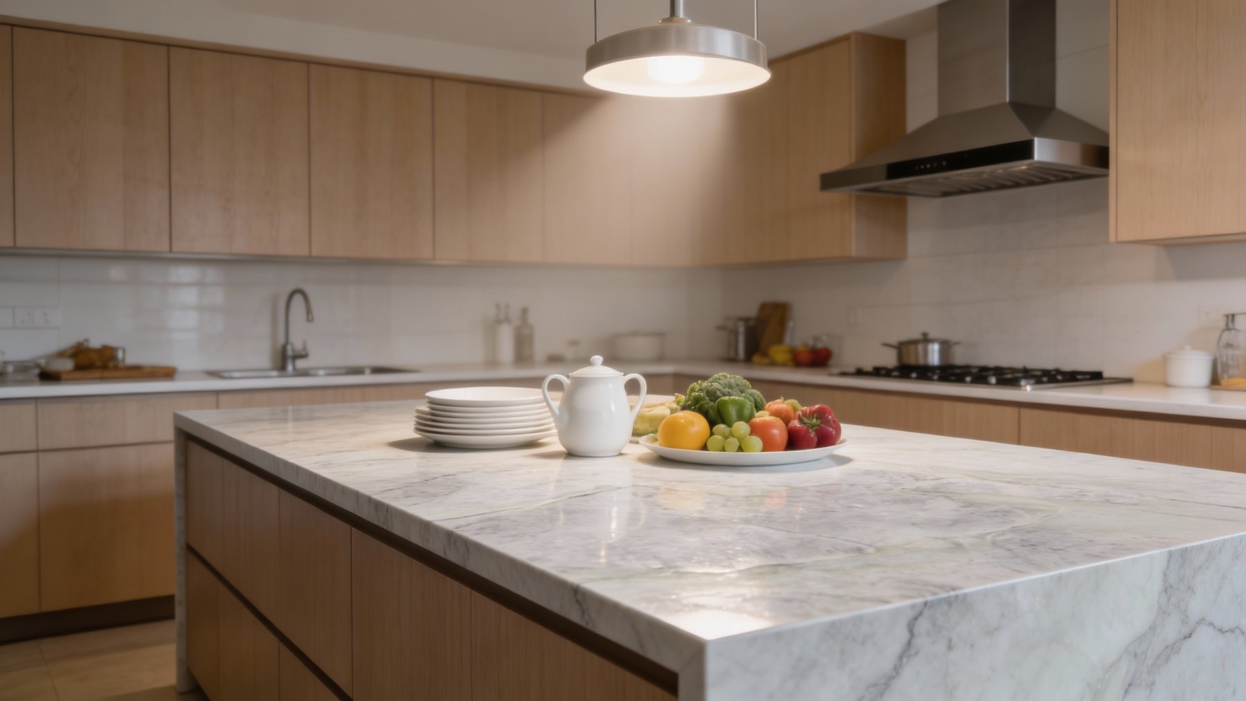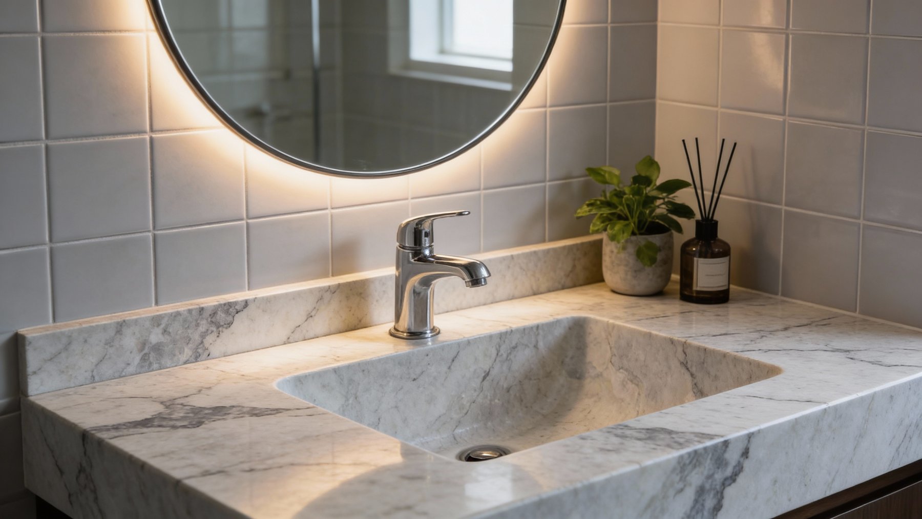 表面质感细腻温润,带有柔和的哑光或柔光光泽,触感应平滑顺滑;纹理细节处可见细微的色彩渐变与肌理起伏,既保留了石材天然的质感肌理,又兼具雅致的视觉细腻度,整体给人洁净通透、高级内敛的观感与触感。