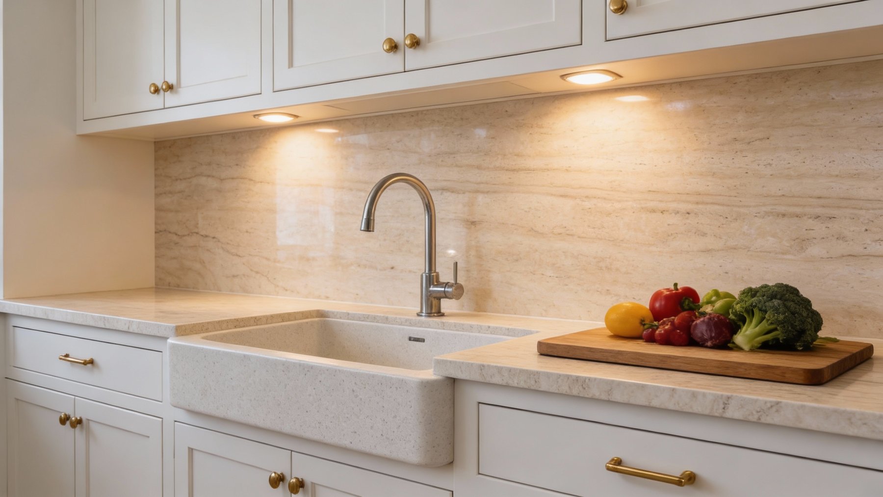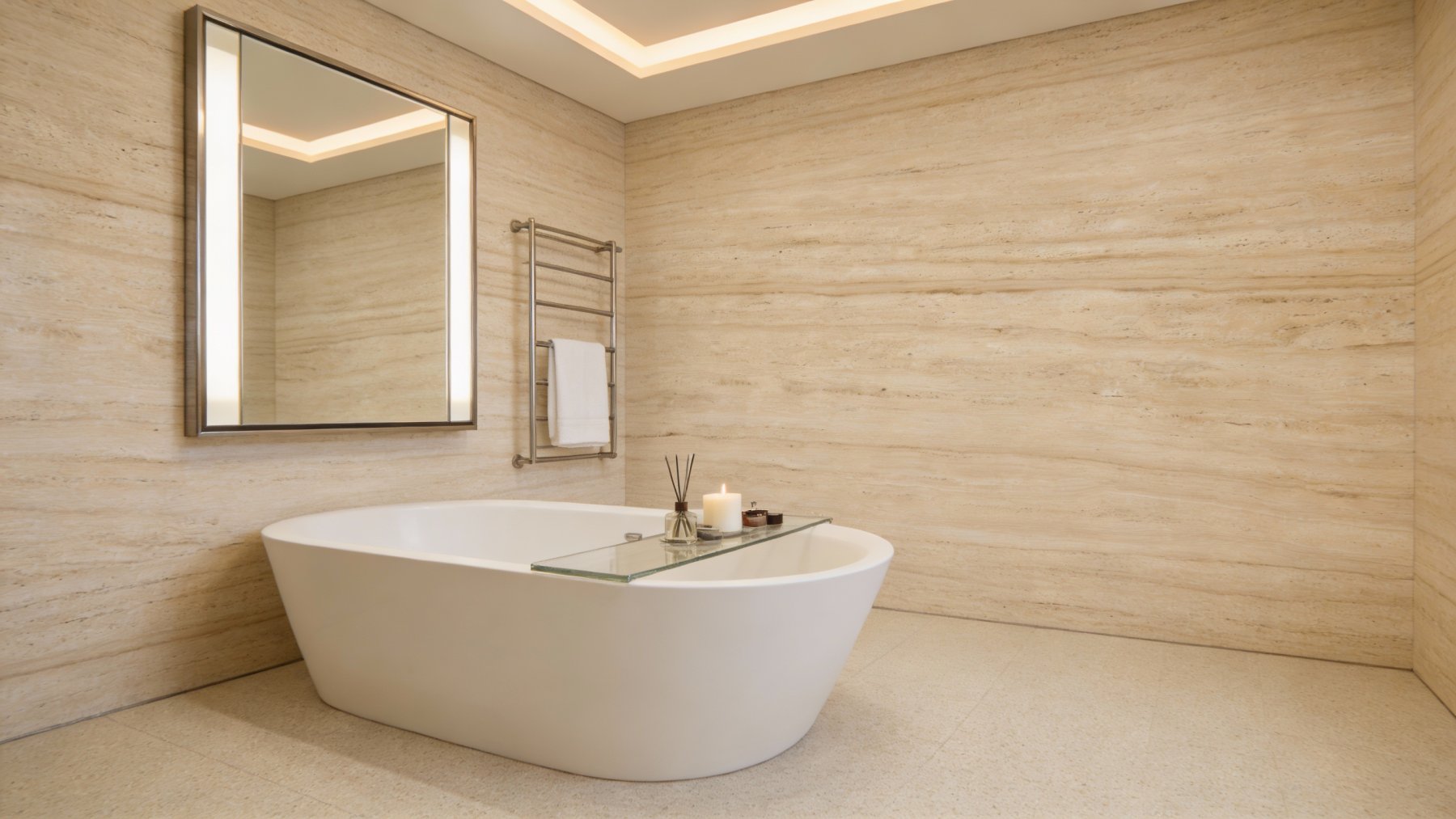 表面质感**细腻温润**,带有天然石材特有的哑光质感与细微颗粒肌理,触感应是平滑且略带温润的。纹理间隙中点缀着零星细小的深色矿物斑点,为简洁的肌理增添了自然的丰富度,避免了单调感;整体质感低调内敛,无强烈反光,却在细节处彰显出天然石材的质朴高级感,兼具视觉舒适度与触感亲和力。