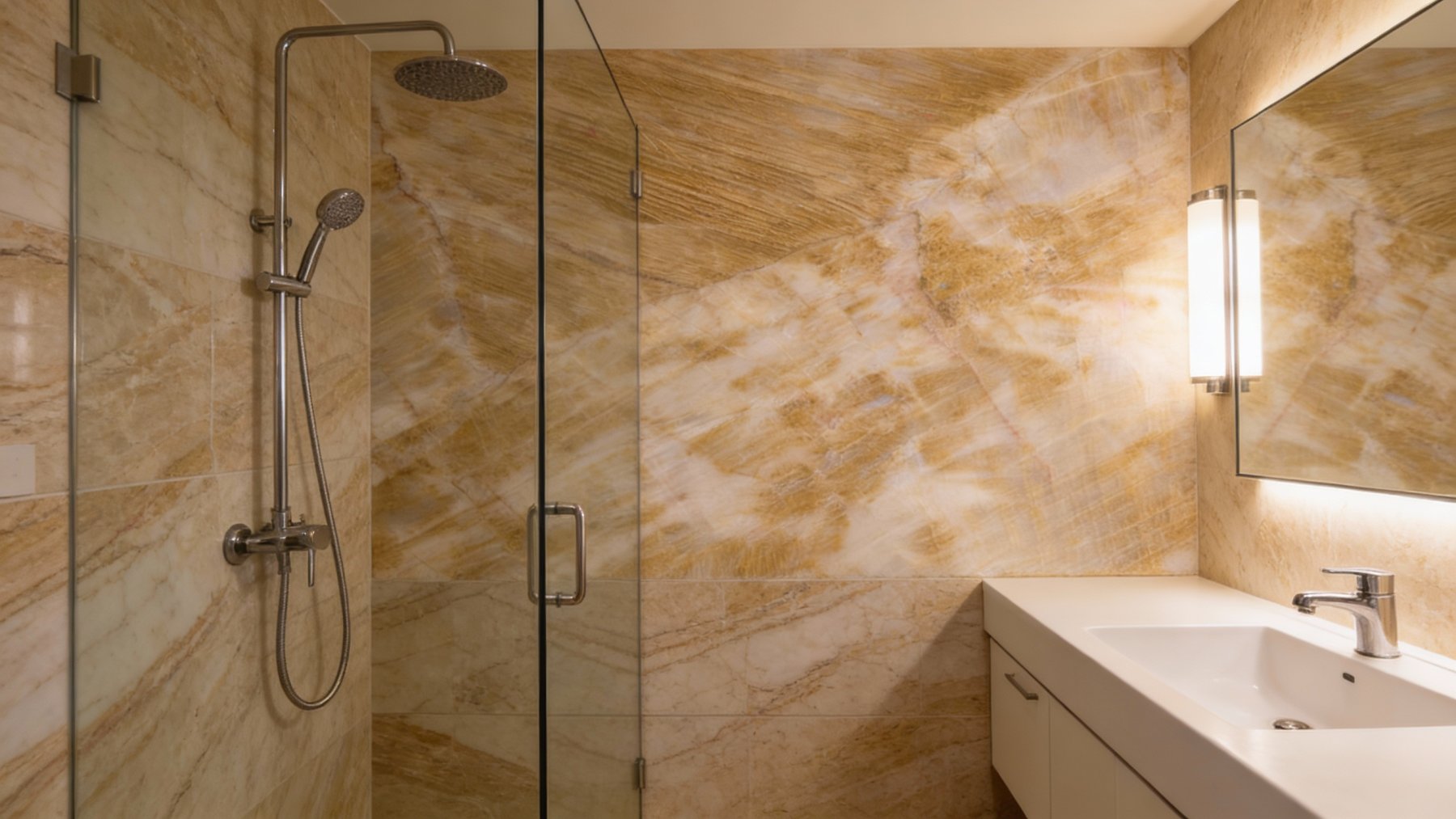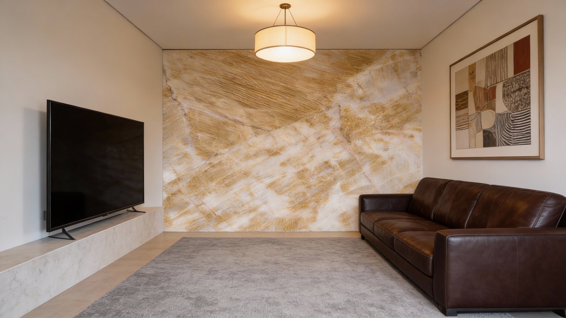 以温暖的金黄色为主基调,交织着浅米白与淡奶油色的过渡晕染,整体色调柔和且富有层次感。如同阳光浸透天然石材的自然暖意,既保留了石材的质朴厚重,又因暖调基底传递出温馨雅致的氛围,适配性强且视觉舒适。