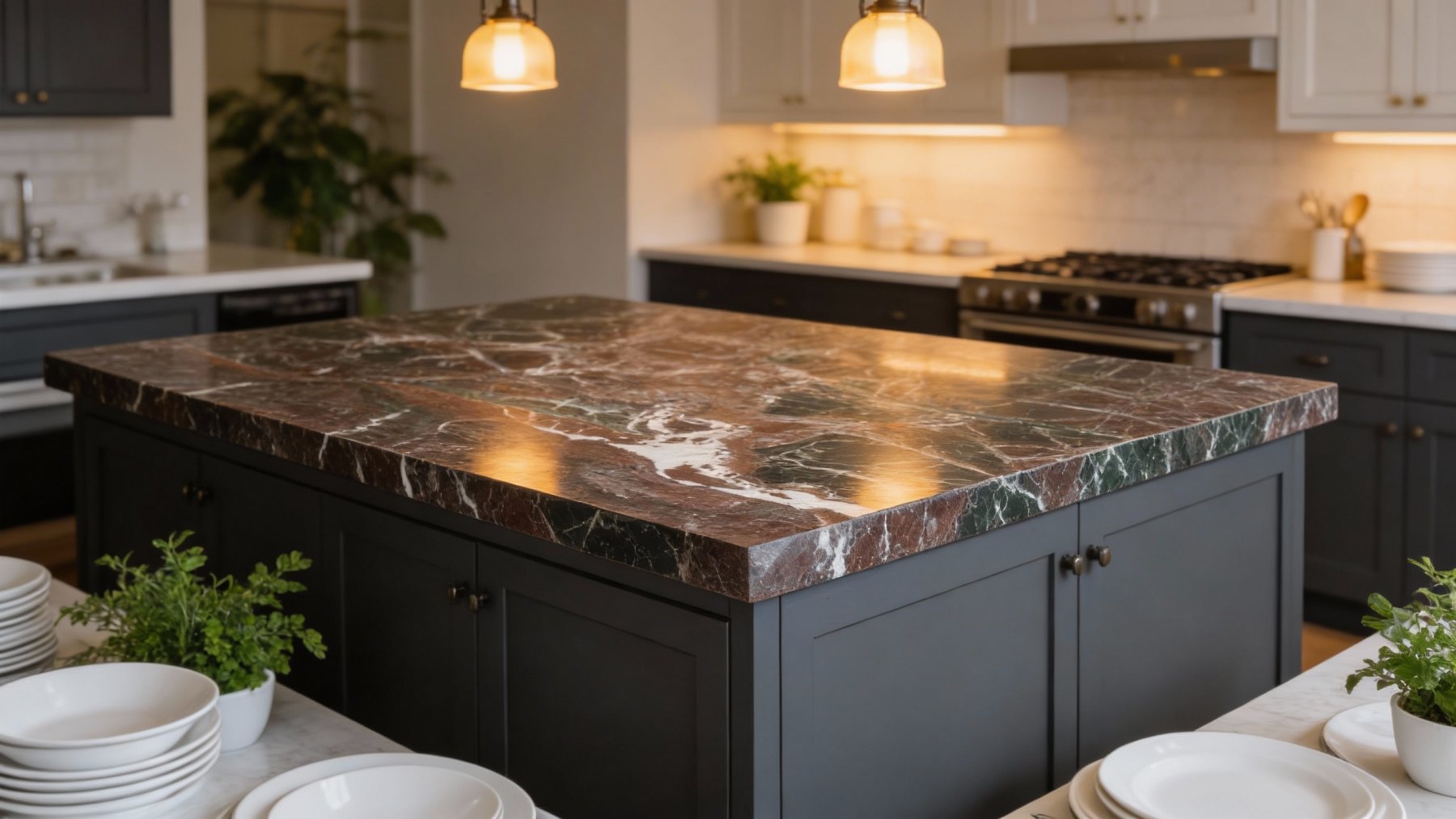 石材表面兼具**细腻光泽与致密质感**:触感应是光滑温润的,光线下能折射出柔和的石材质感;白色纹理部分通透如晶,仿佛嵌入石材的天然晶簇,在光线下会透出细腻亮泽;红棕与黑色区域质地密实厚重,墨绿色条纹则质感内敛,与周围肌理自然融合。每一处纹理的转折、色彩的衔接都彰显天然石材的独特性——既有精致的细节亮点,又不失整体的大气厚重感。