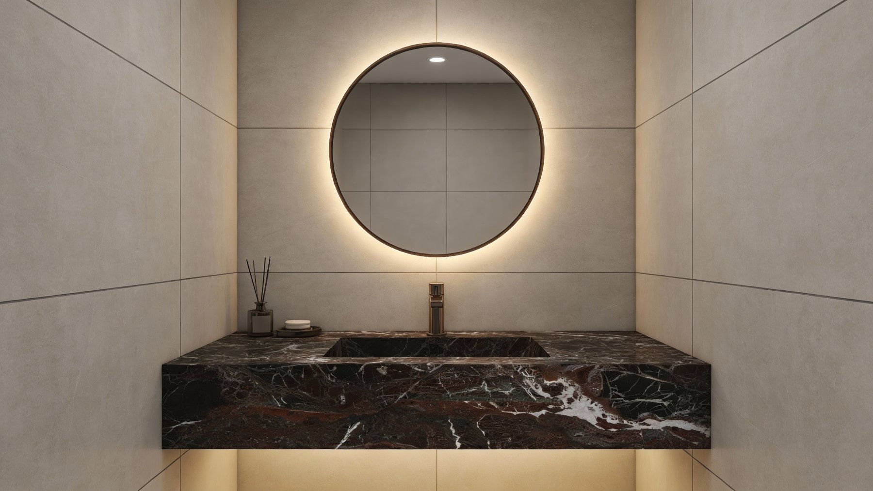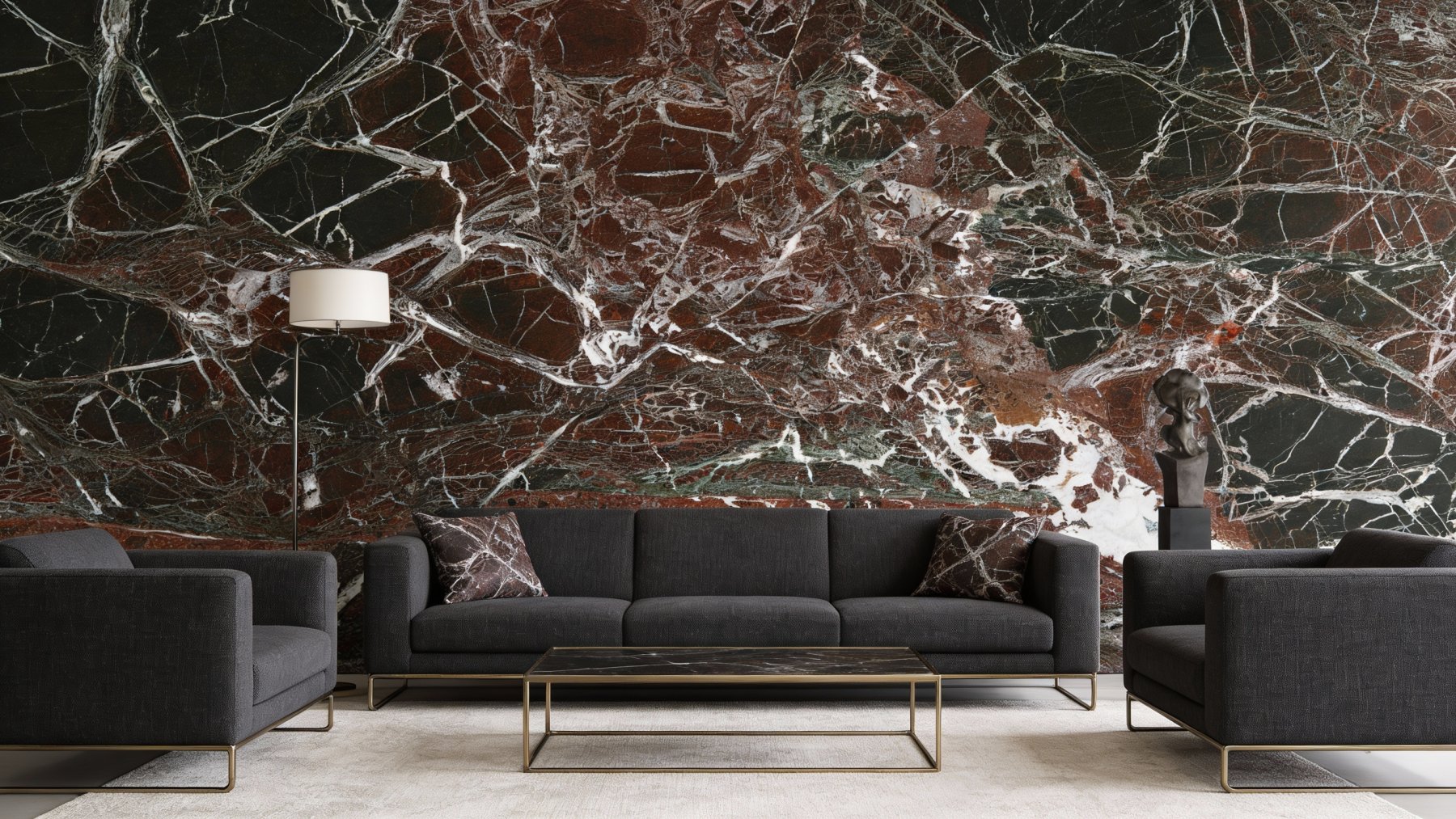 这款石材的底色基调以**浓郁深沉的红棕色**为主,间杂着近黑色的暗调区域,整体色调饱满厚重,仿佛沉淀了岁月的质感——红棕的暖调中裹挟着黑调的沉静,既显典雅复古,又带一丝深邃的神秘感,为空间奠定了沉稳大气的基调。