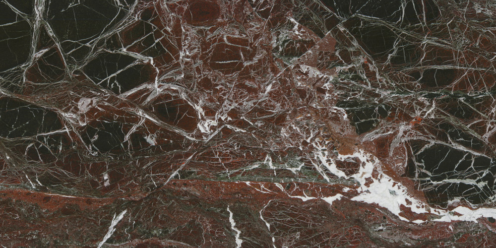 纹理呈现**复杂交织的脉络状**,极具自然张力:大面积的白色晶体纹理如同天然裂纹般肆意延展,线条粗细不一(时而纤细如丝、时而宽润如带),与红棕底色形成强烈视觉对比;同时,纹理中点缀着断续的**墨绿色条纹**,如同隐于红褐肌理中的“暗涌”,打破了单一色调的沉闷。整体纹理既随性又有层次——白色纹理的“破碎感”与绿色条纹的“断续感”交织,让石材仿佛记录了地质运动的轨迹,充满动态的自然野趣。