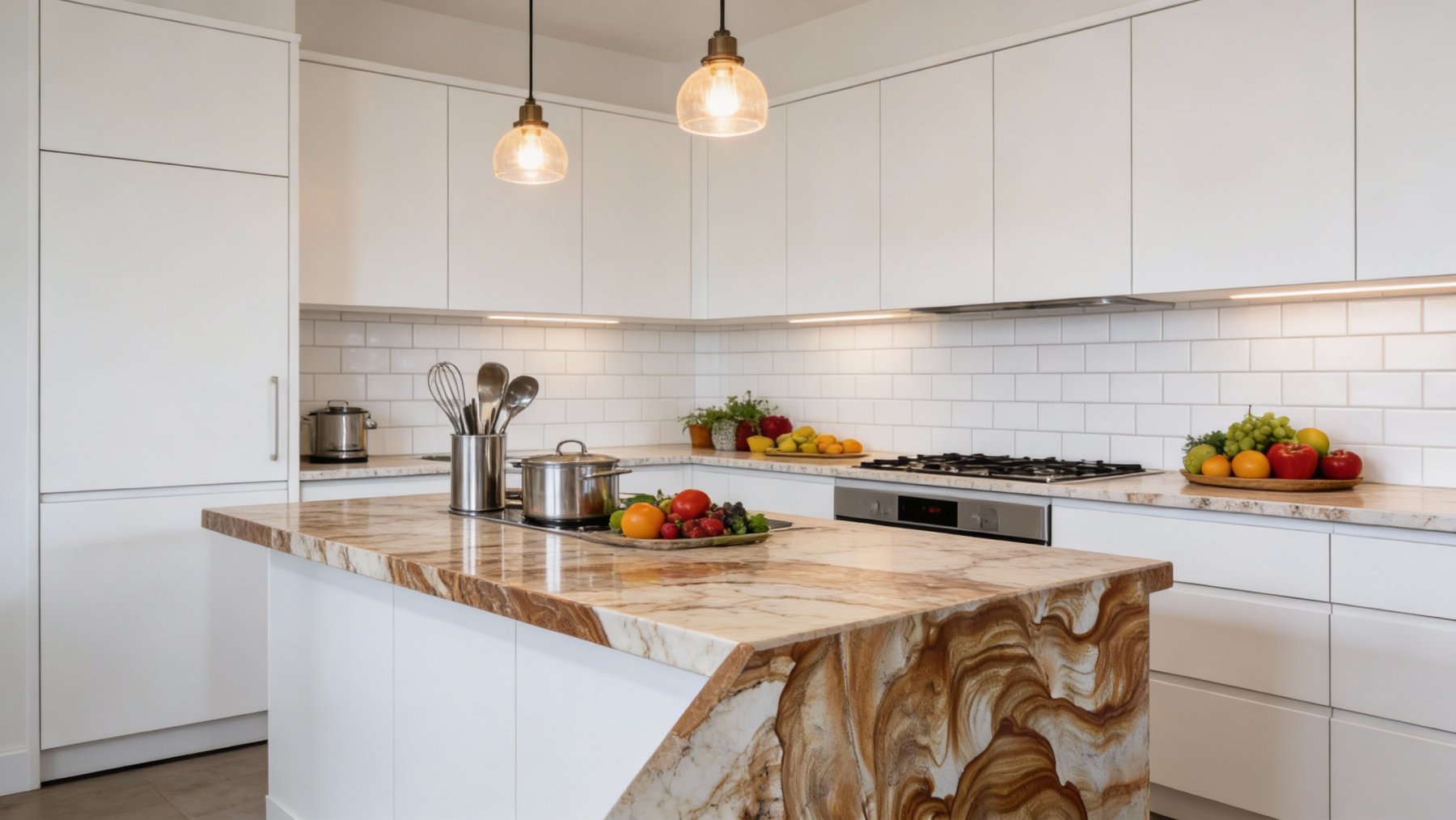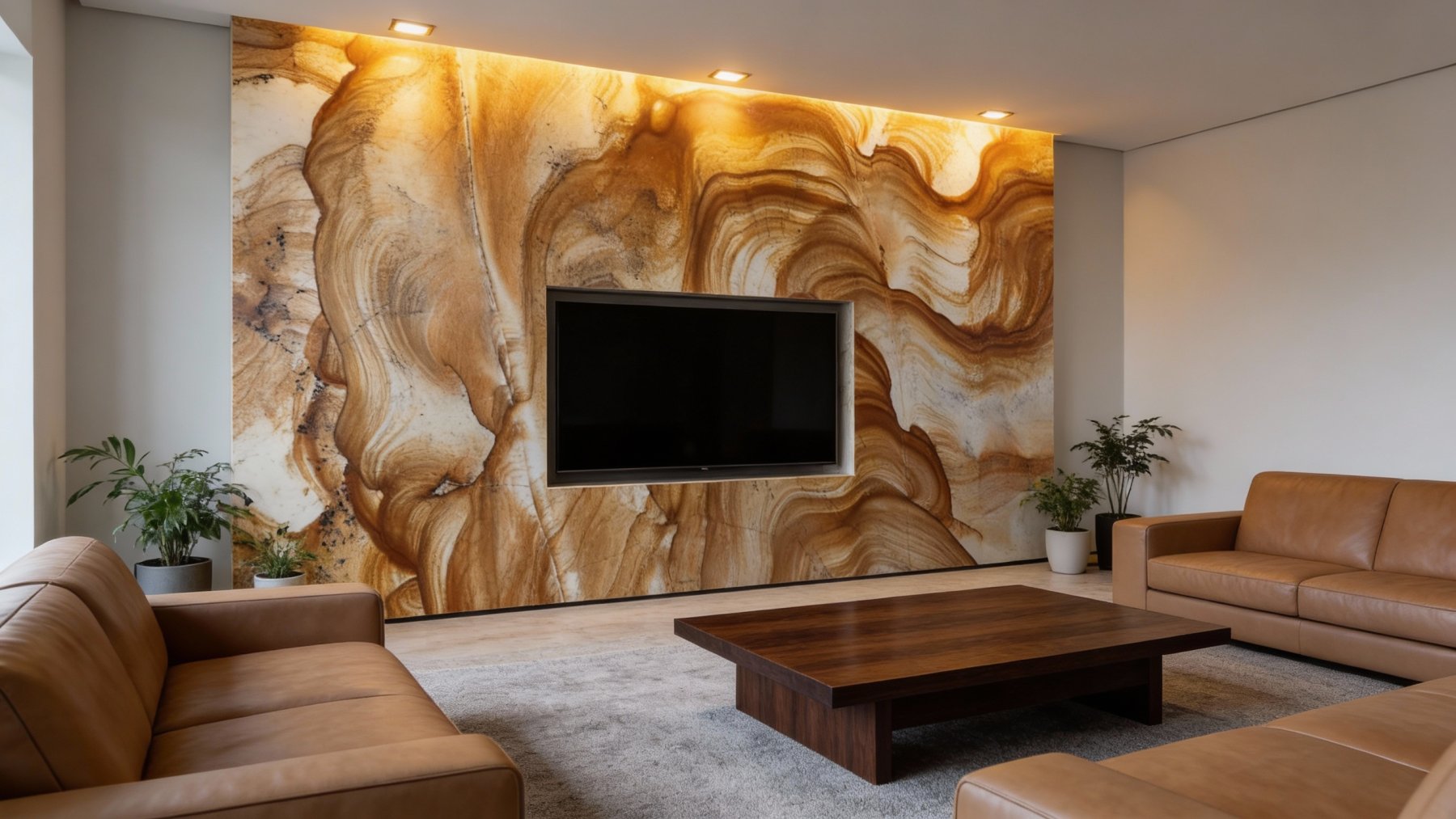 以暖调大地色系为核心基调,浅米色与奶白色交织铺就温润基底,深浅不一的焦糖棕、暖棕色条纹自然晕染其中,整体色调如午后阳光浸润的土壤般柔和治愈,既保留了天然石材的质朴厚重感,又传递出温暖亲和的视觉温度。