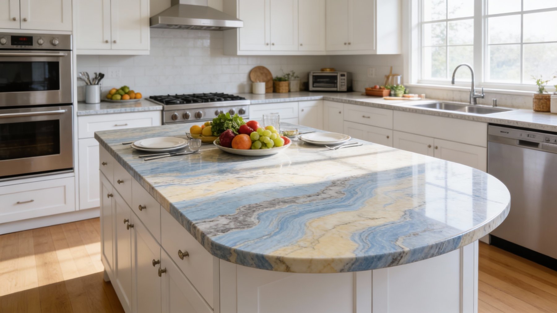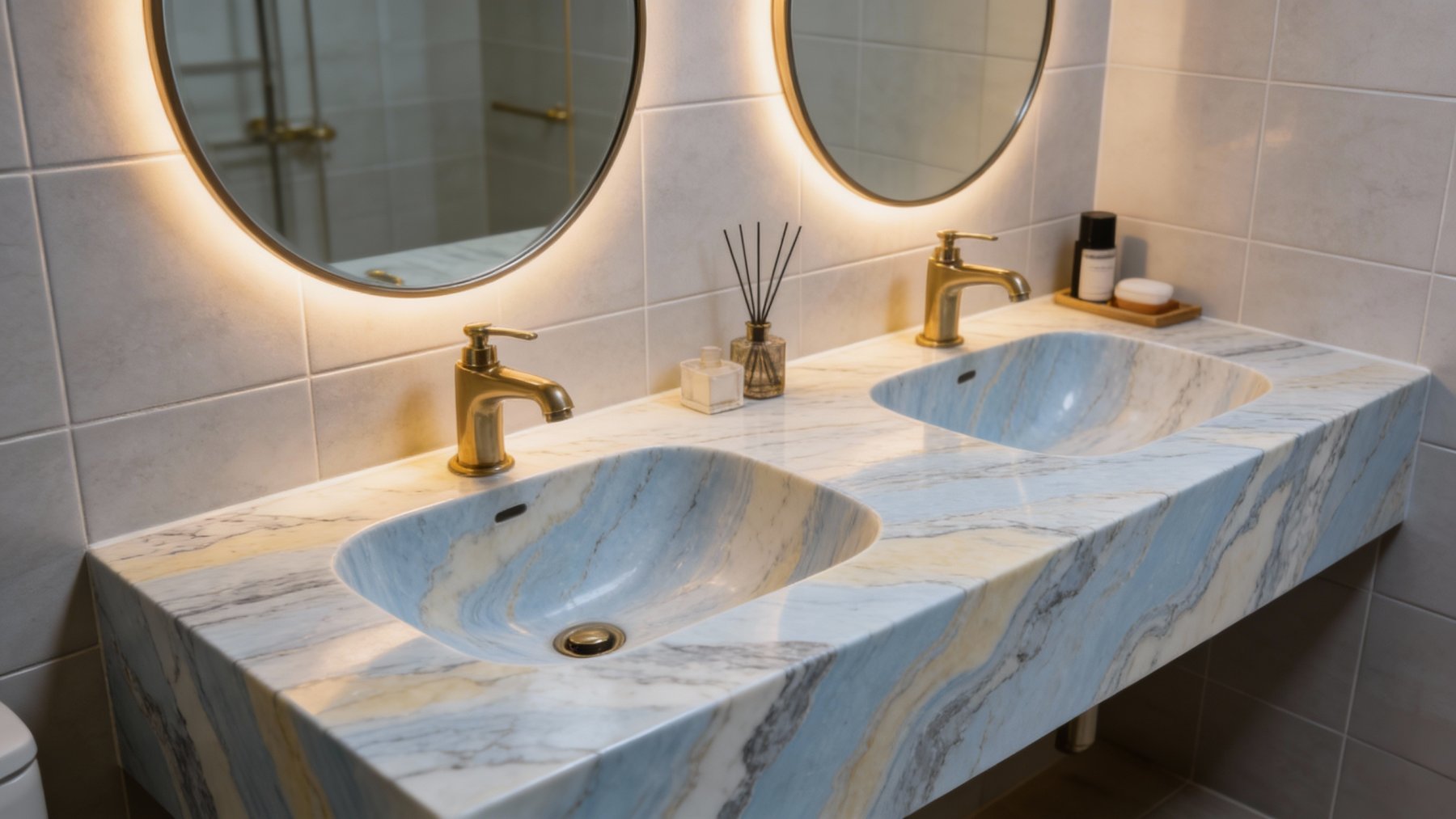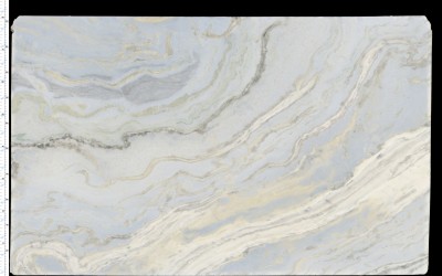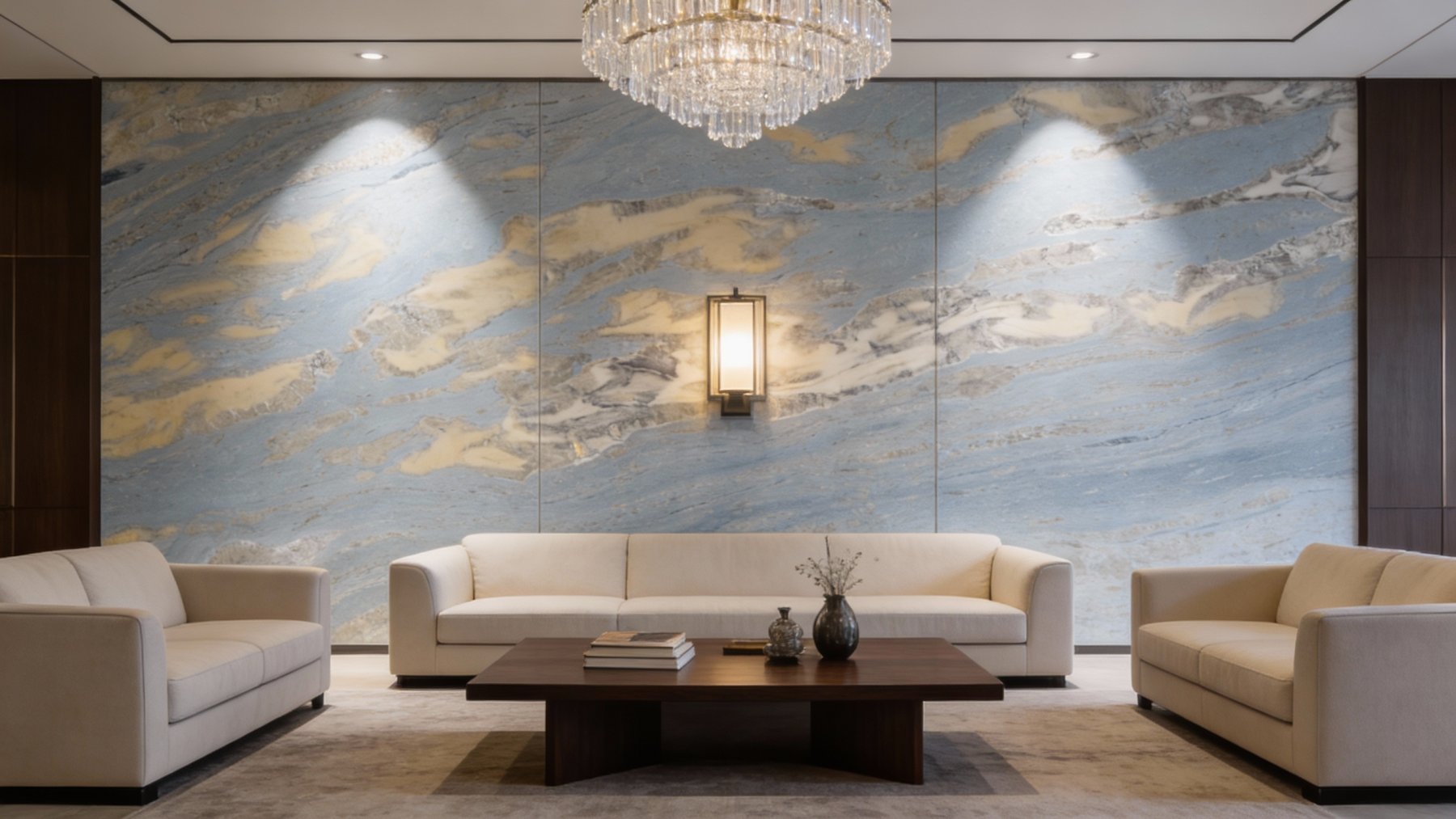 表面经精细抛光处理,触感细腻光滑,呈现出柔和温润的光泽(非刺眼高光)。浅色斑块边缘过渡自然,与浅灰蓝底色交融和谐,无生硬边界;灰色细纹的加入则丰富了层次,让整体质感更显立体雅致。细看之下,石材肌理细腻均匀,无粗糙颗粒感,尽显高级温润的质感。