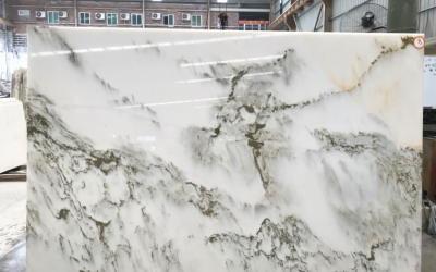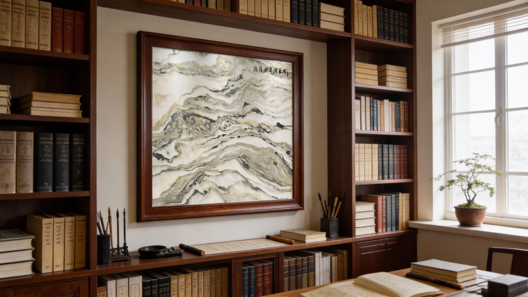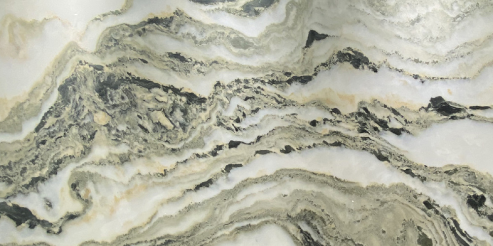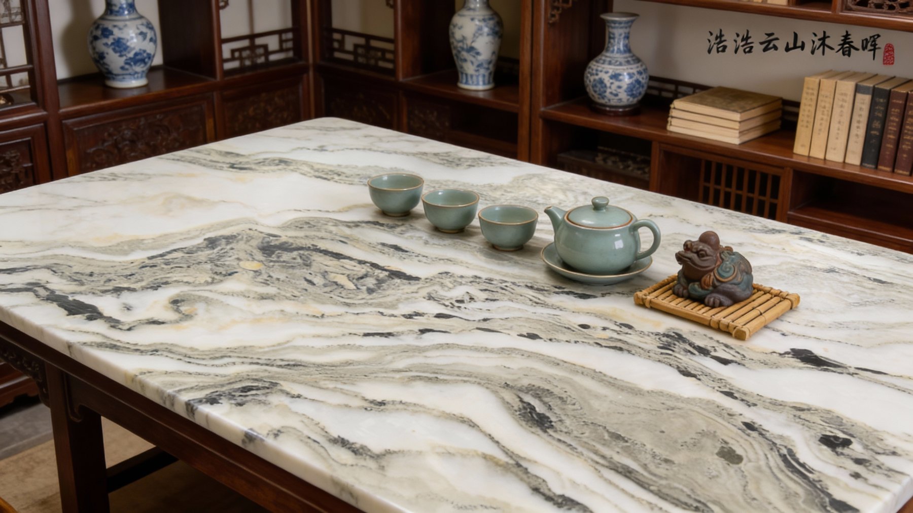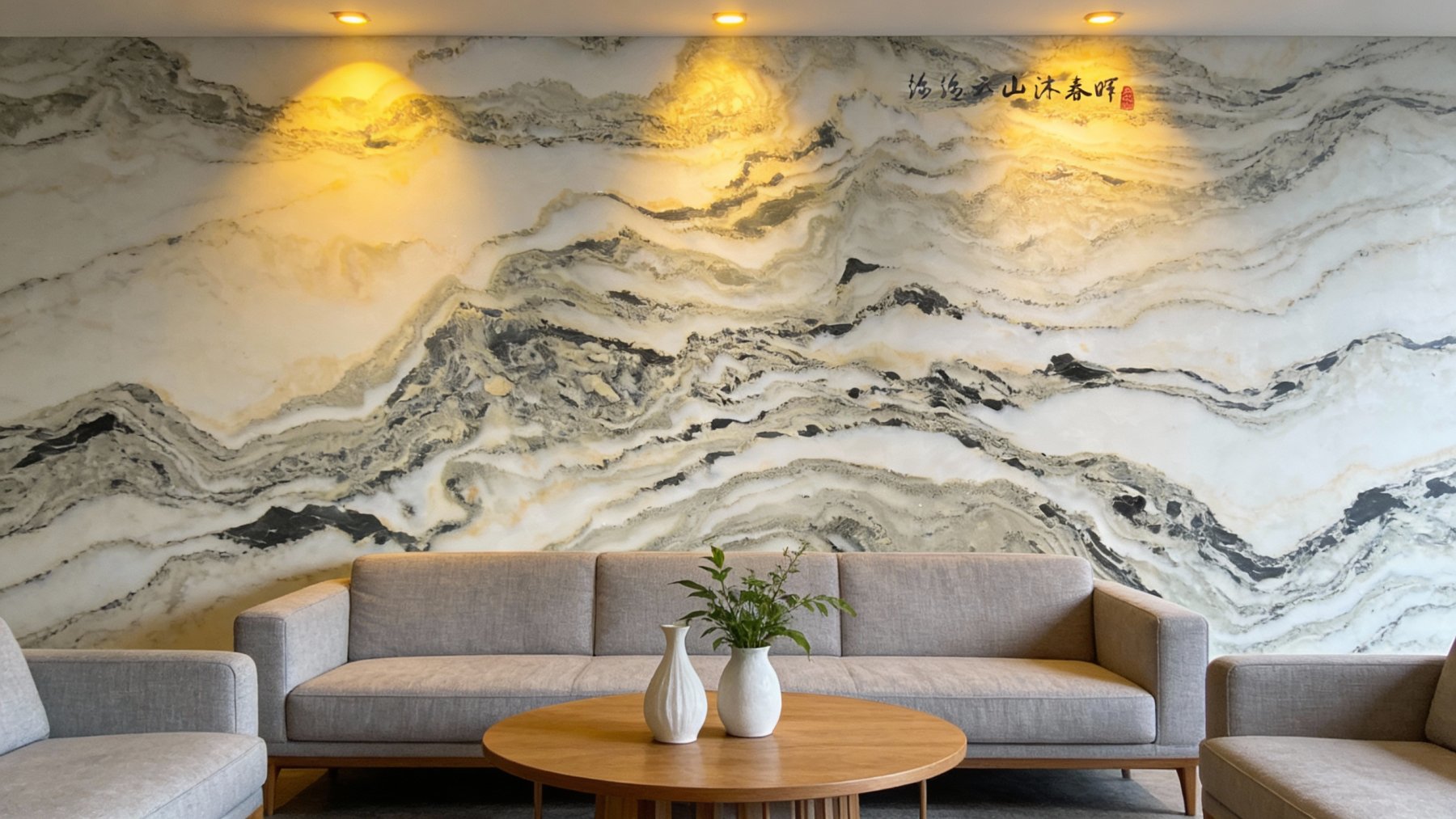 从细节质感来看,石材表面经精细抛光处理,触感光滑细腻,带有柔和的光泽感(非镜面强光,而是温润的内敛光感)。纹理边缘过渡自然:既有清晰的线条勾勒出山峦的硬朗轮廓,又有模糊的色块营造出云雾的朦胧晕染效果;白色基底部分通透温润,深色纹理部分深邃沉稳,二者相互映衬,让石材兼具细腻的肌理感与厚重的质感,整体如同天然雕琢的艺术珍品,自带高雅的东方美学气息。