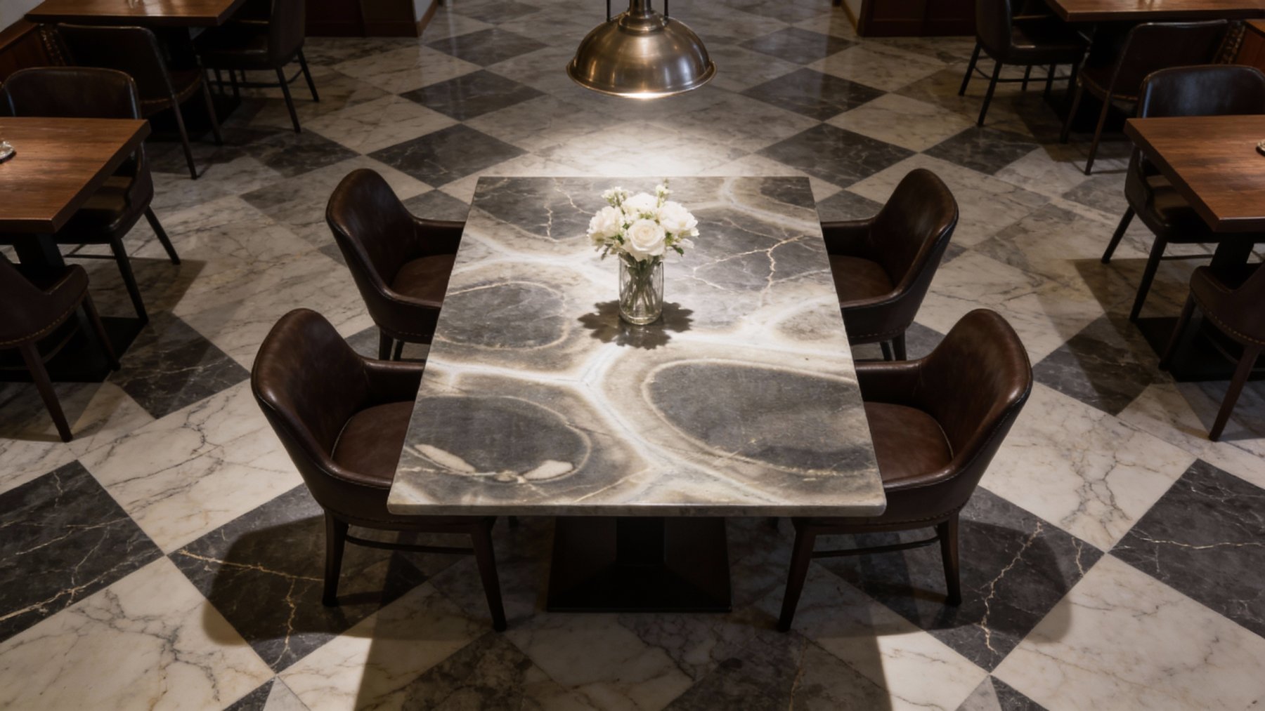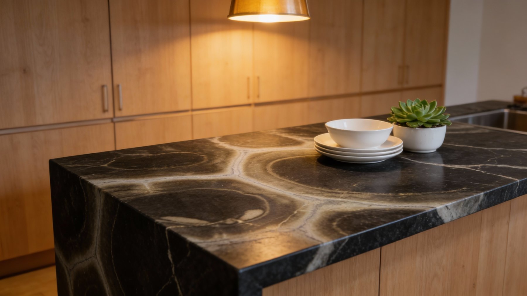 表面经精细抛光后,呈现**细腻温润的莹润光泽**:深色区域质地密实饱满,色泽浓郁;浅色分隔带略带半透明的细腻质感,似水墨晕染的留白;局部可见天然石材特有的细微脉络纹路,触感光滑莹润,视觉上兼具柔和与精致,尽显天然石材的原生质感与高端格调。