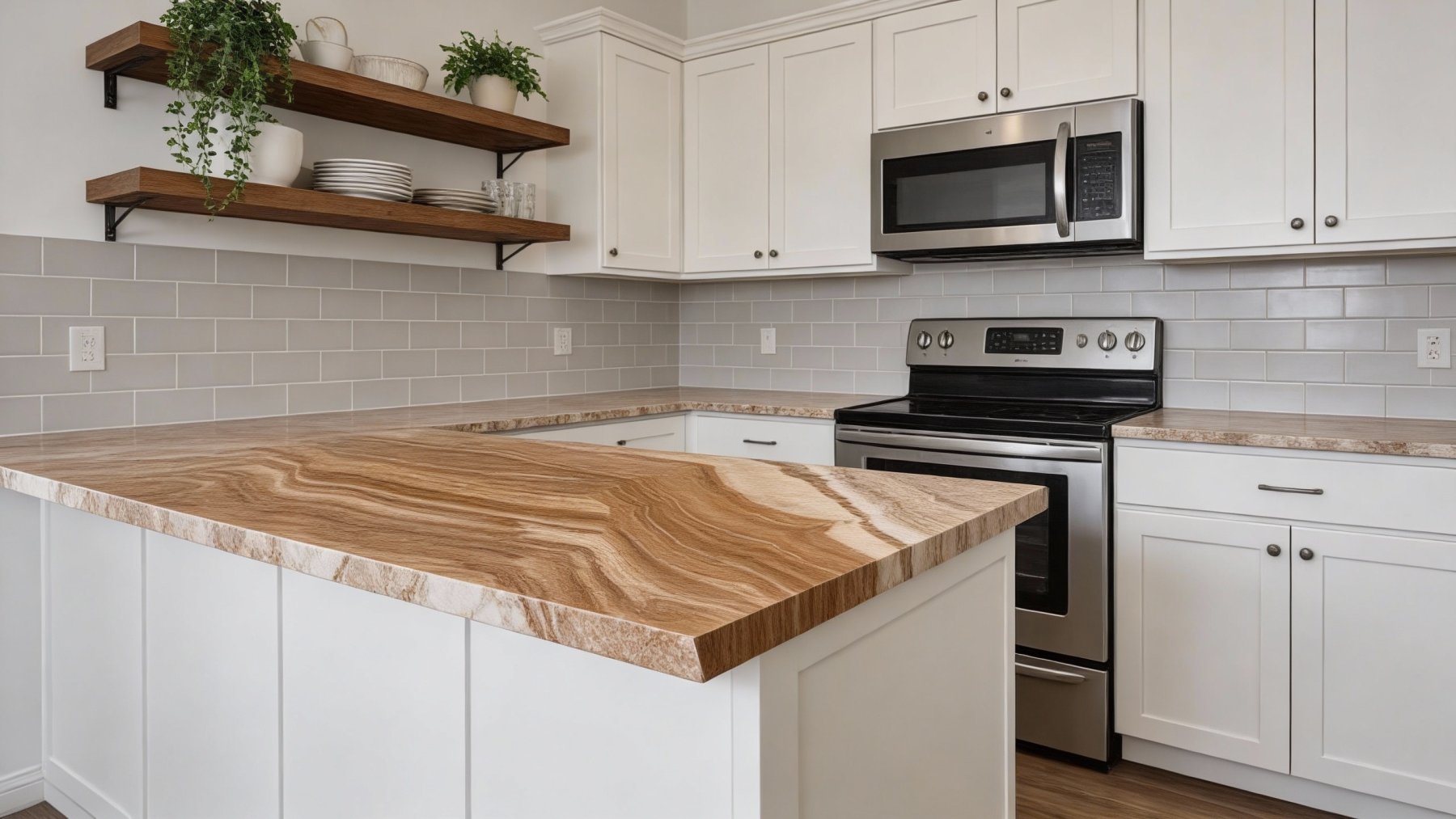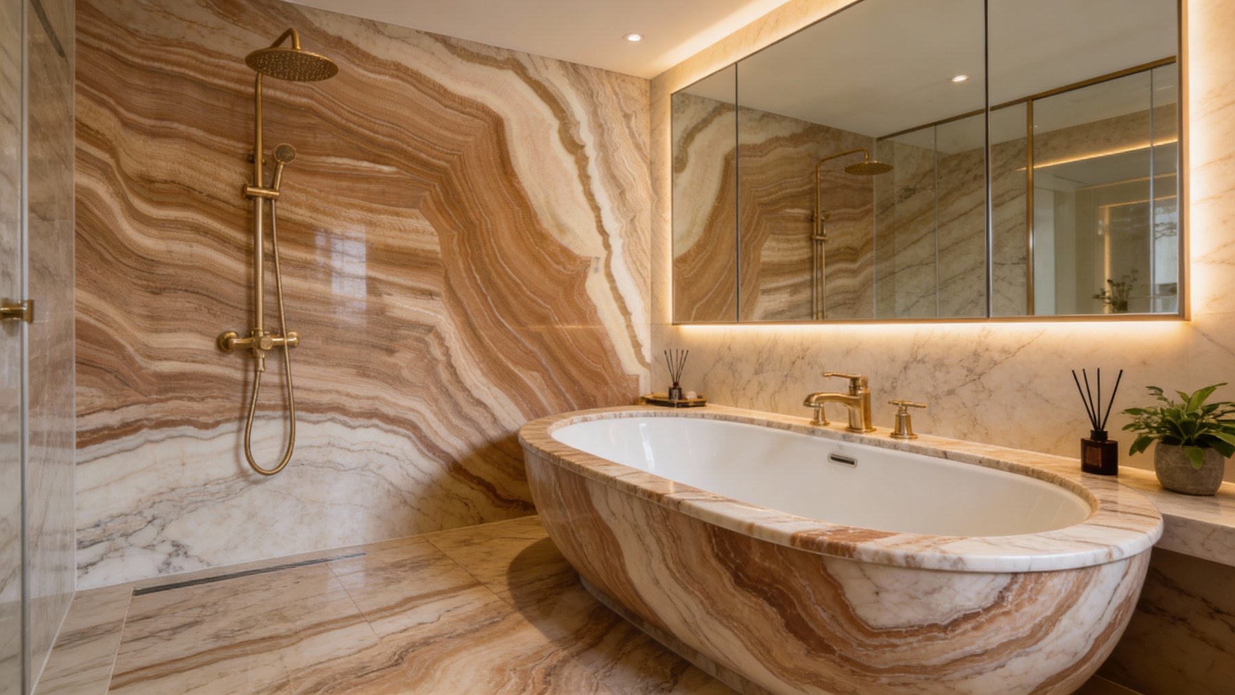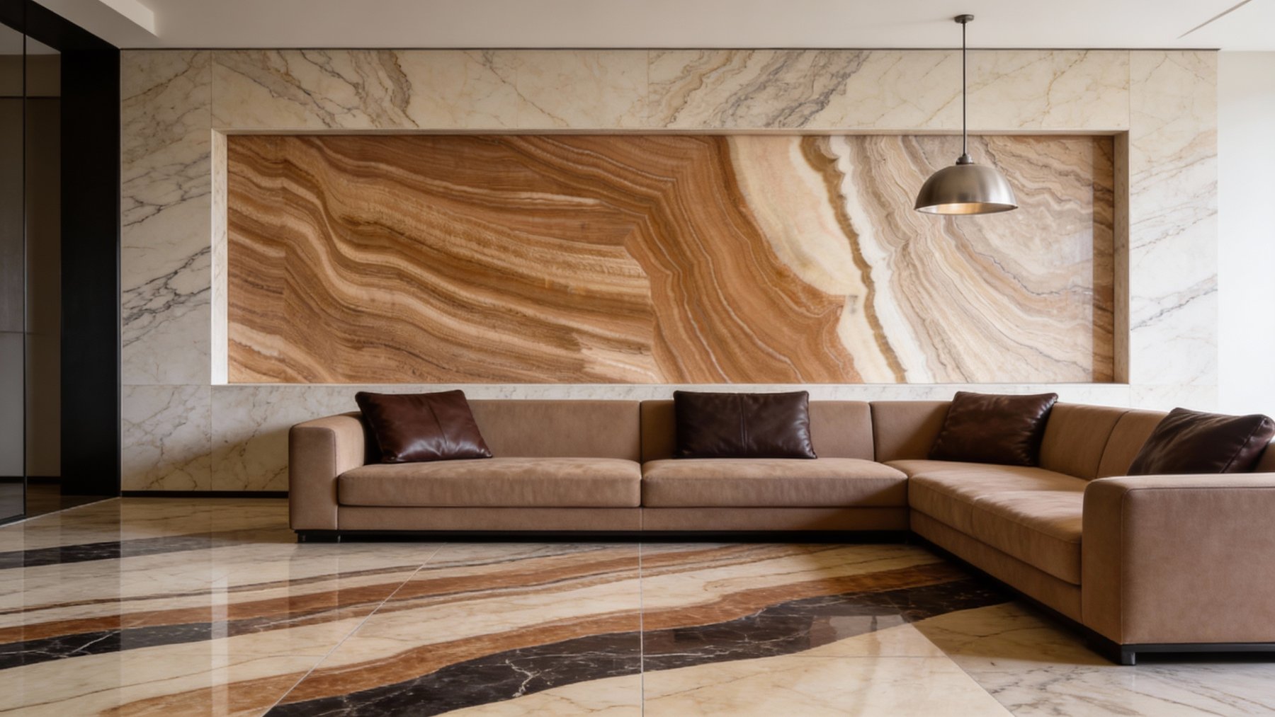 表面经精细打磨后**光滑细腻**,触感应温润顺滑;纹理边缘过渡柔和,光泽度适中,既保留了石材天然的厚重质感,又带有一丝精致的细腻感;条纹间的色彩渐变自然,视觉上给人以“温润如玉”的雅致质感,兼具自然野趣与人文打磨的精致度。