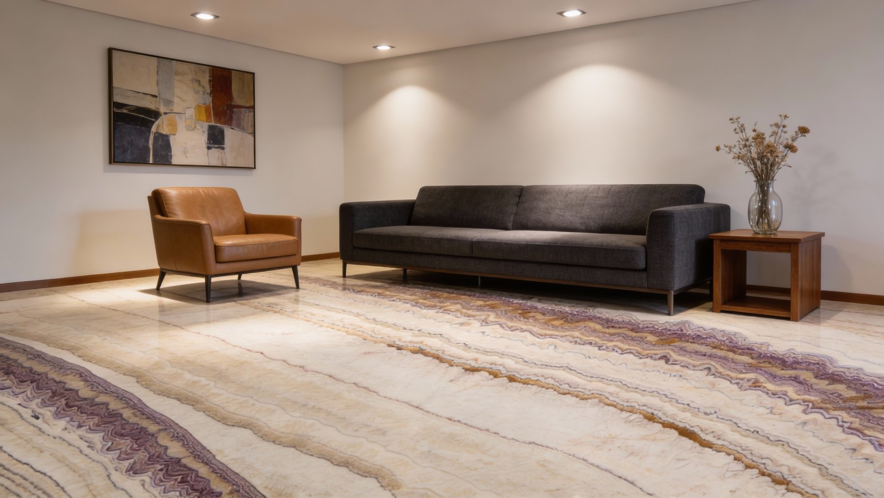 石材表面**细腻光滑**,带有天然石材特有的温润光泽(非刺眼高光,而是柔和的漫反射质感)。纹理边缘清晰却不生硬,不同色带的过渡自然细腻:浅米白区域质感纯净柔和,深棕条纹则因颜色浓度稍高而显得更具力量感,灰色细纹点缀其间增加了细节层次。触感应是平滑且带有轻微的天然肌理起伏(非粗糙颗粒感),整体兼具自然原生的厚重感与精致优雅的视觉表现力。