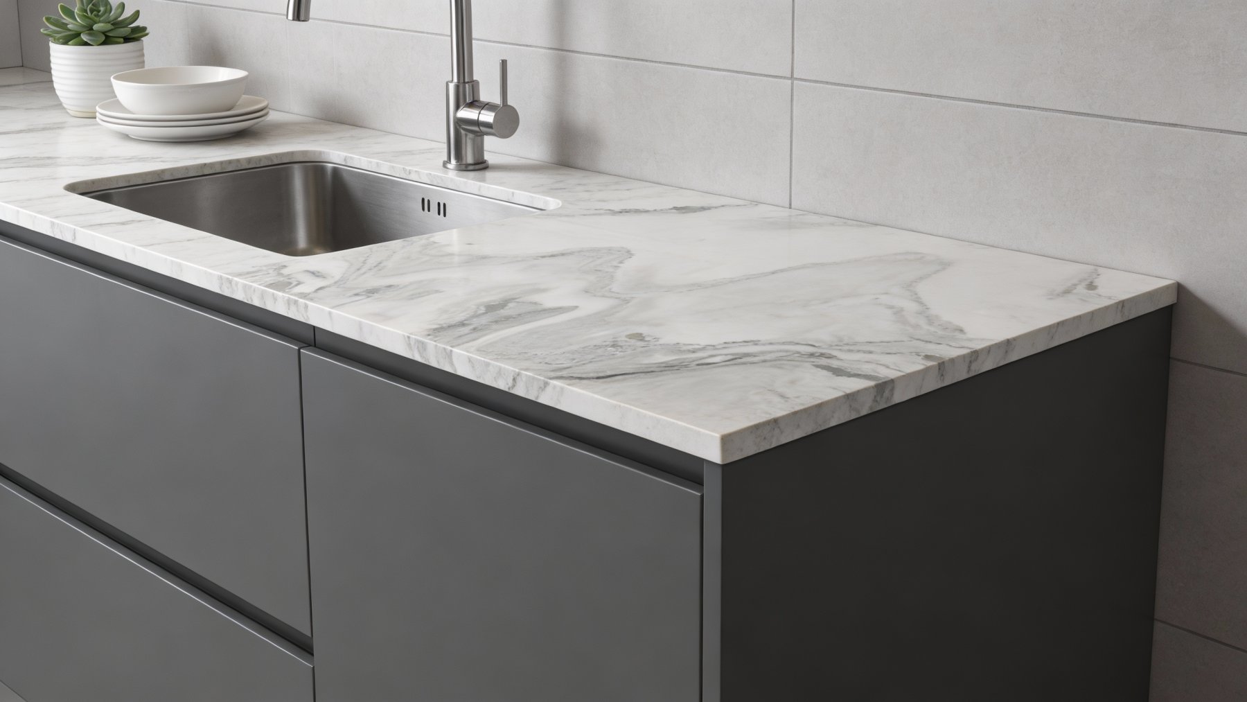石材表面质感细腻温润,带有柔和的自然光泽(非刺眼高光),触感应是平滑细腻的。深灰色纹理的细节处可见细微肌理变化:部分区域如云雾缭绕山间的朦胧感,部分区域似岩石天然的肌理纹路,视觉上层次丰富,兼具石材的坚硬质感与水墨山水的灵动气韵,精致却不刻意。