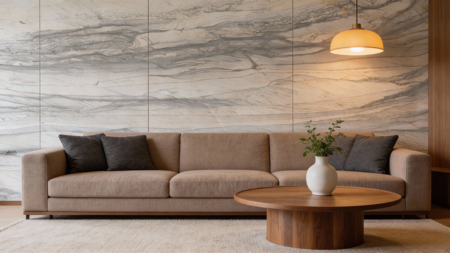 表面质感**细腻温润且不失厚重**,呈现天然石材特有的哑光/半哑光质感,触感应平滑却带有温润的肌理温度。纹理边缘过渡自然柔和,无生硬切割感;细微处可见天然石材的轻微色差与肌理变化(如局部浅淡的色点或纹理起伏),既保留了自然质朴的原生感,又兼具细腻的精致度。整体质感沉稳大气,层次丰富,彰显天然石材的内敛高级感。