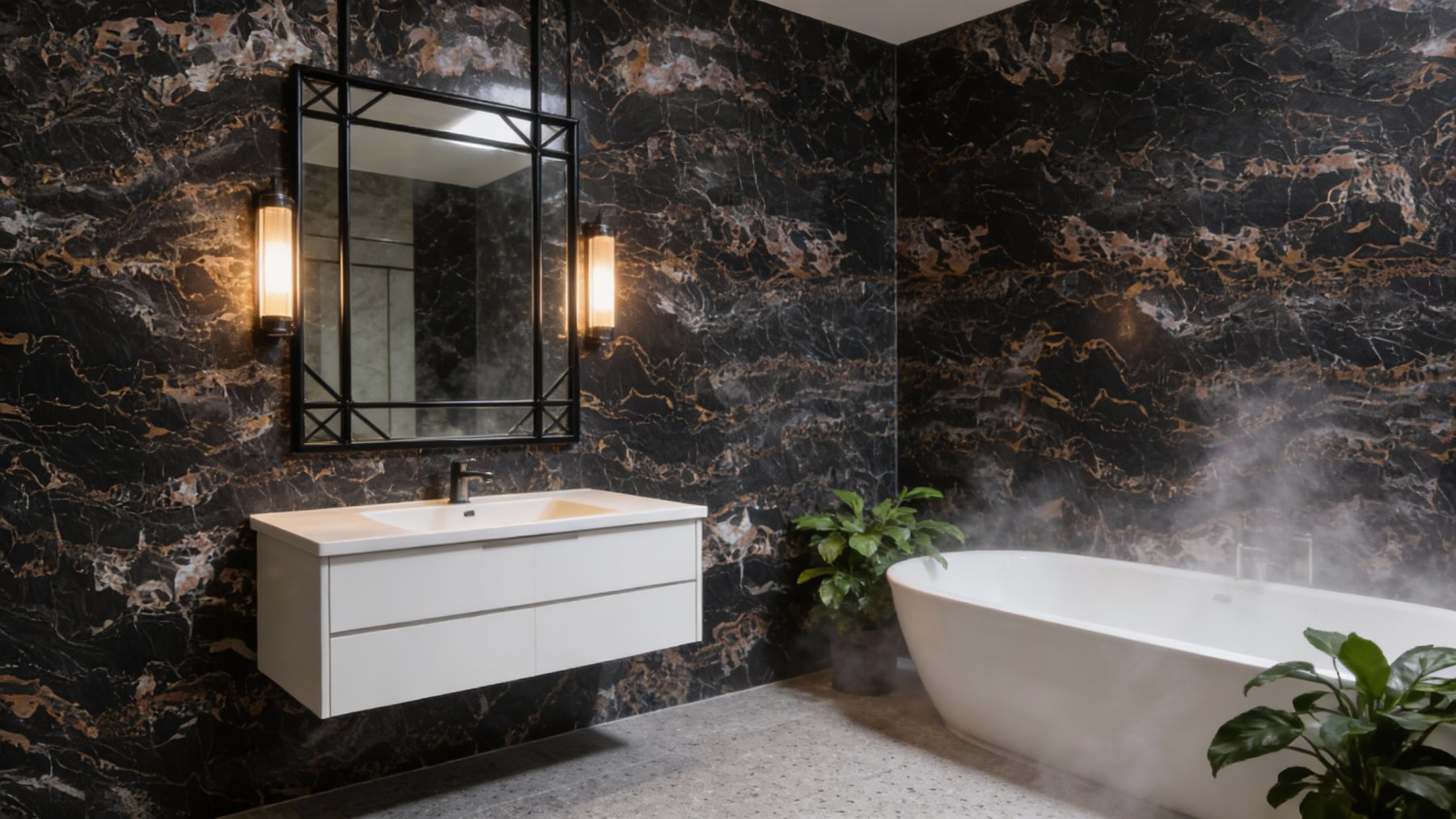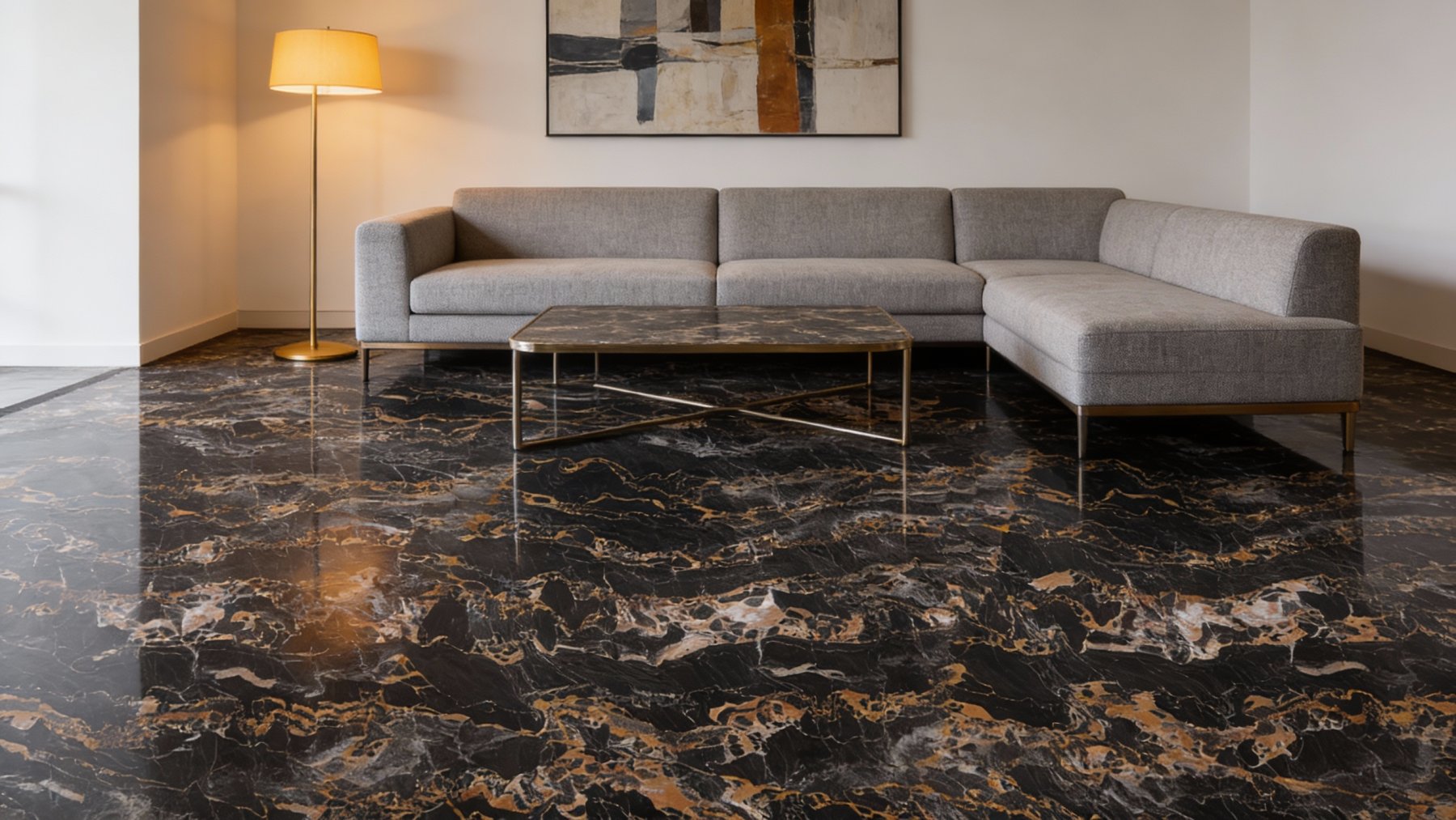 表面呈现**细腻温润的高光质感**,触感应平滑致密,反光均匀柔和,尽显天然石材的致密与精致。金色纹理区域隐约泛着金属般的微妙光泽,与黑色基底的温润哑光(或半光泽)质感形成质感碰撞,提升了整体的奢华感;纹理边缘过渡自然,无生硬边界,每一寸细节都彰显出天然石材的独特性——既有岩石的坚硬质感,又因纹理的灵动而不失柔和,视觉与触觉双重层面传递出高档石材的细腻与厚重。