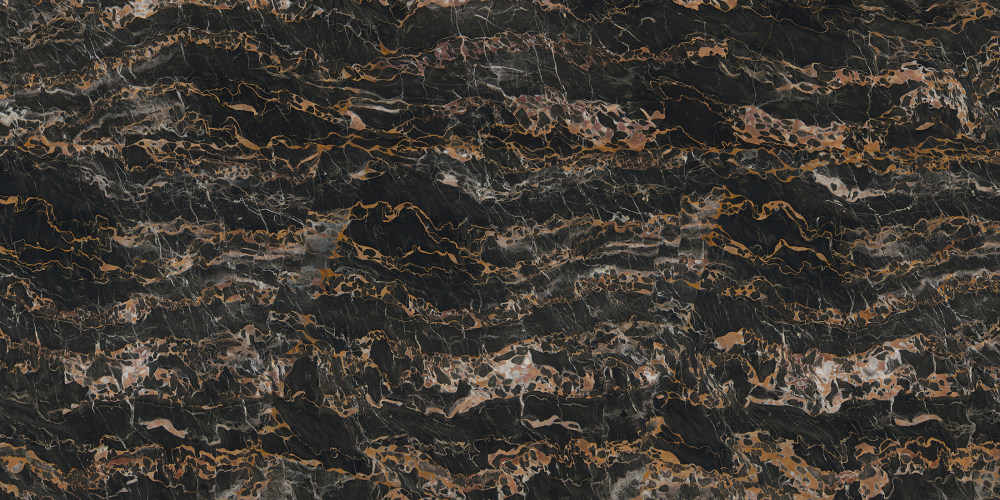 纹理呈现**自然流动的脉络状**,宛如大地肌理的天然雕琢:金色与暖棕色调的纹路如蜿蜒溪流般穿梭于黑色基底之上,线条婉转灵动,时而舒展如波浪,时而卷曲如云雾,彼此交织缠绕,形成层次丰富的视觉韵律;其间还点缀着浅灰、米白色的细碎纹理,如星芒般散落,与深色基底、金色脉络形成鲜明对比,进一步强化了纹理的动感与立体感,整体宛如一幅自然泼墨的艺术画卷,每一处纹路都独一无二。