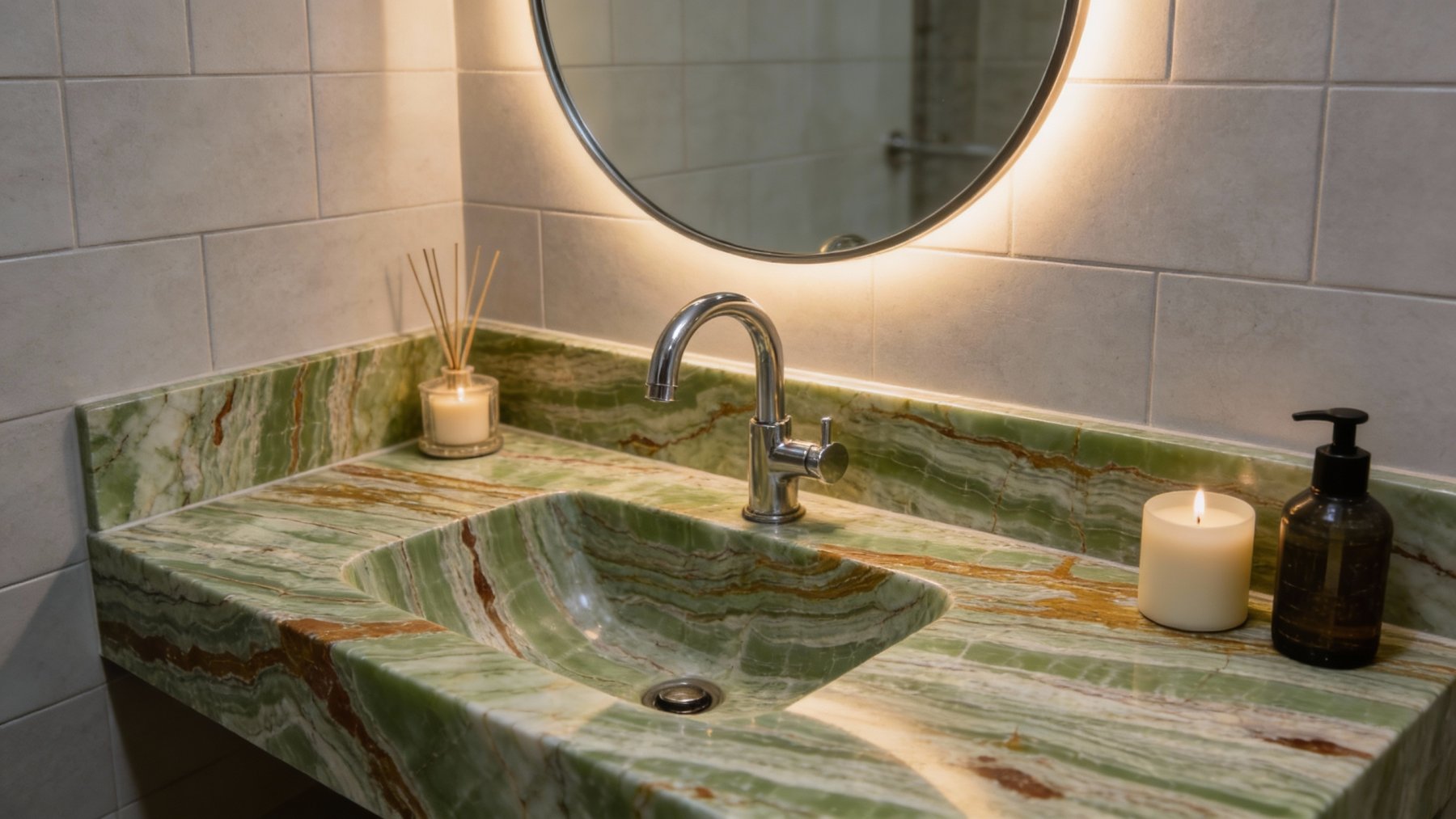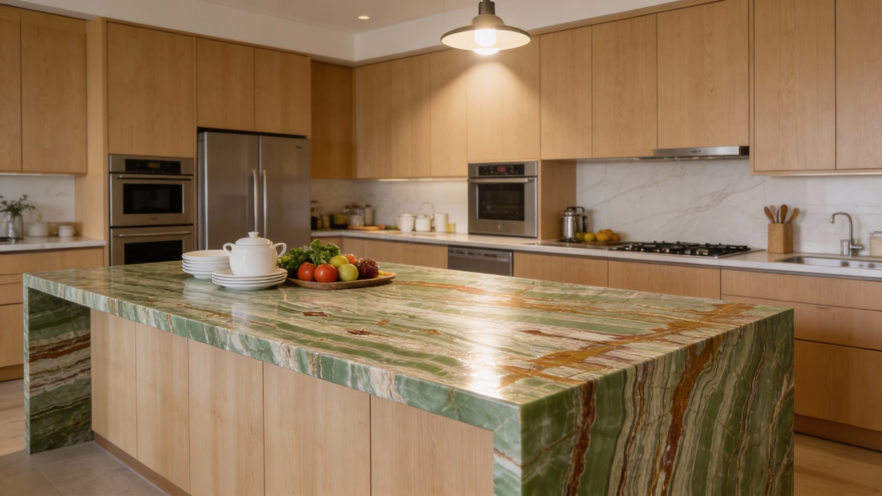 表面质感细腻温润,条纹间的色彩过渡自然柔和,部分区域带有轻微晕染感,尽显石材的天然肌理;暖棕色部分自带沉淀般的厚重质感,绿色与白色区域则显得通透柔和,整体光泽度适中(偏向自然哑光或柔光),无刻意雕琢痕迹,触感应平滑却藏有细微的纹理起伏,传递出质朴雅致的自然触感。