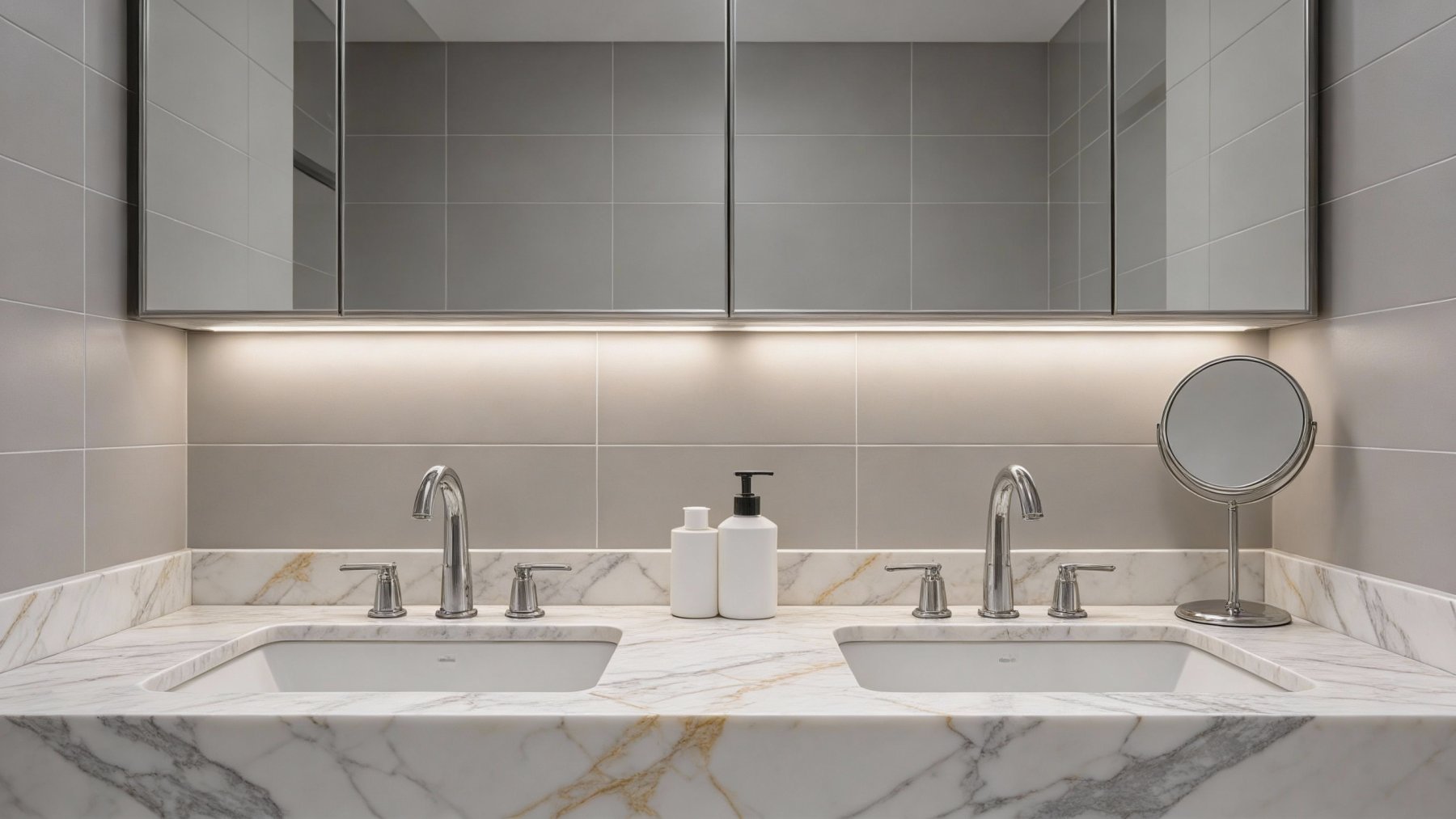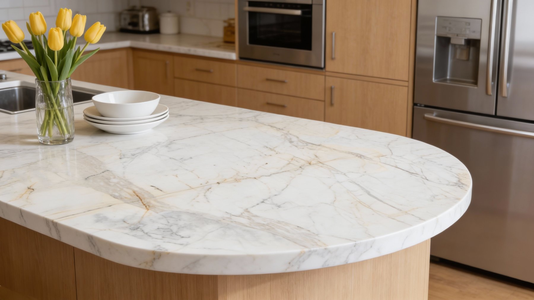 石材底色以**温润的浅乳白色**为主调,略带自然的暖调质感,纯净而不刺眼,柔和中透着雅致。底色并非单一纯白,而是蕴含细微的天然色泽变化,赋予空间柔和舒适的视觉基础,既百搭又不失高级感。