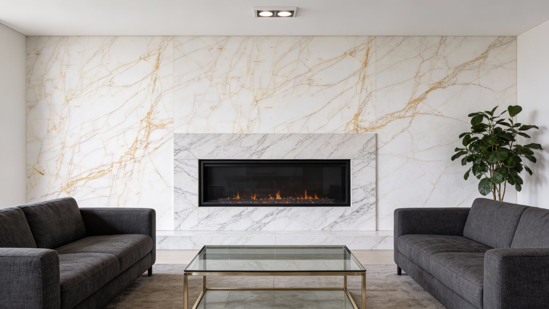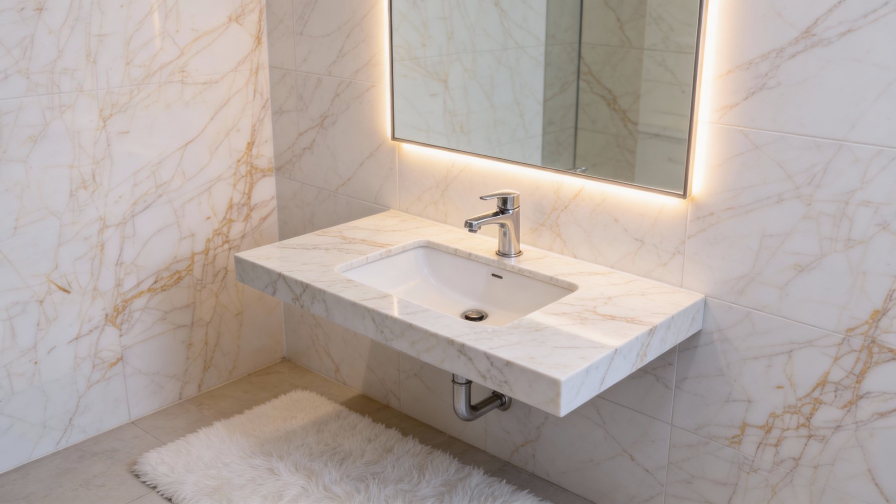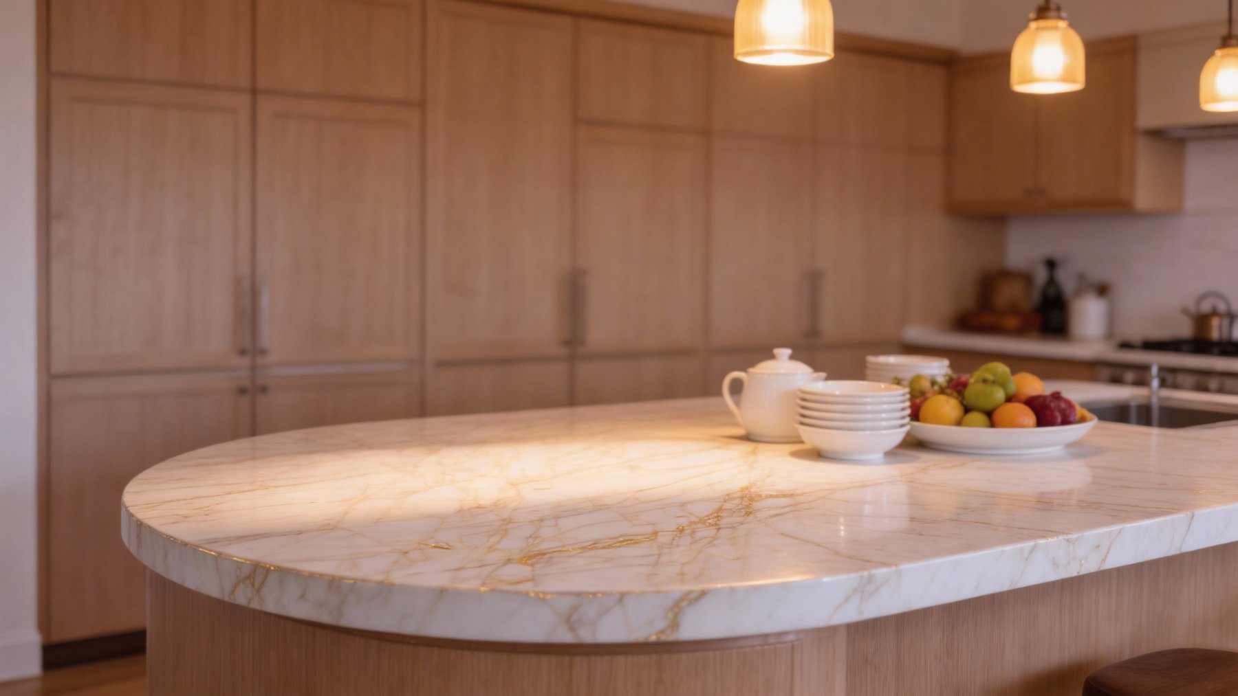 石材表面经精细抛光处理,**触感光滑细腻**,自带温润的光泽感,轻抚时无明显颗粒感;金色纹理部分质感饱满,与白色底色融合自然——纹理边缘清晰却不生硬,仿佛天然嵌入石材内部,而非浮于表面,视觉上既有白色基底的柔和细腻,又有金色纹理的精致光泽,层次丰富且轻奢感十足,细看之下更显质感高级。