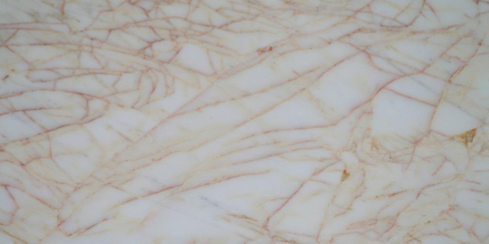 纹理呈**红粉色脉络状**,线条自然舒展、粗细交错:既有纤细如发丝的浅红细纹,也有稍宽的红粉线条,疏密排布无刻意规则,似天然石材形成时的自然裂变痕迹,又像轻盈红丝在奶白基底上随性游走。纹路间相互交织却不杂乱,兼具流畅曲线感与细碎断裂感,灵动如玉石中的“血丝”纹理,层次丰富且充满自然韵律,没有人工刻意雕琢的生硬感。