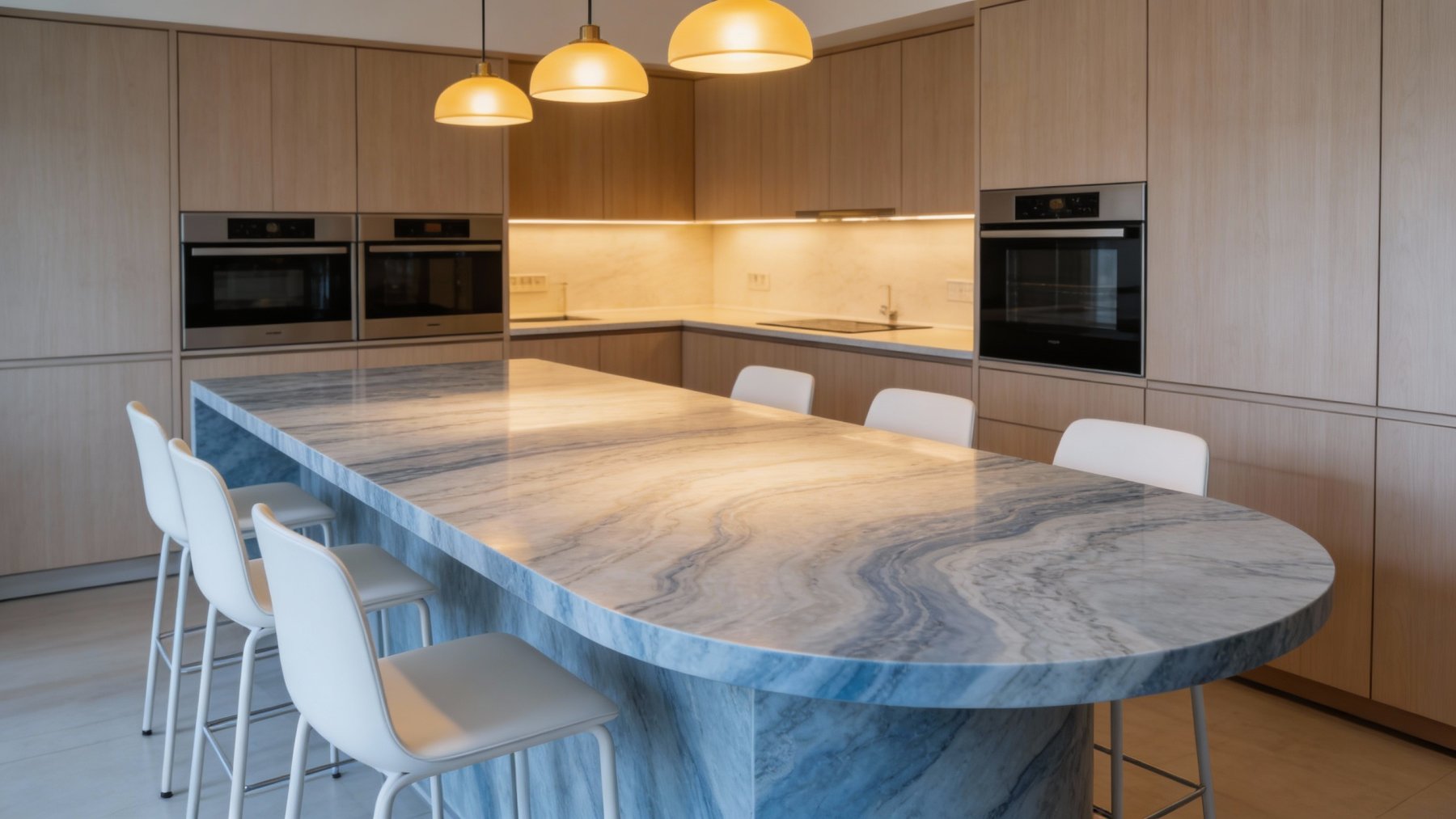 表面经精细抛光后,质感**细腻温润**:触感应平滑丝滑,无粗糙颗粒感;视觉上,纹理间的色彩过渡自然柔和,深浅蓝灰与米白交织处层次丰富,隐约可见细微的天然矿物光泽(非刺眼高光,而是柔和内敛的反光)。整体既保留了石材的坚实质感,又通过细腻的色彩与光泽,传递出雅致高级的视觉体验。