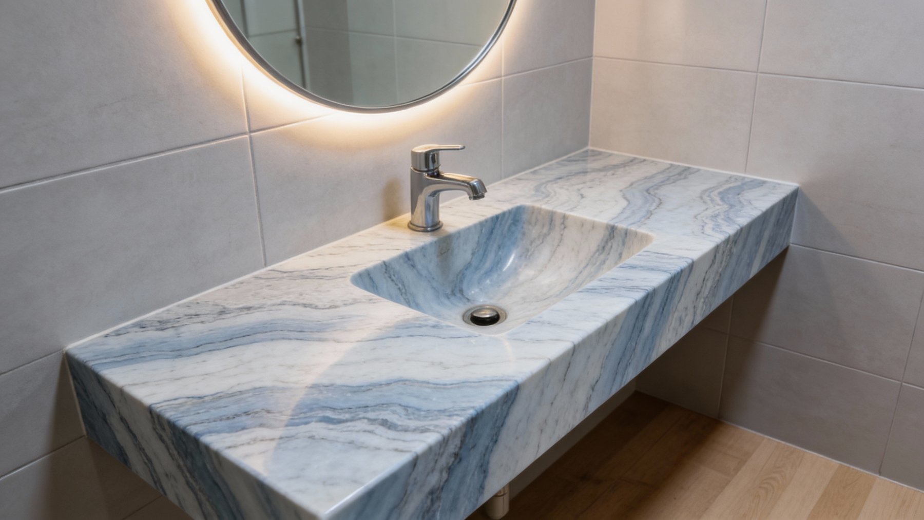 这款石材的底色以**柔和浅灰蓝**为主调,交织着清浅的米白色与淡灰白色,整体色调清新雅致如晨雾下的湖面,自带宁静舒缓的氛围。灰蓝调中揉入了恰到好处的灰度,避免了色彩的跳脱感,米白与灰白的点缀则让基底更显温润,平衡了冷色调的疏离感。