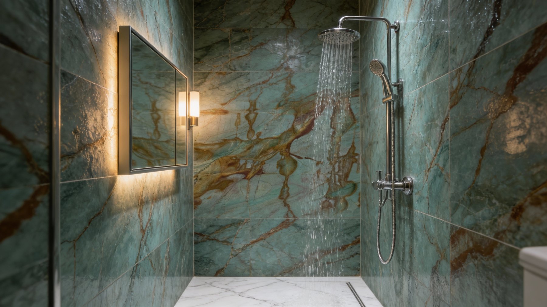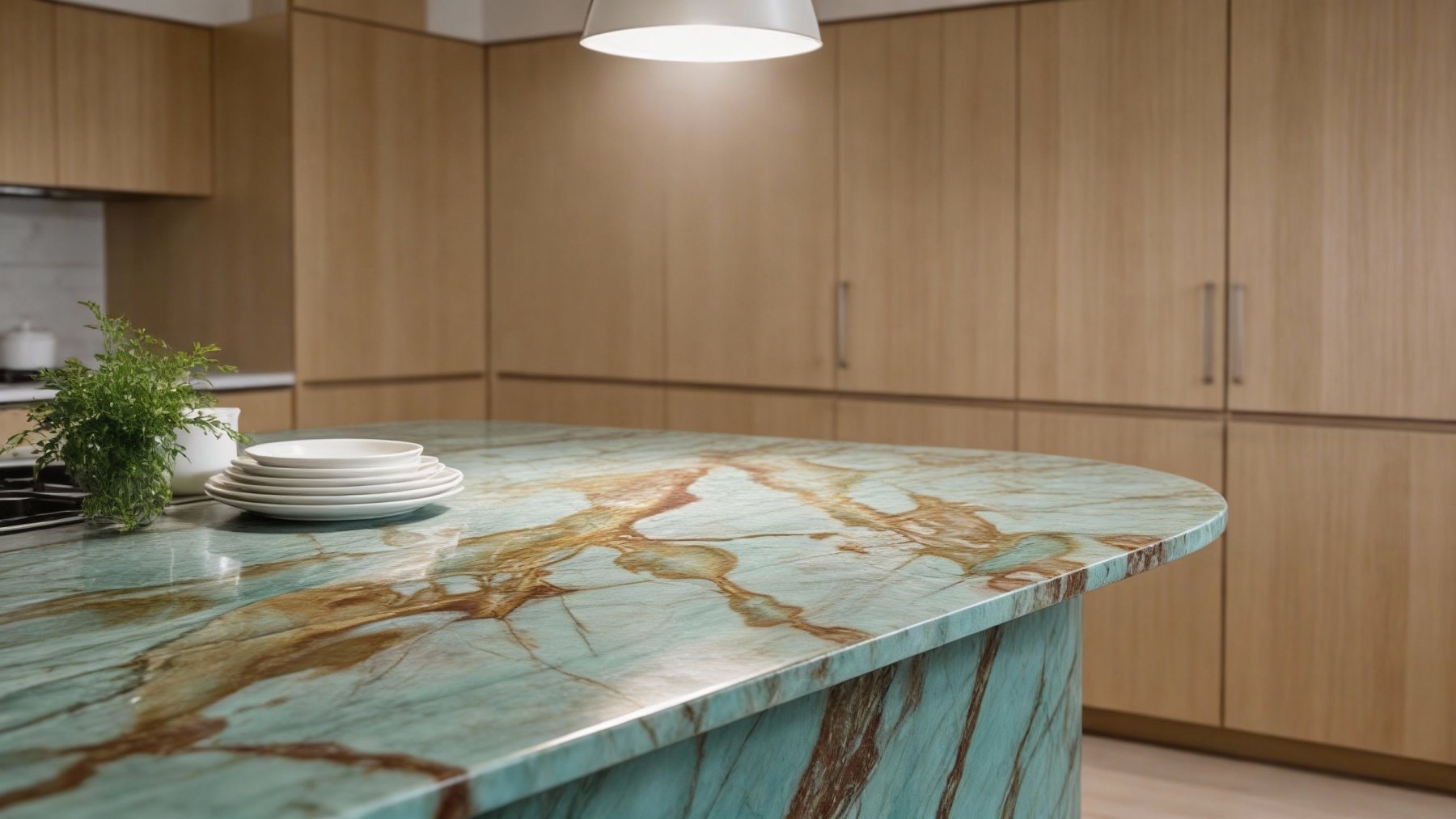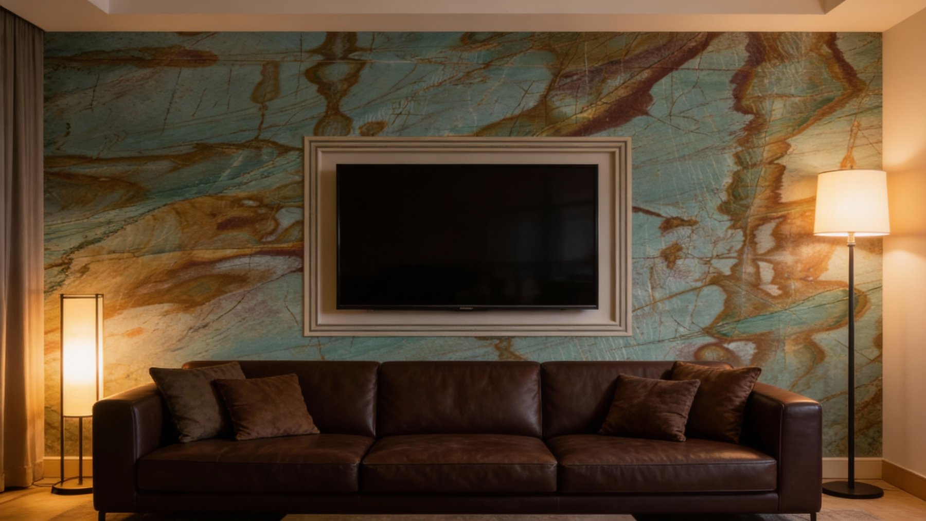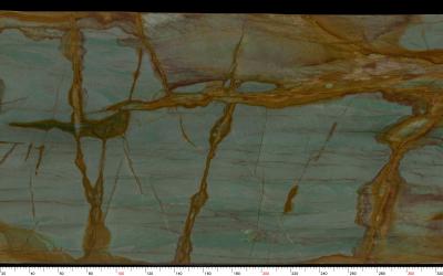 石材以**浅灰青绿色**为核心基底色调,色泽柔和内敛:青绿色赋予其清新自然的气息,而灰调的融入则中和了色彩的跳脱感,使其更显沉稳雅致。整体基调温润不张扬,既保留了自然石材的原生感,又具备现代美学的低调质感。