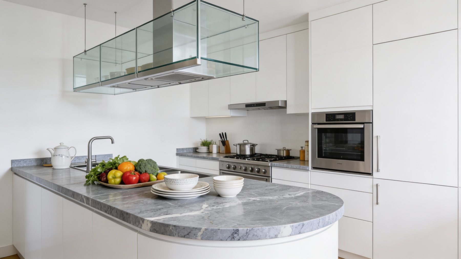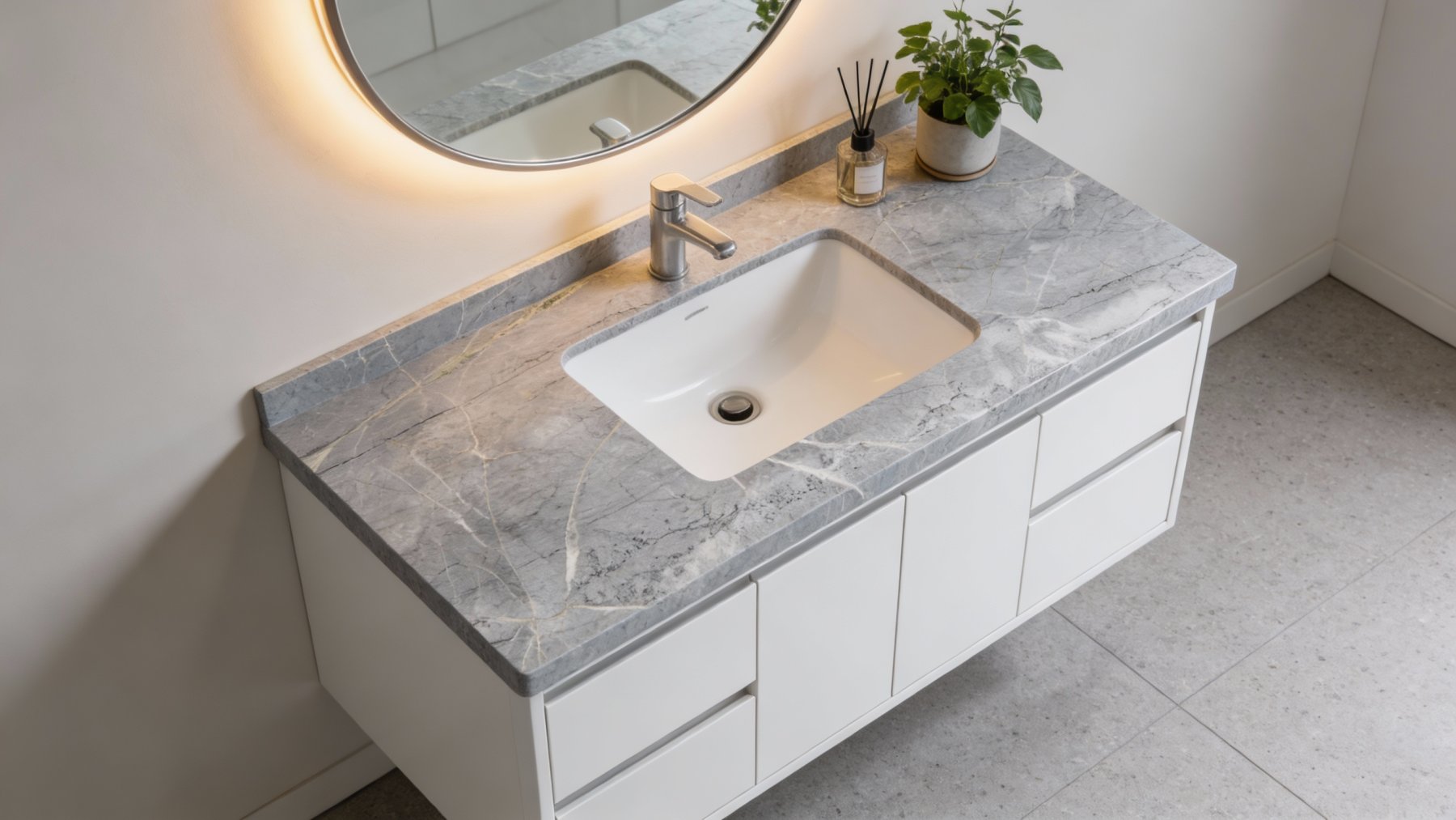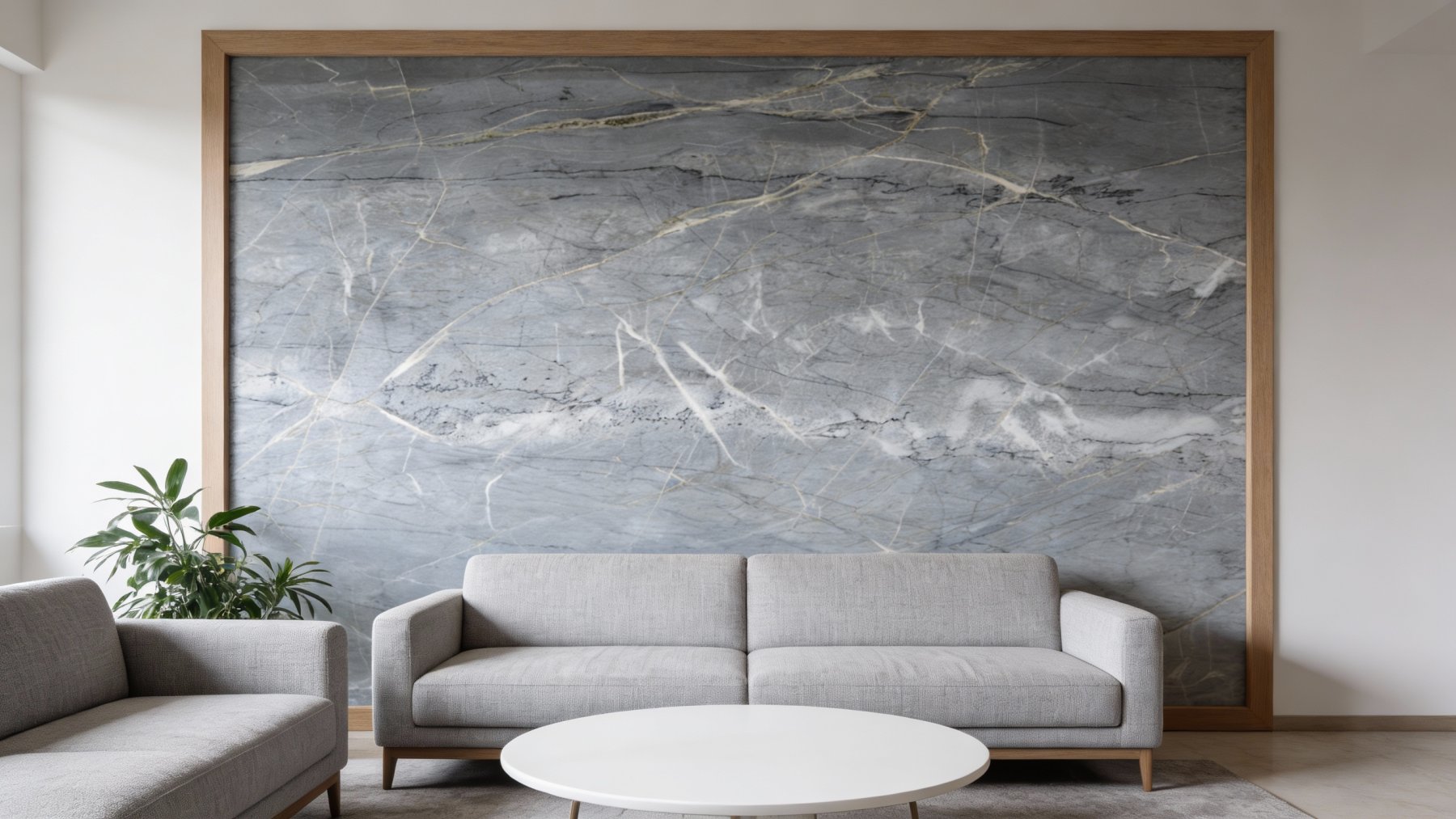 这款石材的底色以**柔和的中浅灰色**为主调,基调偏冷,隐约透着淡灰银或浅灰蓝的细腻底色,整体色泽均匀且温润——既无深灰的沉闷压抑,也无亮灰的跳脱感,恰似清晨薄雾般的素雅质感,为空间奠定了冷静而雅致的基调。