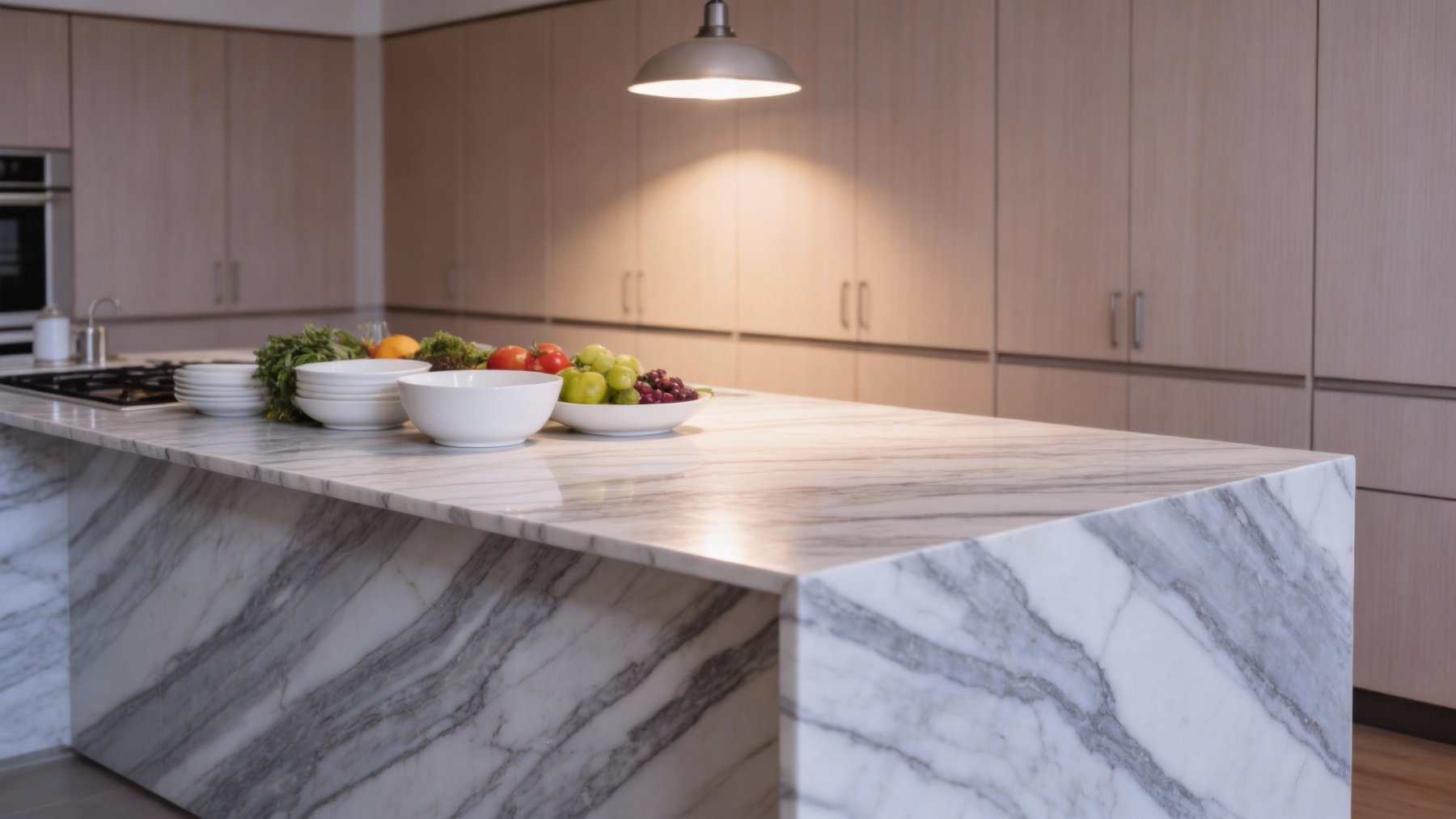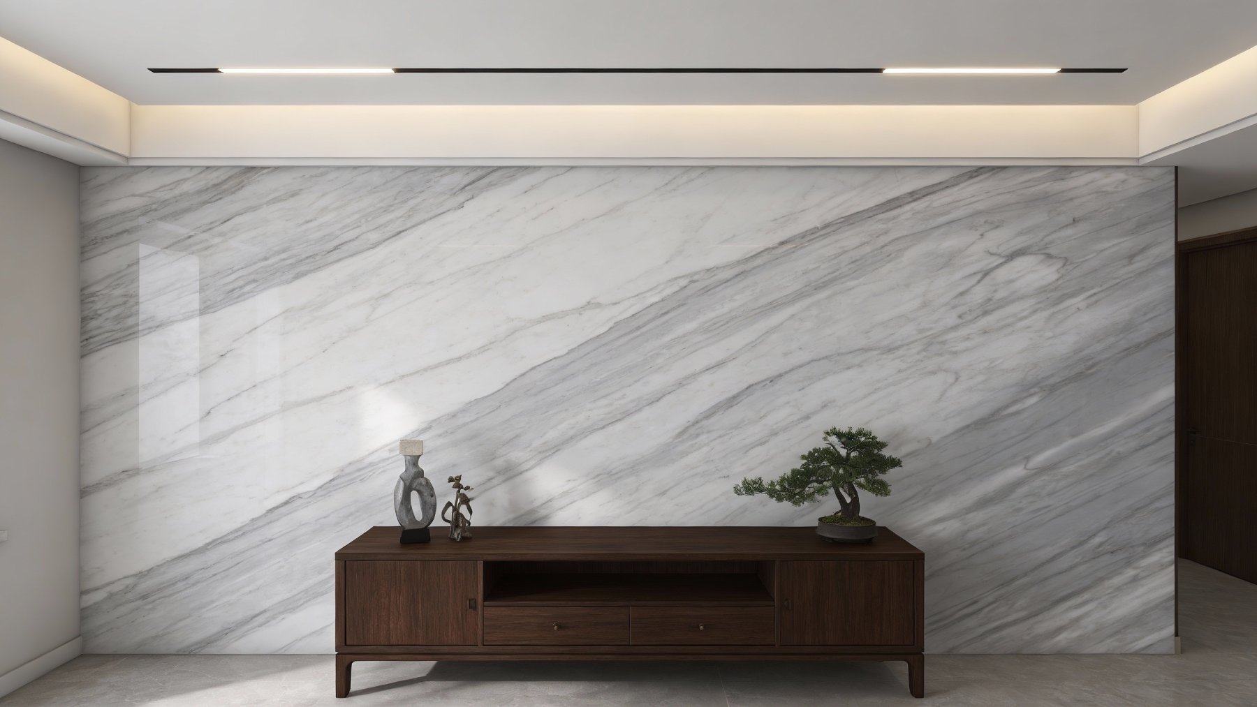 表面质感细腻温润,带有石材特有的**内敛柔光**(非镜面高光),触感应是平滑细腻的。纹理线条为深灰色,与浅灰底色形成微妙的明暗对比,线条边缘模糊柔和,无生硬切割感;细看之下,纹理中还夹杂着极细微的天然石质颗粒,不破坏整体细腻感,反而增添了自然真实的质感层次,既保留了石材的原始韵味,又透出雅致高级的格调。