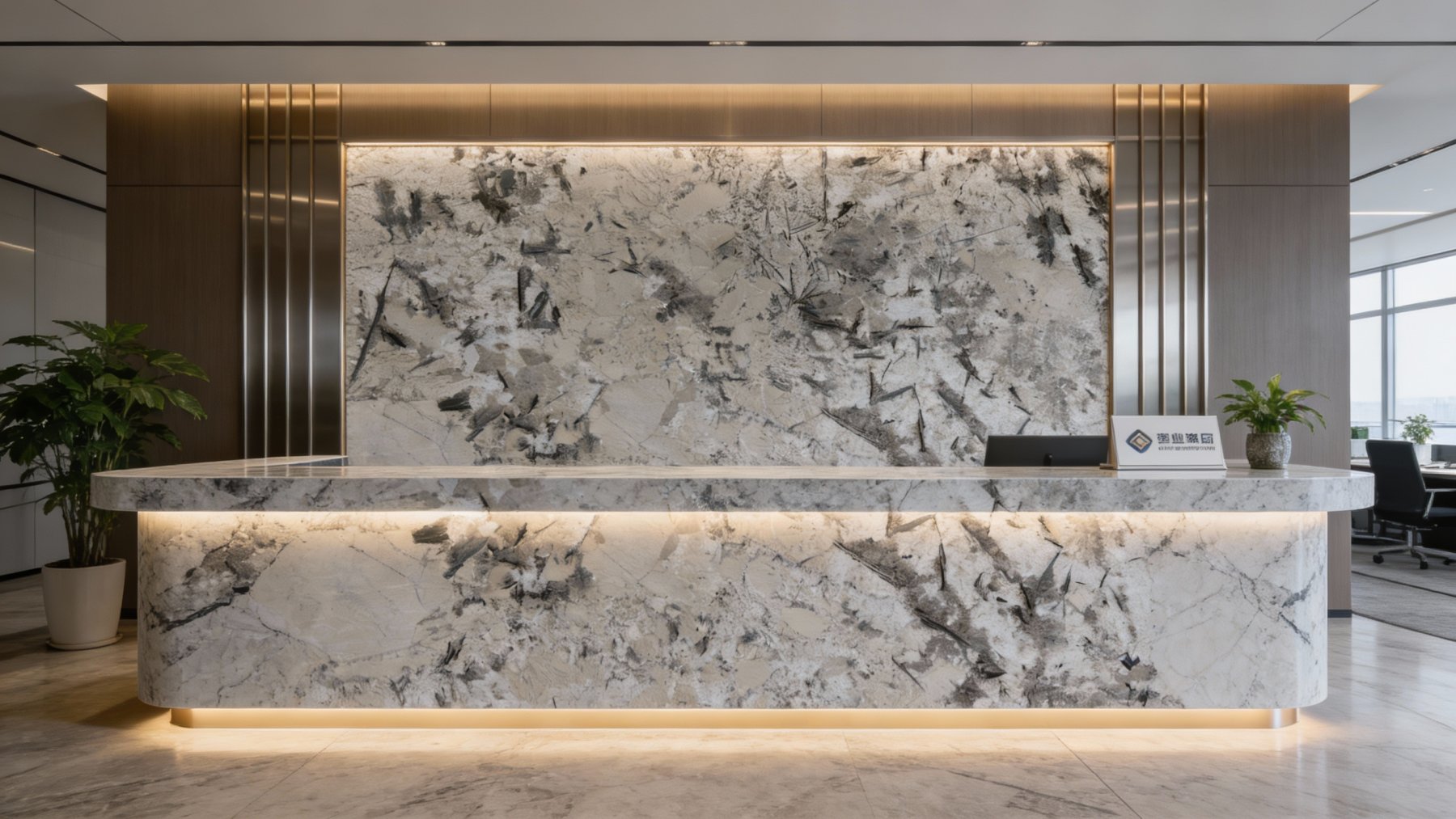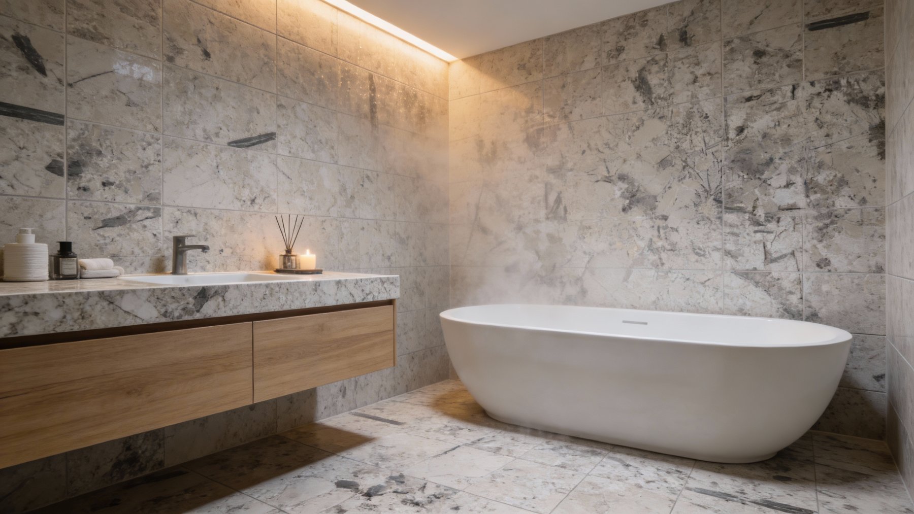 这款石材的底色基调为**浅米灰色**,整体色调柔和雅致:浅米的暖调赋予空间明亮通透的轻盈感,而融入的细腻灰度则中和了浅色系的单薄,注入沉稳内敛的气质,形成温润舒适又不失质感的视觉基底,适配多种风格的空间氛围。