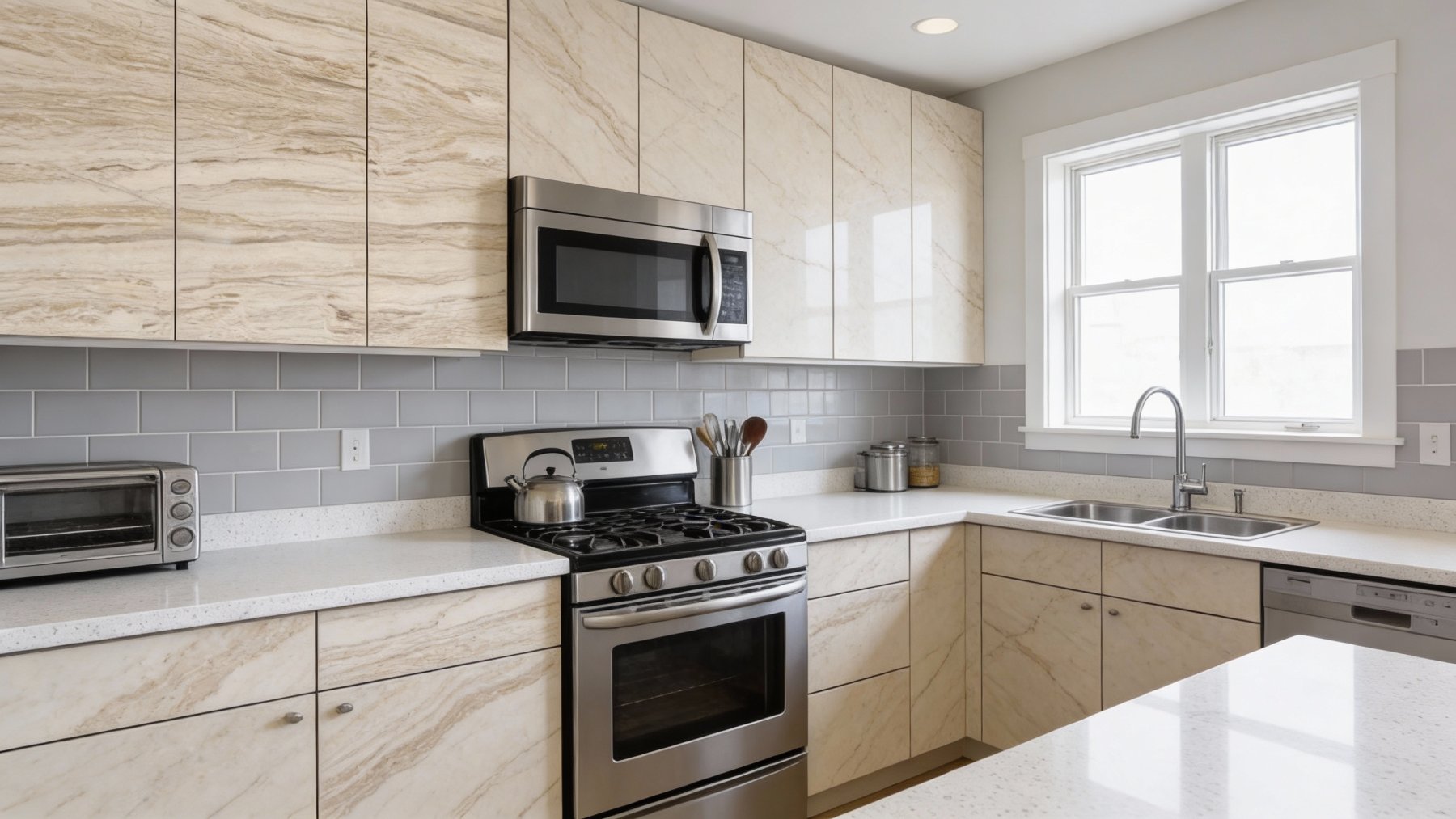 质感细腻温润,表面带有天然石材特有的柔和光泽(非高光),触感应是平滑顺滑的。纹理间的色彩过渡自然细腻,细微处可见深浅褐纹的交织与晕染,无生硬边界;偶有极淡的色差斑点点缀其间,尽显天然石材的肌理层次,既保留了自然造物的真实感,又传递出雅致内敛的质感,仿佛历经岁月打磨的温润玉石,兼具美观与质感。