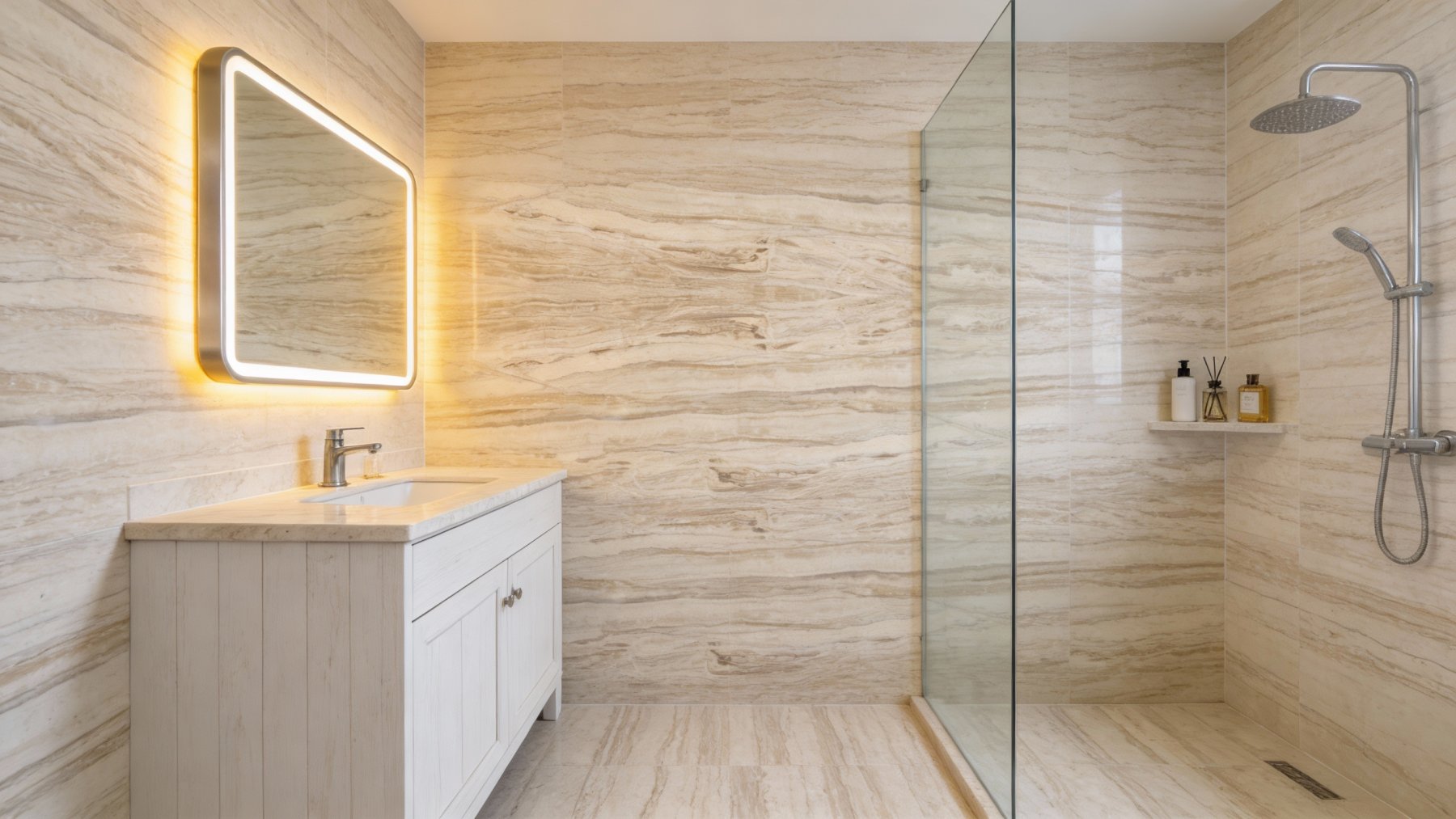 纹理呈现自然流畅的层状波浪形态,深浅不一的暖褐色条纹交织其中——浅褐如薄雾般轻盈,深褐似焦糖般醇厚。线条如流水般婉转起伏,既有水平延展的规律感,又不失自然的灵动变化:时而宽幅舒展,时而细密蜷缩,层次错落有致,仿佛时光沉淀下的地质脉络,赋予石材生动的流动韵律。