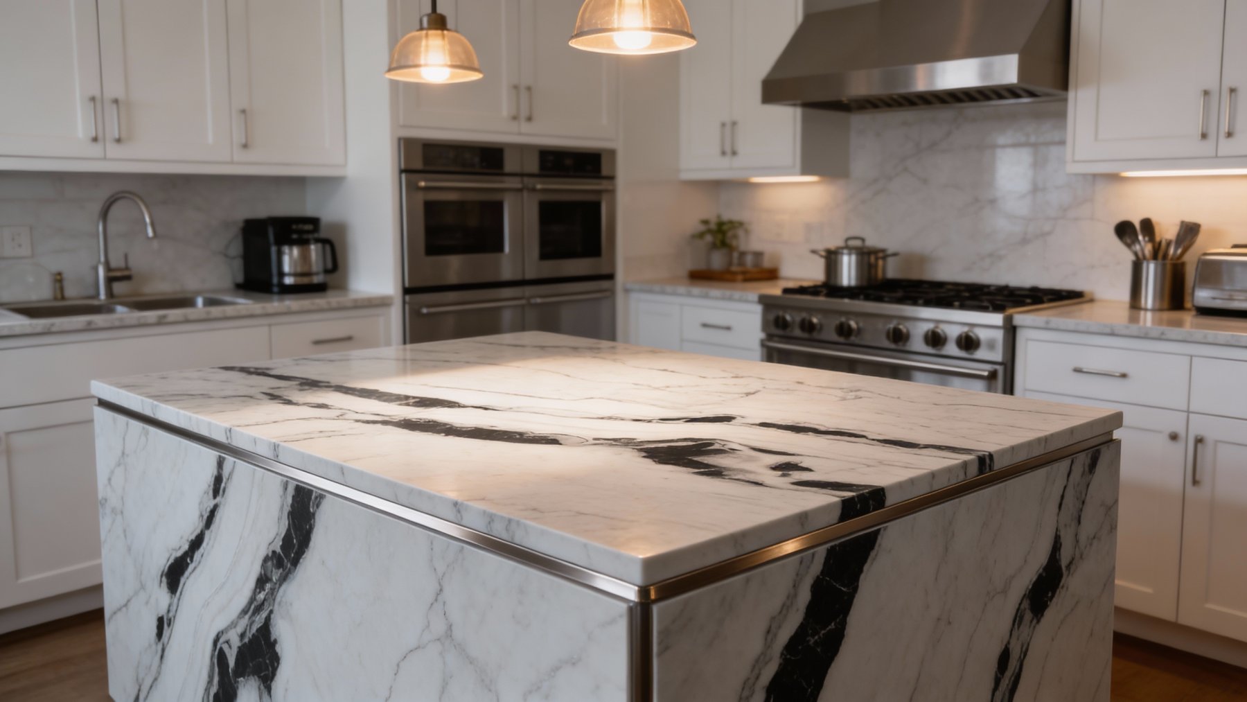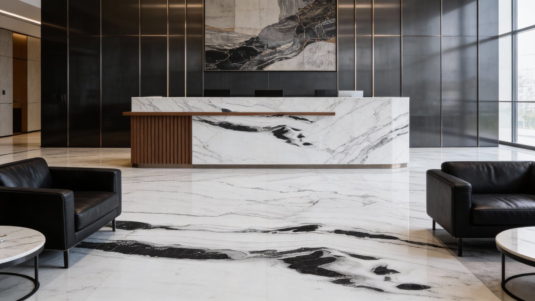 从细节质感看,石材表面经精细抛光处理,**触感顺滑如丝**,光泽柔和温润,呈现出内敛的镜面效果(非高光刺眼型)。