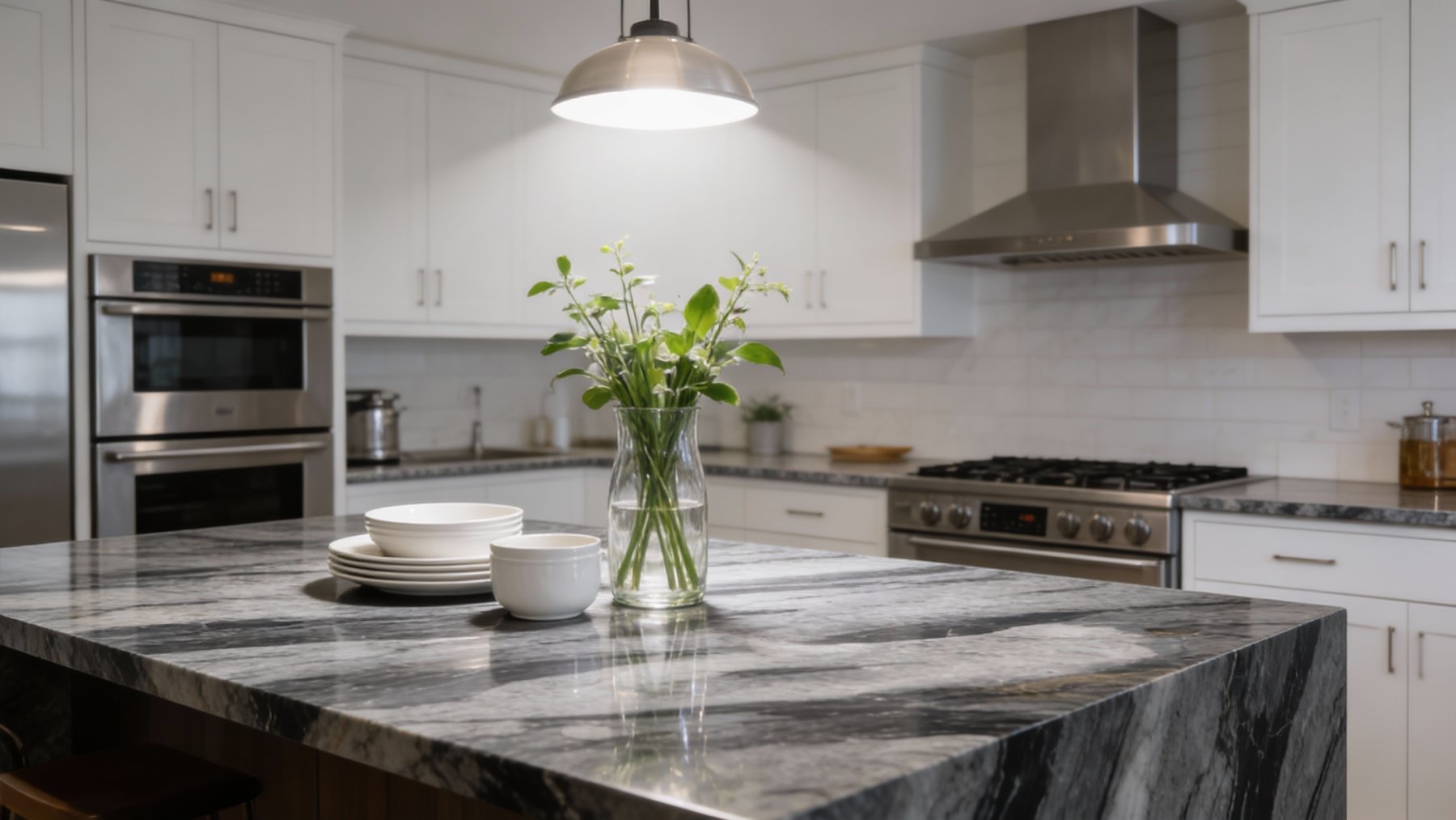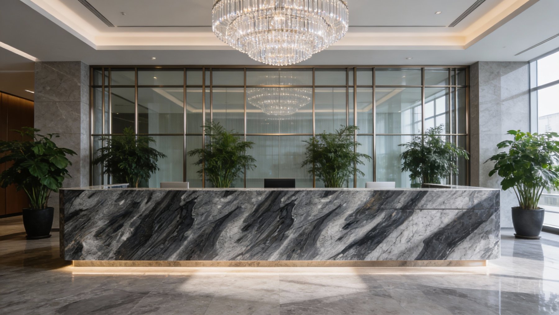 表面兼具**细腻光滑的触感与层次丰富的视觉肌理**:抛光处理后,基底呈现温润细腻的光泽,而纹理处的深浅变化则带来细微的视觉凹凸感。纹理边缘过渡柔和,深浅色块间的晕染自然不生硬,细微处可见矿物质沉淀的内敛光泽——既保留了石材原生的坚硬质感,又因纹理的灵动性增添了雅致柔和,触目所及皆是低调奢华的高级感。