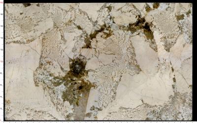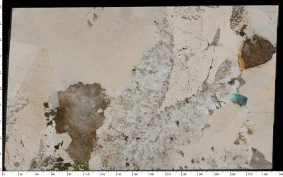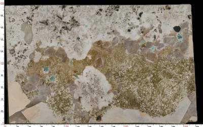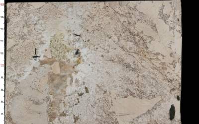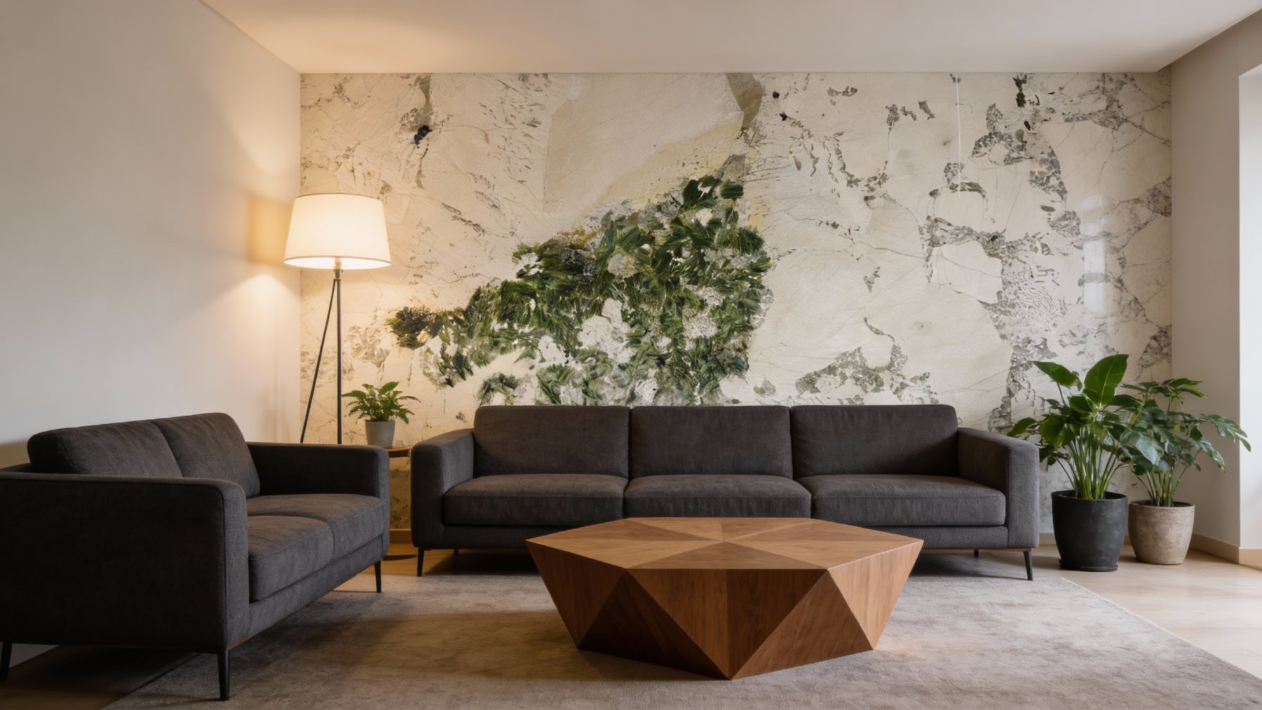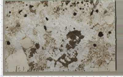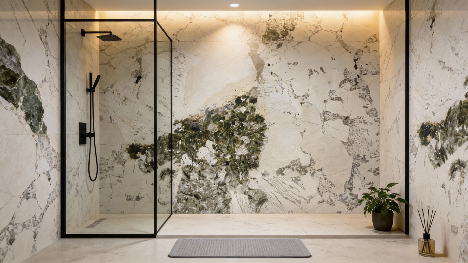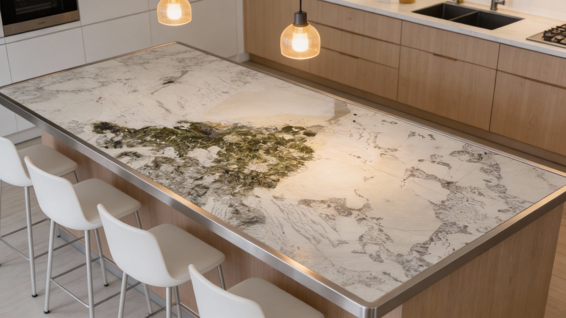 纹理呈现**“有机共生”的自然形态**:中央区域分布着不规则的深绿色纹理团块,形态类似苔藓、蕨类植物的脉络或矿物结晶簇,线条舒展且富有生命力;周围环绕着细碎的浅灰或白色石纹脉络,与绿色团块相互交织、过渡自然,形成层次分明的“主纹+辅脉”结构,无刻意规则感,尽显天然石材的随性野趣。