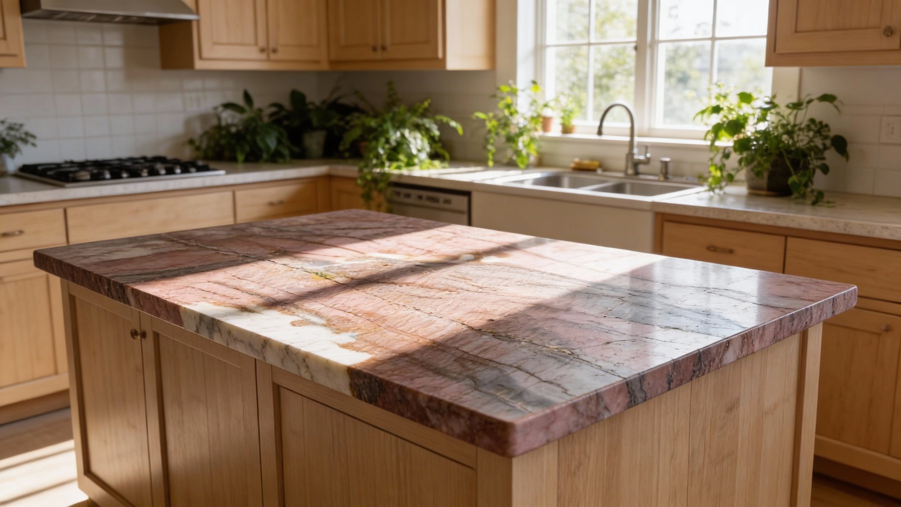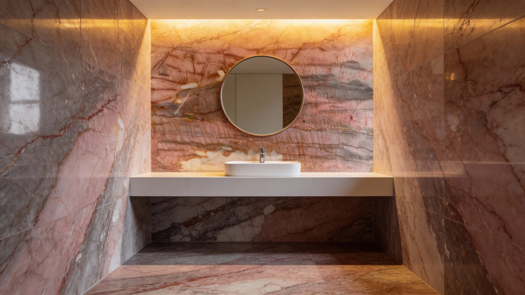 这款石材的底色基调以**暖调粉棕渐变**为主,上部与中部呈现柔和的浅粉褐质感,色调温润雅致;下部则自然融入不规则的奶白色斑块,粉棕与奶白之间过渡细腻,既保留了石材天然的厚重感,又因粉棕的暖调削弱了冷硬气息,整体底色层次丰富且氛围柔和。