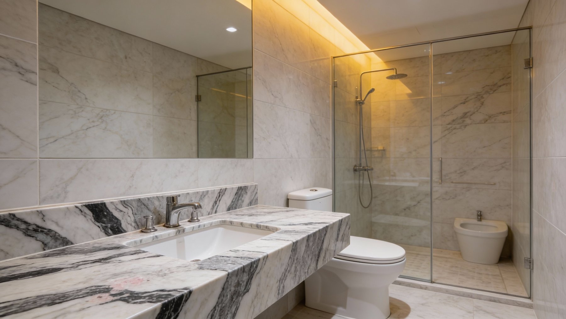 以柔和浅灰色为基底,间杂淡米白与暖灰褐色调,整体色调温润雅致——既保留了石材的沉稳质感,又因暖调的融入而避免了冷硬感,给人舒适放松的视觉感受。