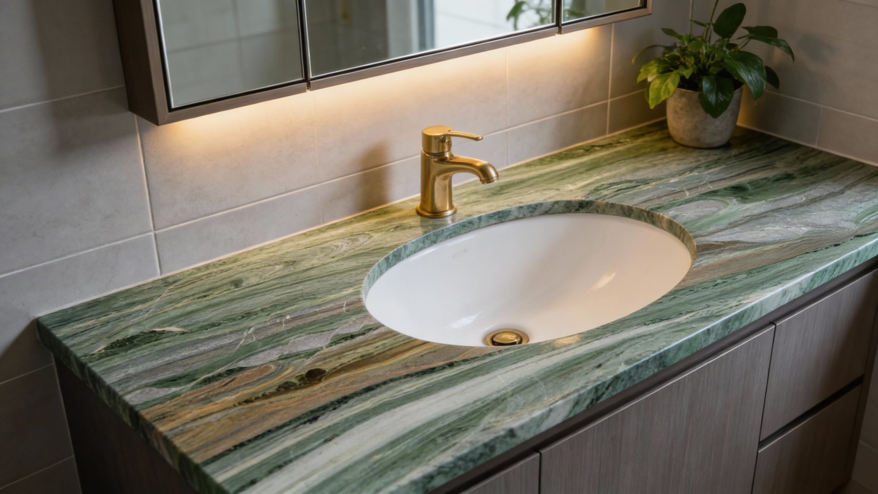 这款石材的底色基调以**多层次绿色系**为核心,融合浅灰绿、墨绿与淡青色调,其间穿插温润的米白、浅灰及少量暖棕色块。整体色调柔和且富有自然渐变感,沉静的绿色系奠定了雅致基调,暖棕元素的点缀又增添了一丝温润暖意,既保留石材的自然质感,又避免了单调。
