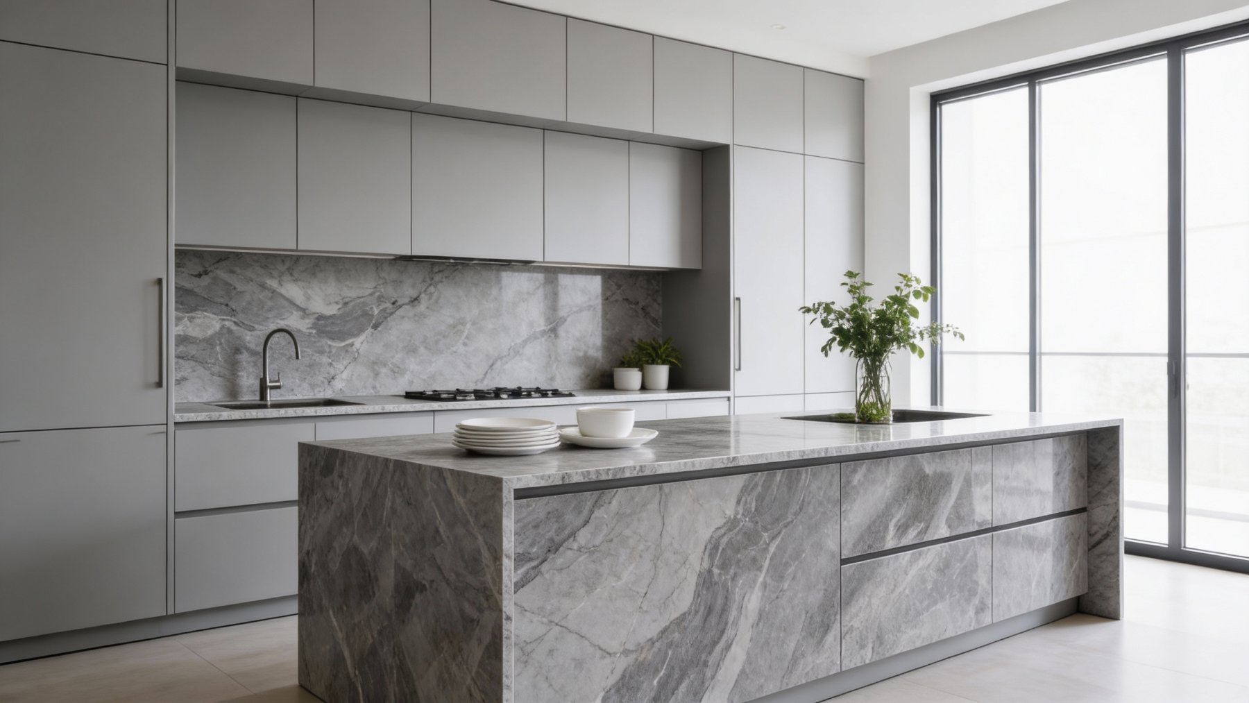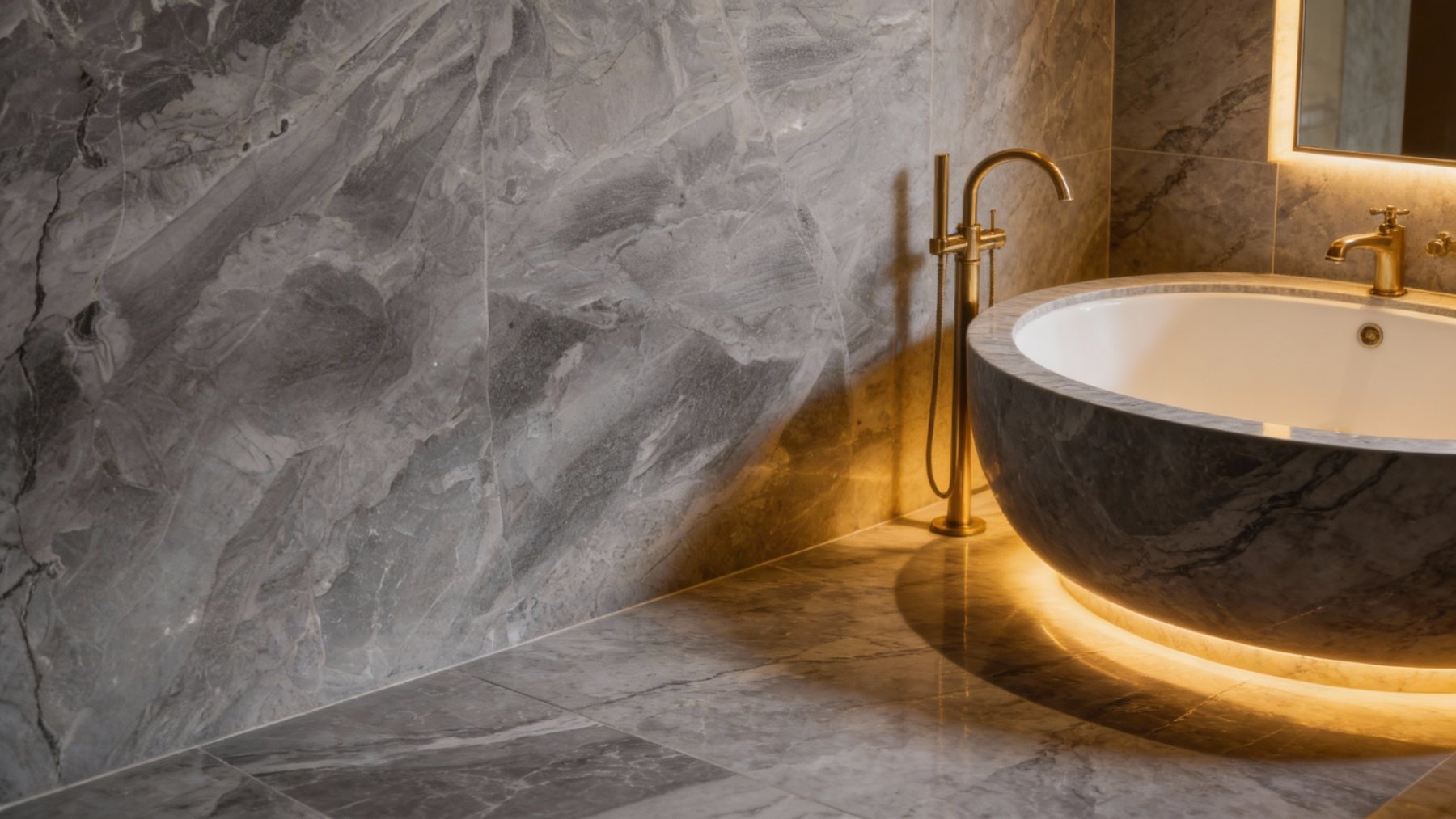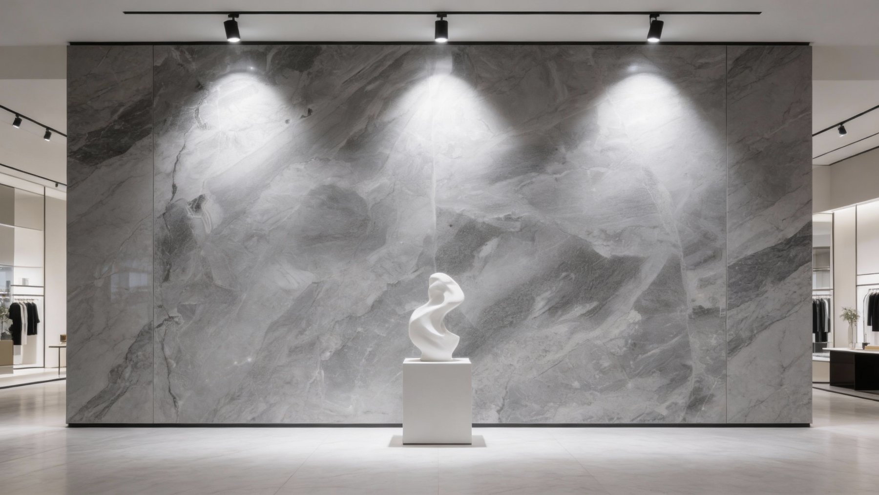 表面质感**细腻温润**,触感应是平滑且带轻微柔光效果的。纹理间过渡自然无生硬边界,仔细观察可见细微的色泽变化与颗粒状肌理点缀——既保留了天然石材的质朴感,又通过精致处理呈现出现代精致度。光线照射下,不同角度会折射出微妙的光泽层次,让整体质感更显立体鲜活。
