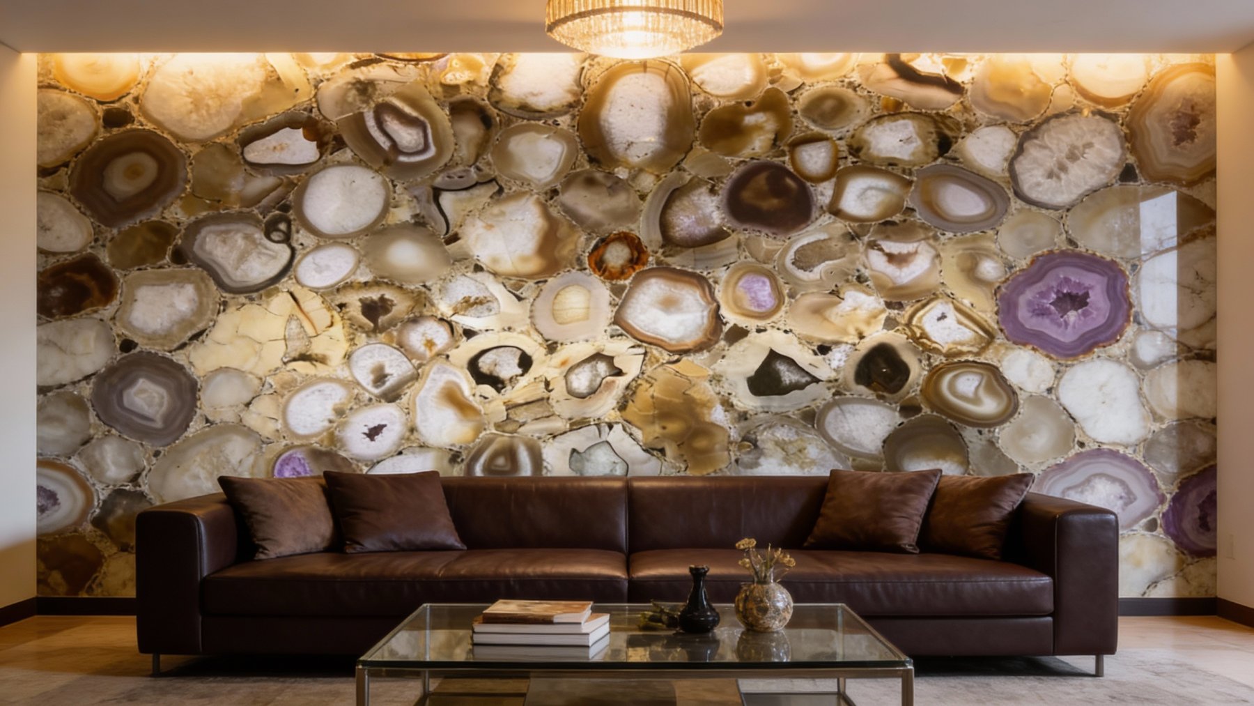 纹理呈现**同心环状与不规则斑块交织**的独特形态:大量圆形/椭圆形“石眼”结构错落分布,环纹由棕褐、灰白、淡紫等色彩层叠构成,如同玛瑙缠丝般细腻;同时夹杂絮状、脉络状自然纹理,布局疏密有致——既有环状纹理的规律感,又有斑块交织的随性,仿佛地质作用下溶洞钟乳或古生物化石的自然印记,层次丰富且充满故事感。