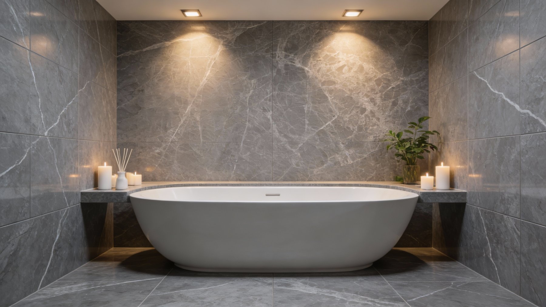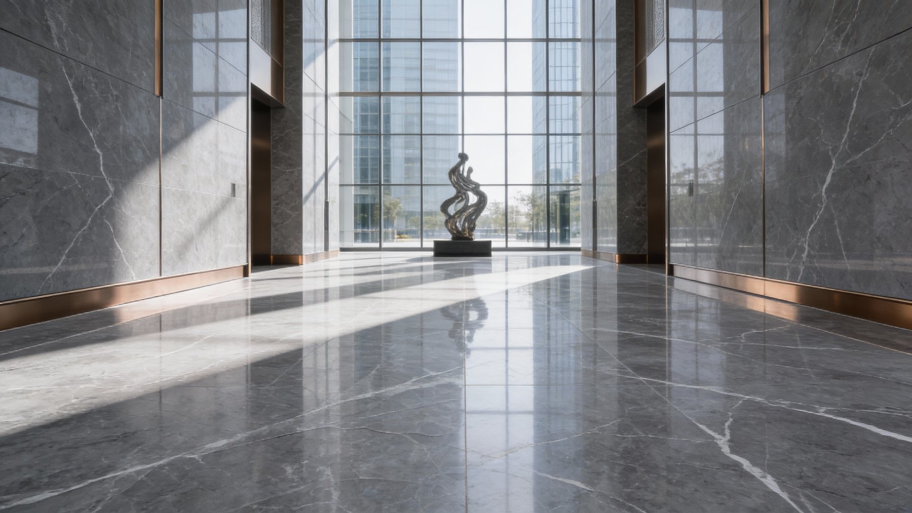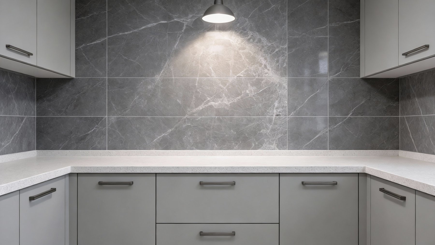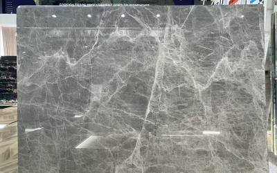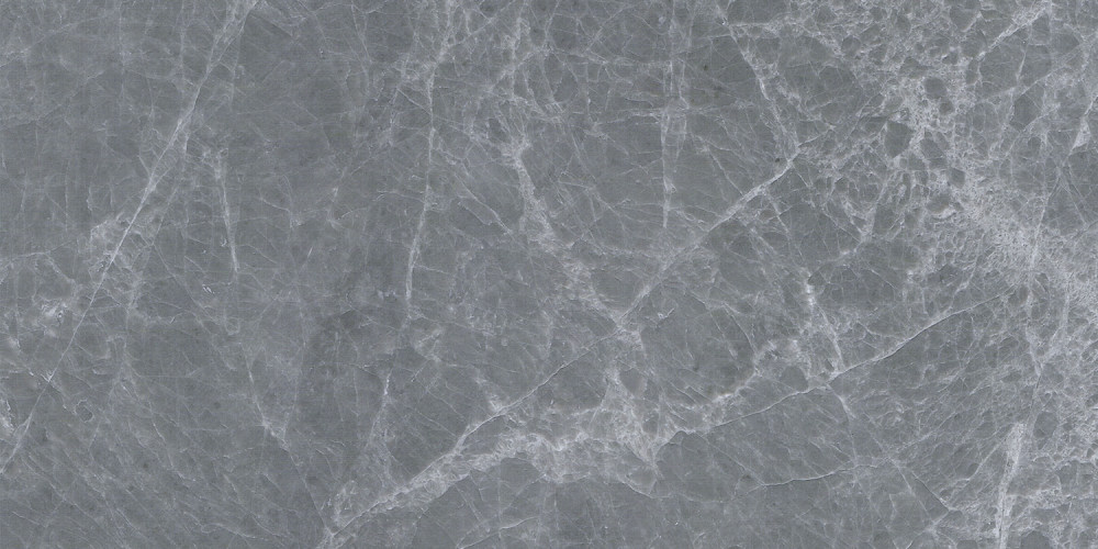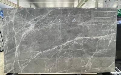 表面呈现**细腻温润的石材质感**:底色部分带有肉眼几乎不可见的细微颗粒肌理,触感应是平滑凉润的;白色纹理则显得更为通透,与灰色底色形成柔和却清晰的对比,光线照射下隐约透出细腻光泽,既保留了天然石材的粗犷张力,又兼具工艺打磨后的精致感,整体给人高级、冷峻且富有层次的视觉体验。