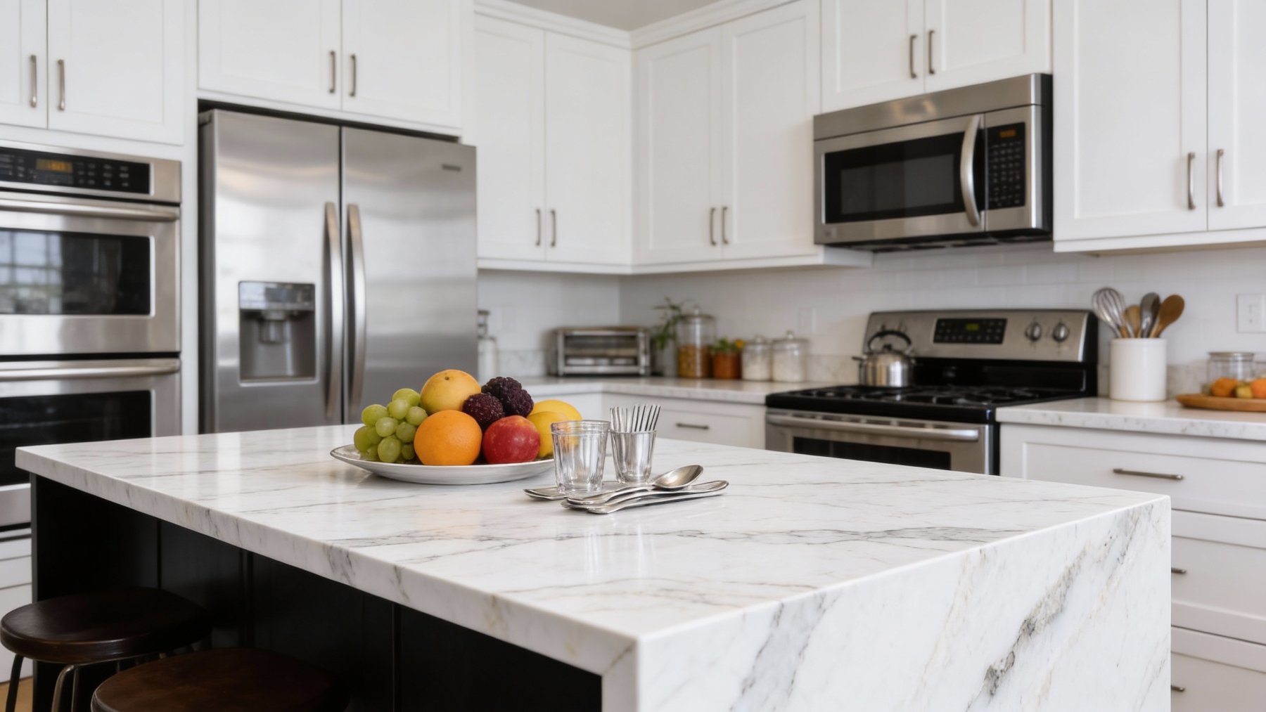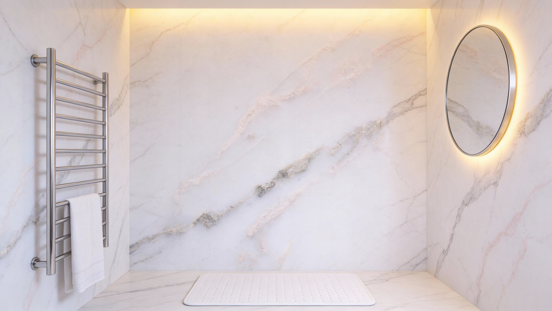 这款石材以**纯净柔和的暖白色**为基底,色调温润不刺眼,似清晨薄雾中的初雪般清透,又带着天然石材特有的凝脂质感,既保持了白色系的明亮通透,又避免了冷白的生硬感,为空间营造出清新雅致、开阔舒适的氛围基调。